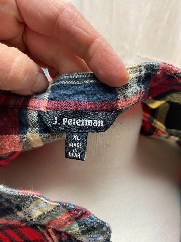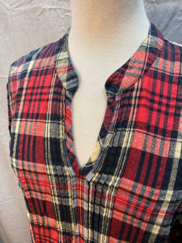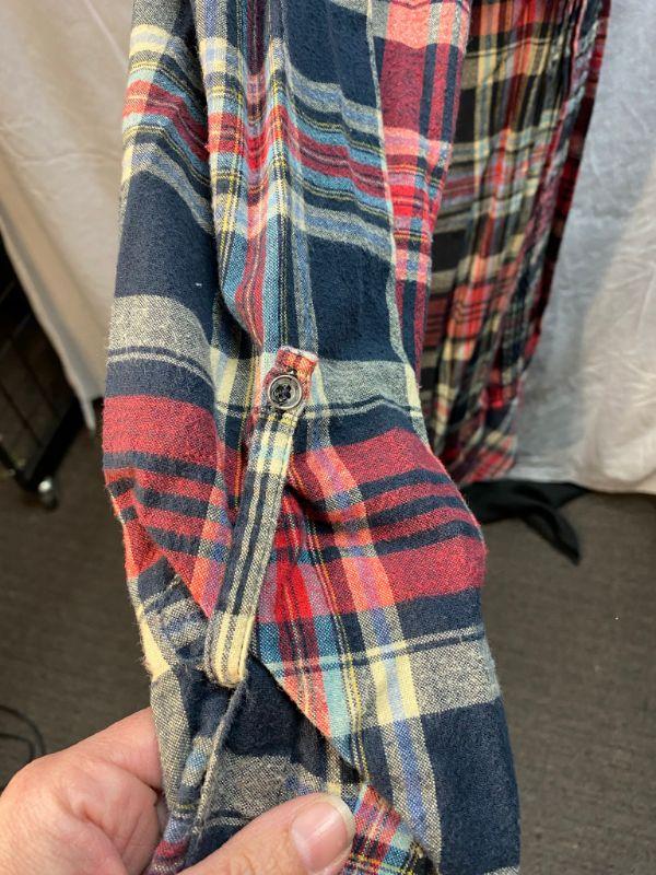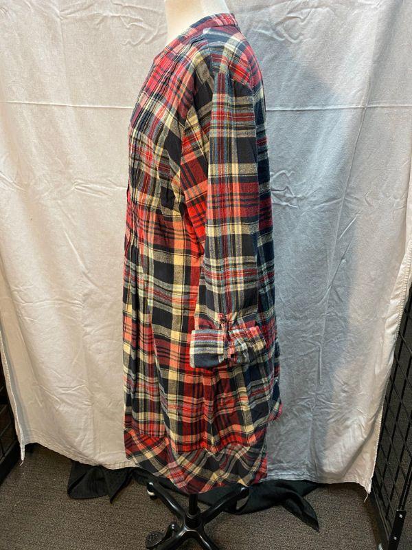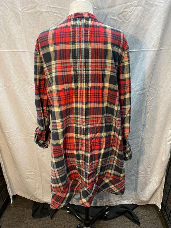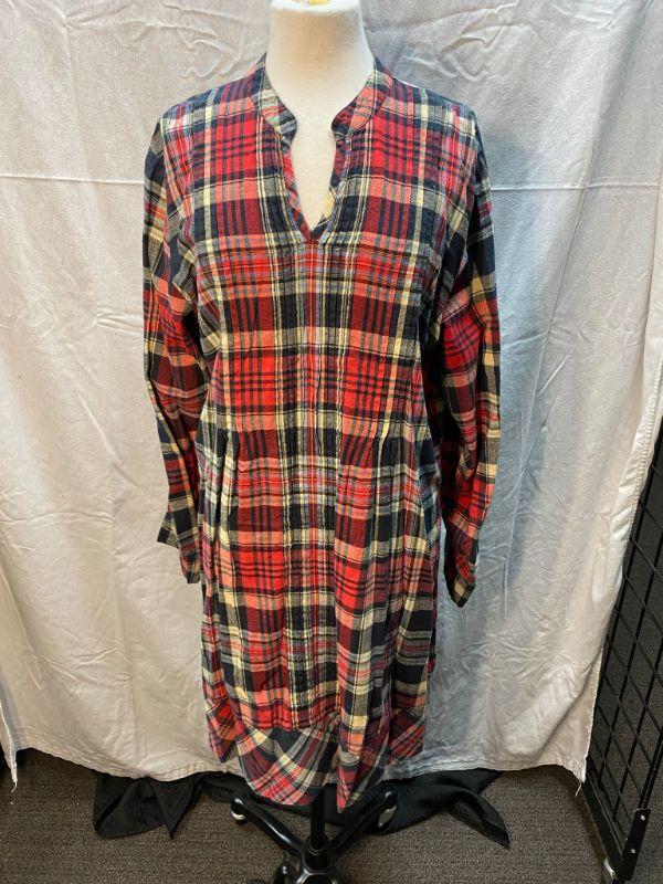 J. Peterman plaid flannel dress. Red & blue plaid. Wear as a dress, or loungewear around the house. Rollable sleeves. Below the knee length. Good condition. Size XL.