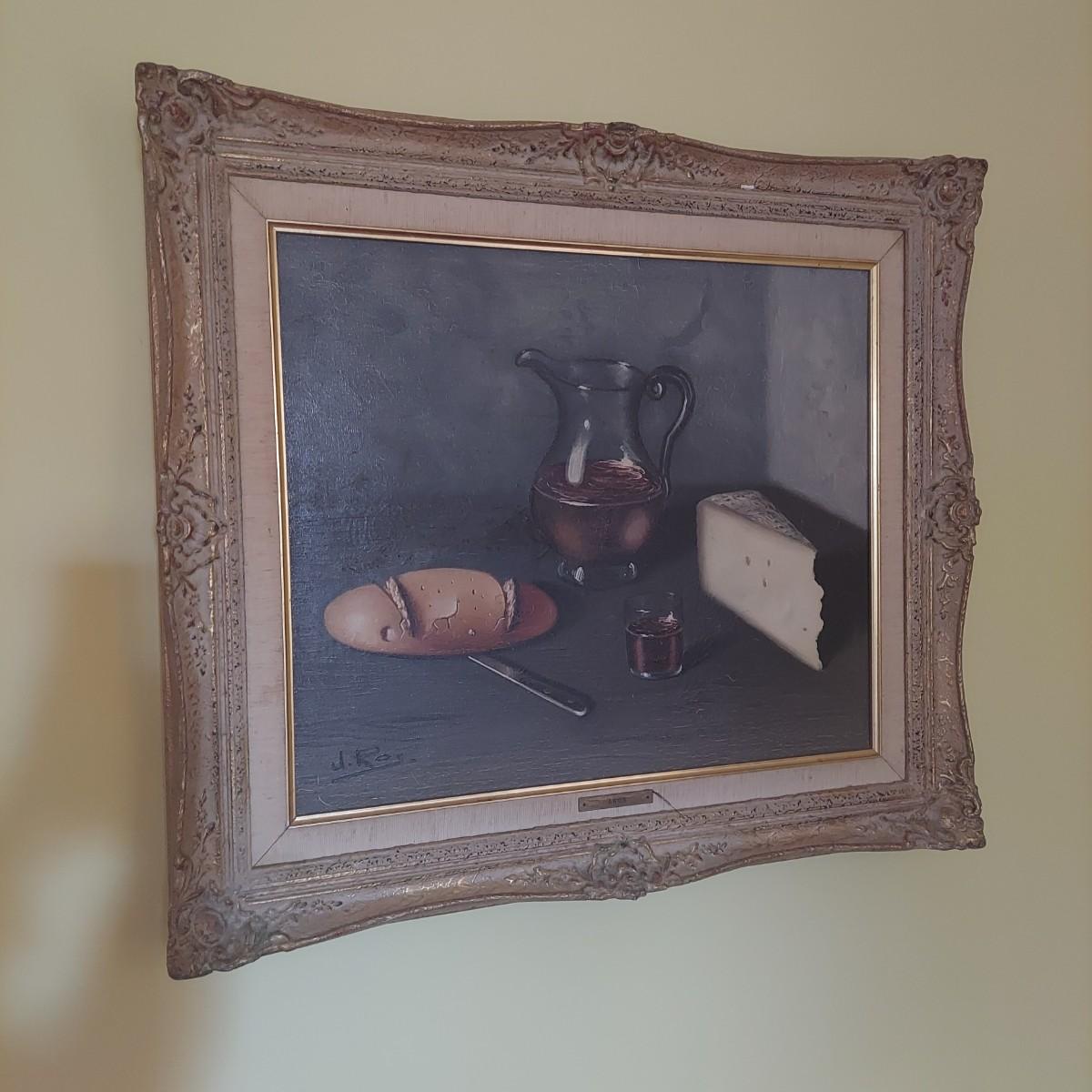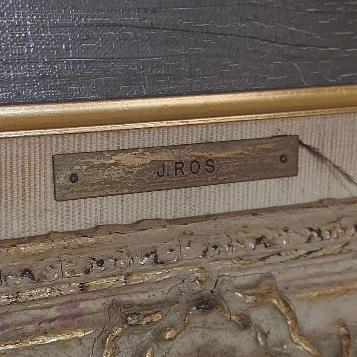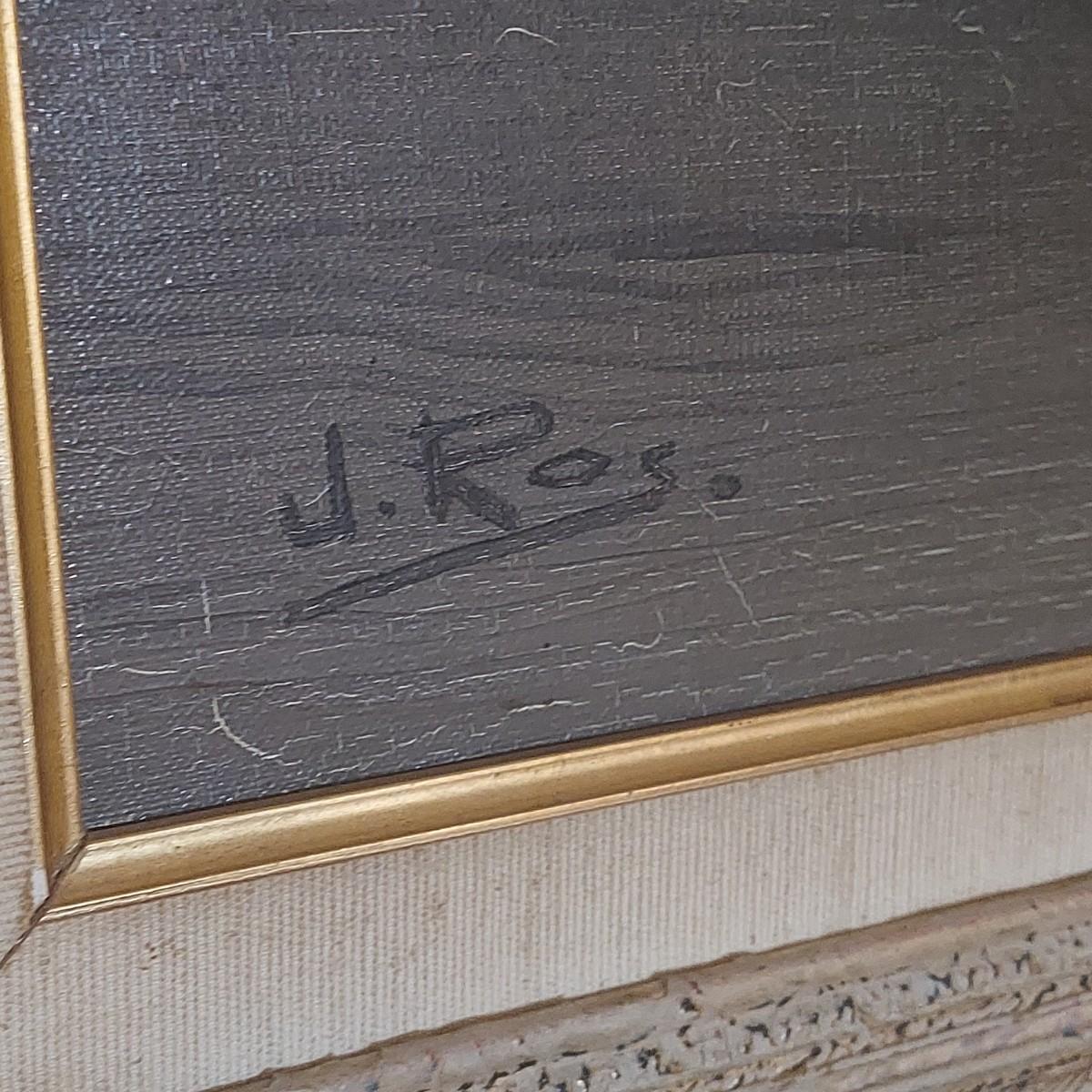 Original still life painting in carved wood frame. Appears to be oil on canvas. Some cracking. Back shows where it was cleaned and resealed in 1983. Frame measures approximately 29" x 25"H. Signed J. Ros. Shipping available. Shipping certain items can be costly. We suggest contacting our preferred local shipping provider, Postage Express, with dimensions and getting an estimate before bidding: (828) 670-5501 or postageexpress@yahoo.com.