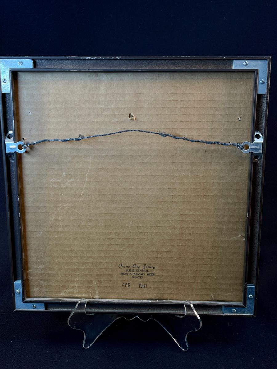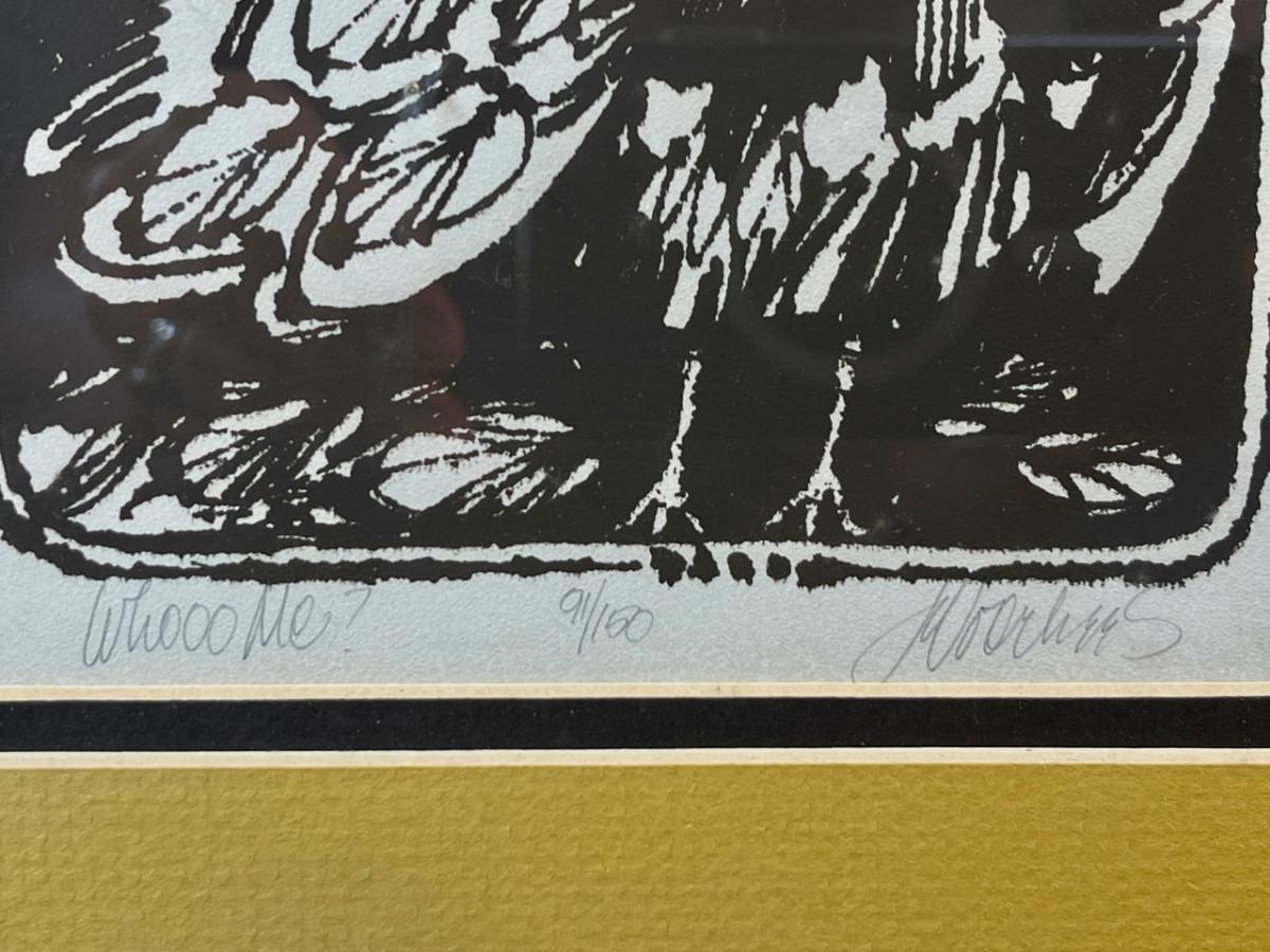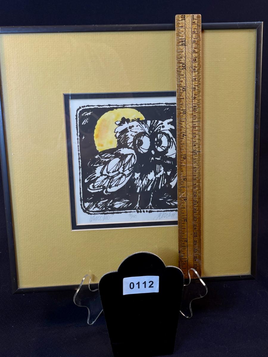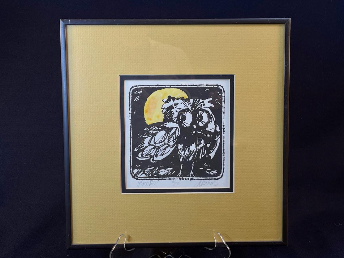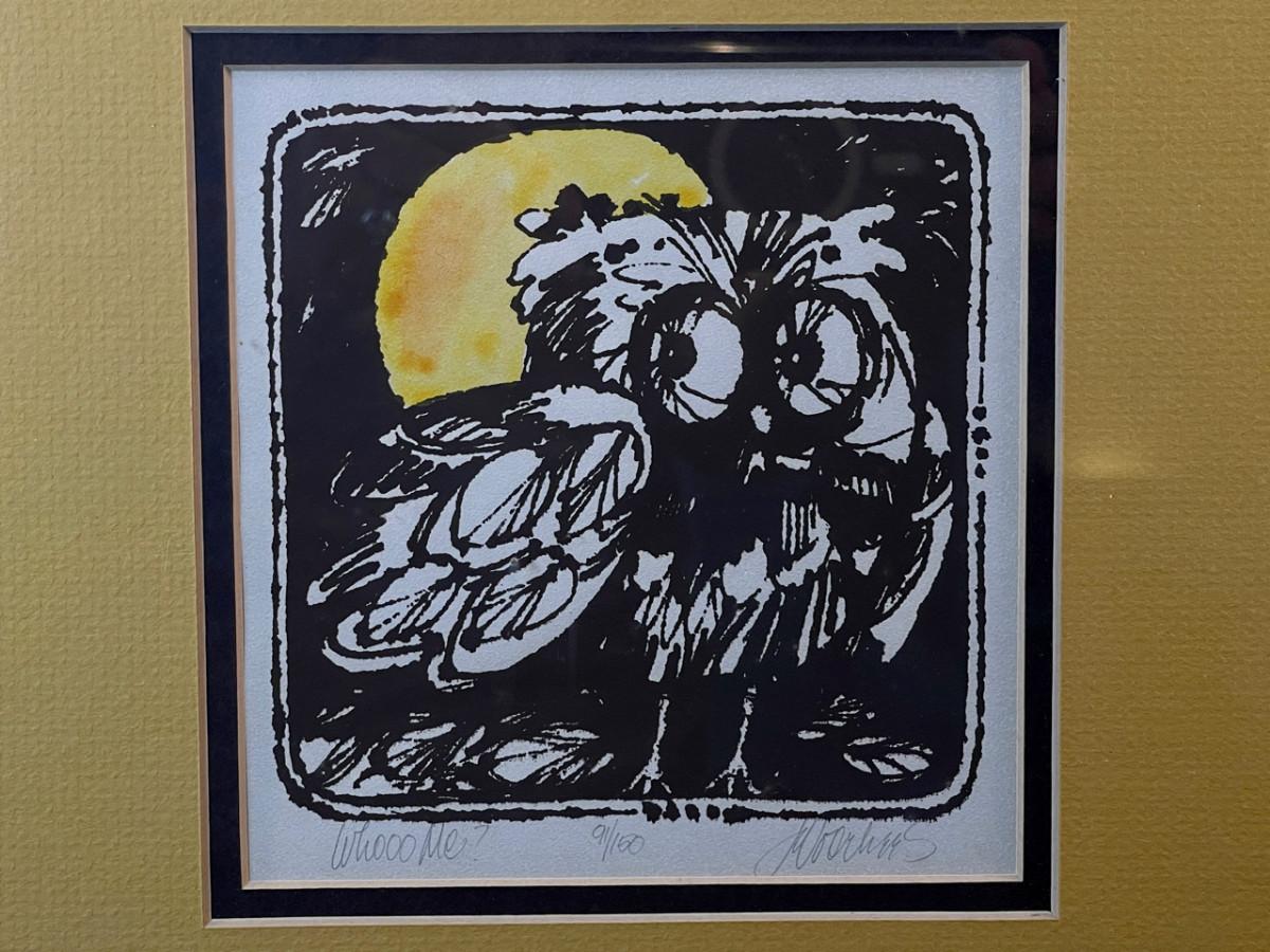 The subject item is an original block print by J Voorhees, known for his owl subject matter passion. Here is featured a charming Mid Century Modern small owl with big eyes posed in front of a full harvest moon. This contemporary rendering is both numbered (91/150) and signed by the artist on the bottom margin. Titled “Whooo Me?” Nicely double-matted in a satin black metal frame under plexi/glass.