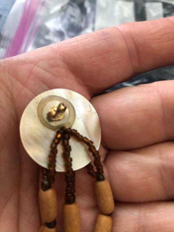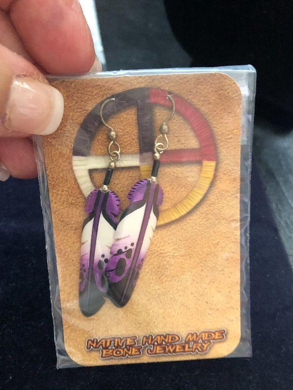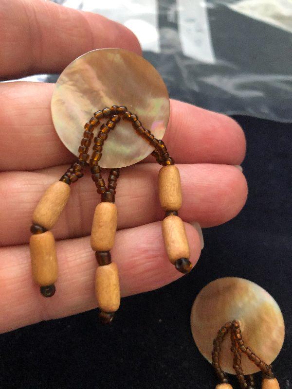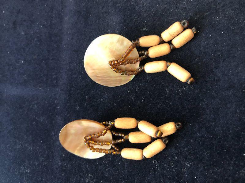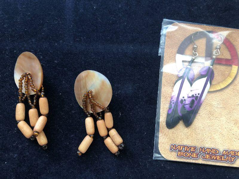 Native American hand made feather earrings, and shield type earrings with bead dangles.