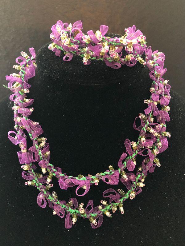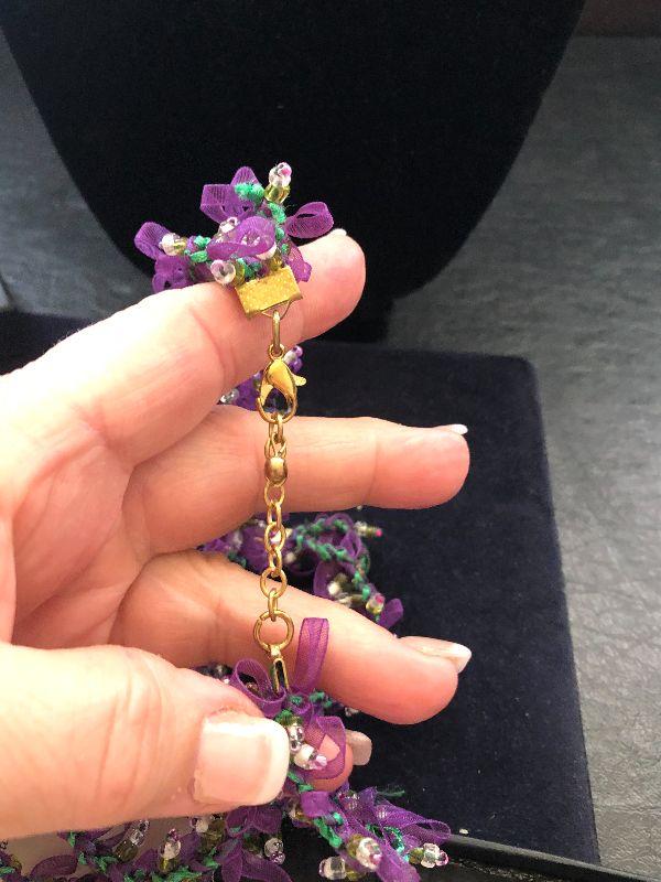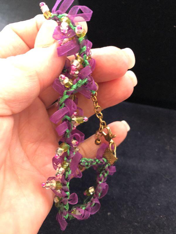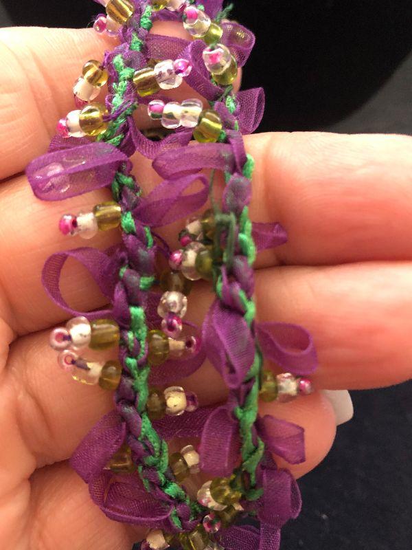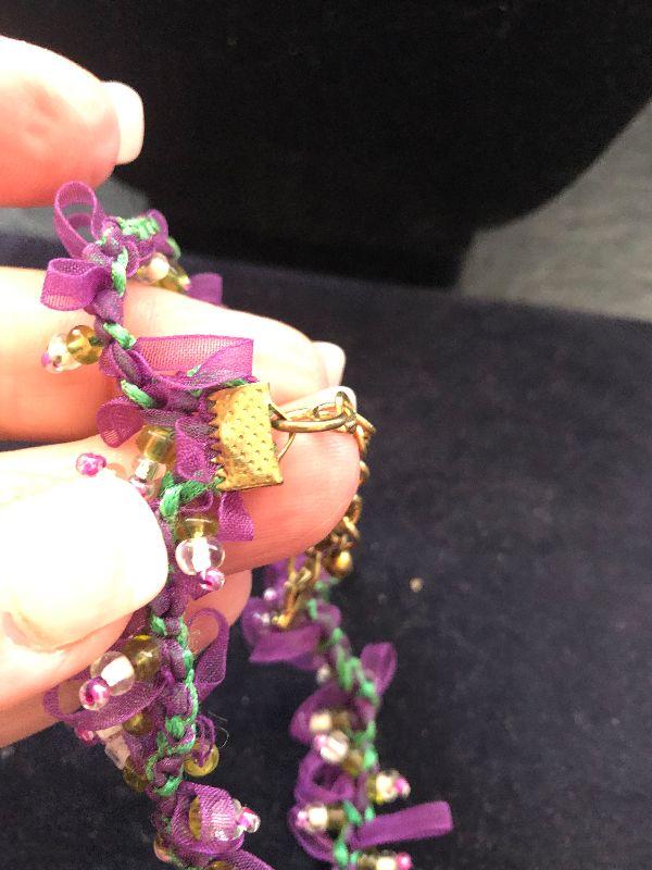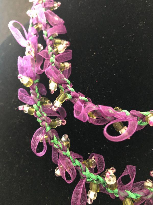 Very girlie girl necklace with ribbons twined thru out and gold tone beads