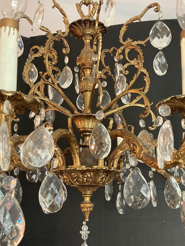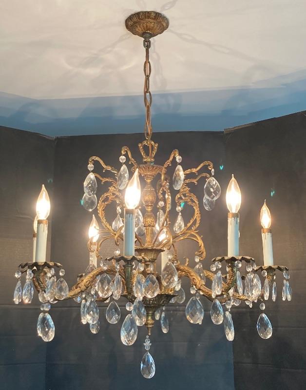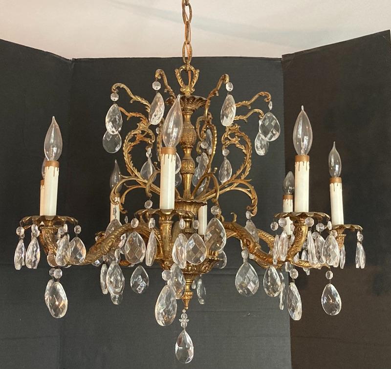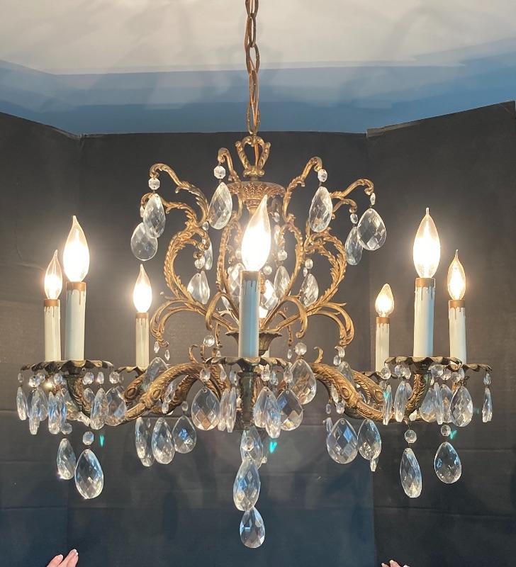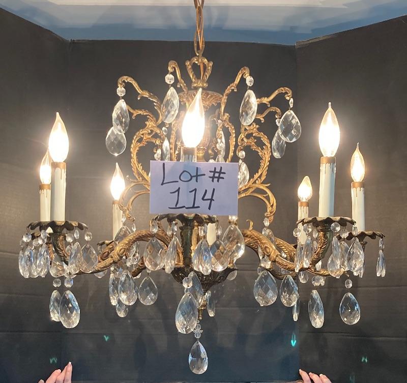 Brass and Crystal Chandelier has eight arms and 89 prisms. Measures 38” tall and 29” circumference