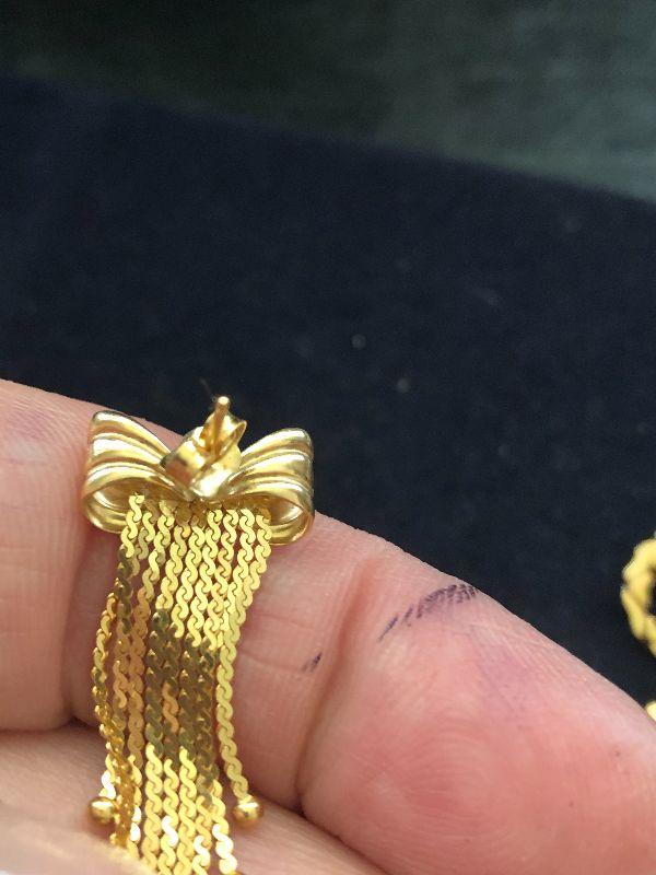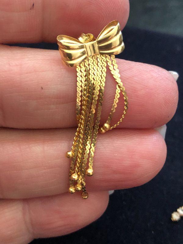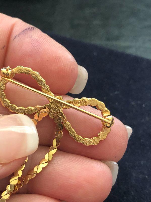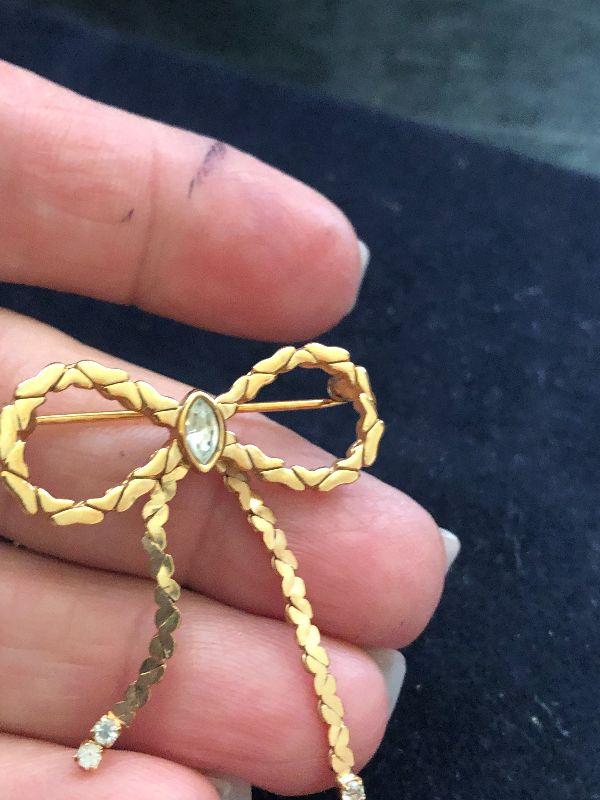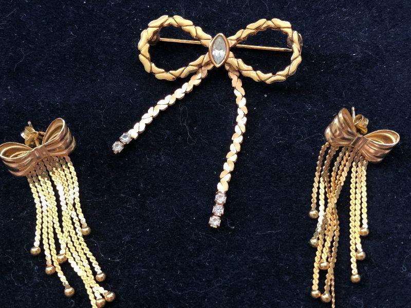 Avon gold tone ribbon pin with faux diamonds. Also, gold tone ribbon earrings.