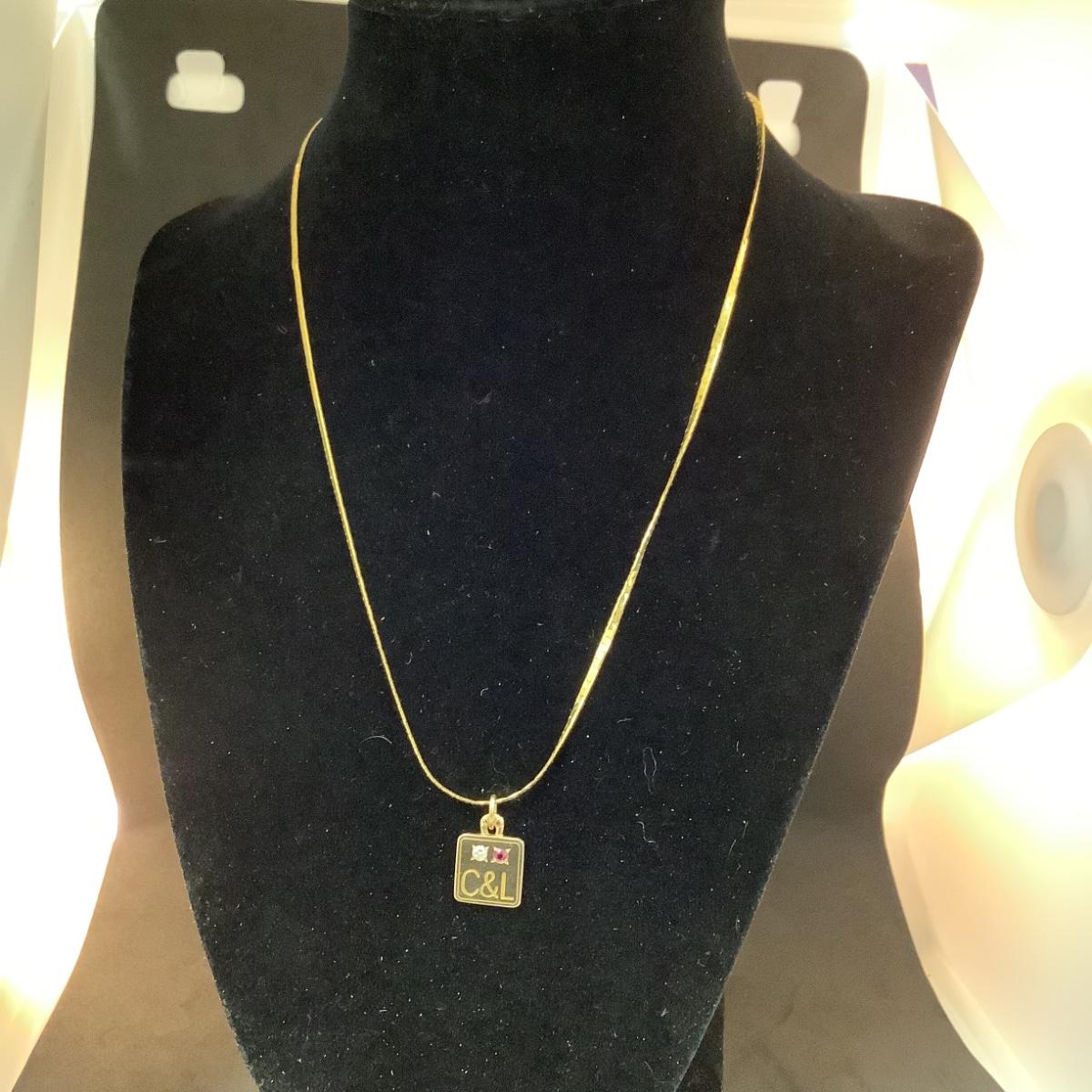 Necklace weighs 3.6 grams and pendant weighs 2.2 grams with "C&L" and one ruby and diamond stone set in pendant