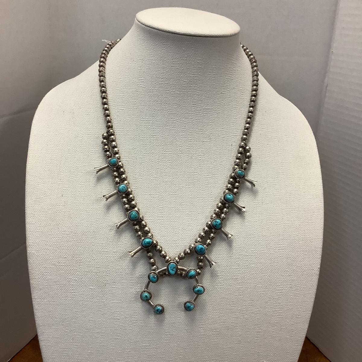 J1315 Vintage Sterling and Turquoise Squash Blossom Necklace