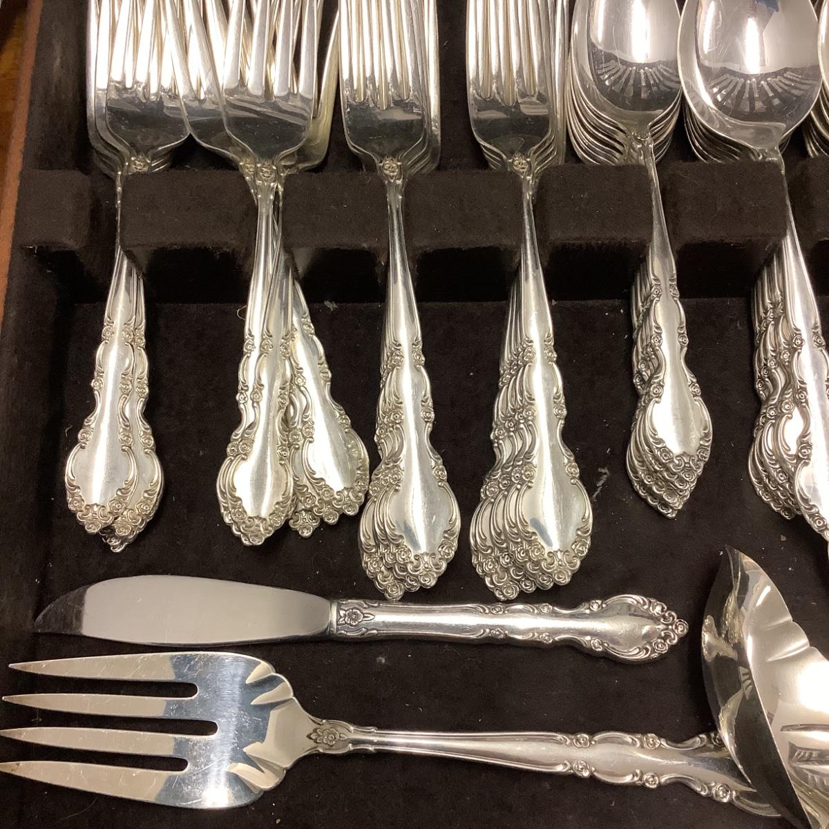 2 large serving spoons, 1 sugar spoon, 12 soup spoons, 17 teaspoons, 12 dinner forks, 12 salad forks, 12 dinner knives, 1 gravy ladle, 1 serving piece, 1 butter knife, 1 meat fork, 1 3 prong fork , 1 teaspoon, 2 old serving spoons