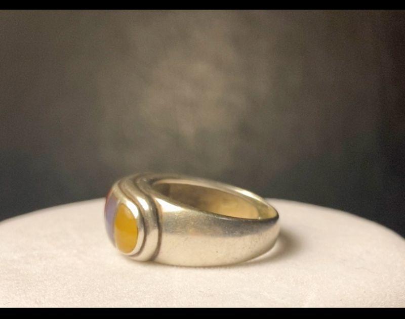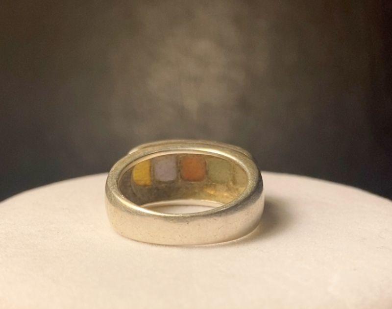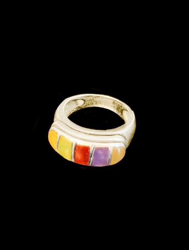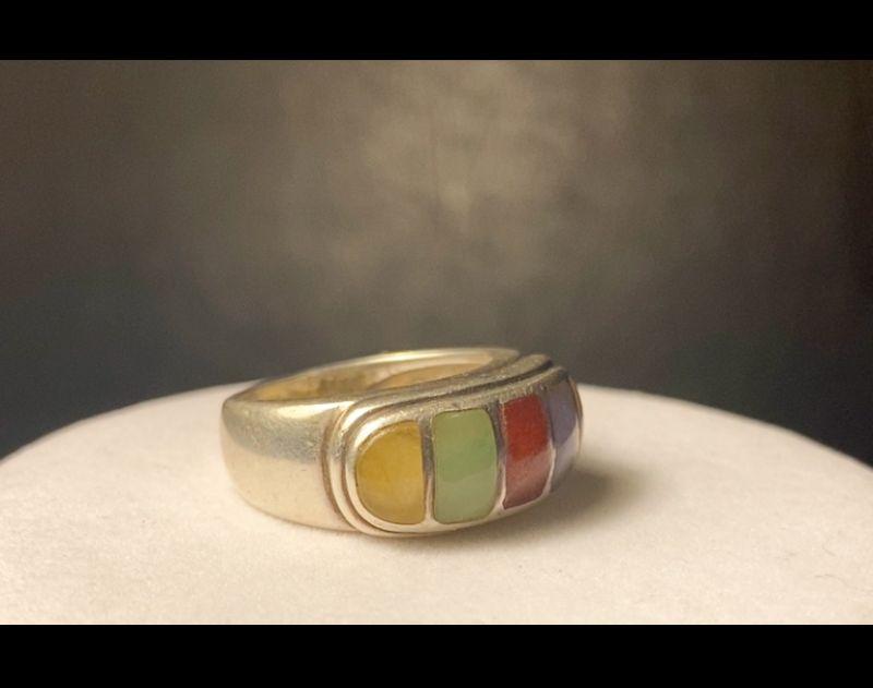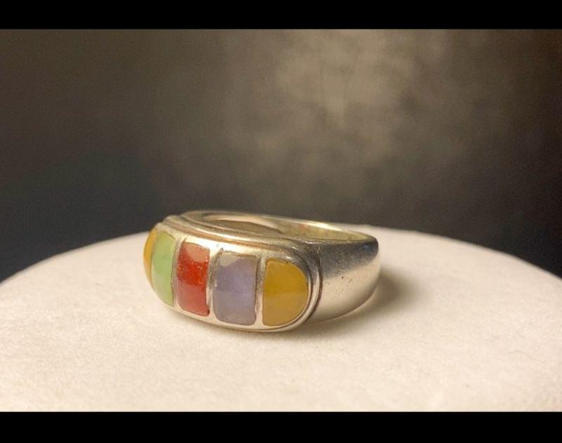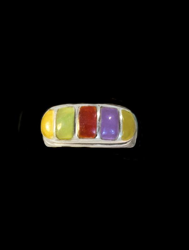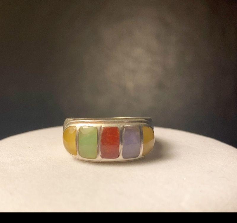 Sterling silver ring with inlaid, multi colored stones. Size 7.