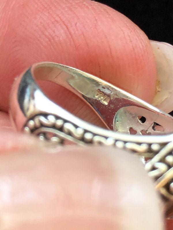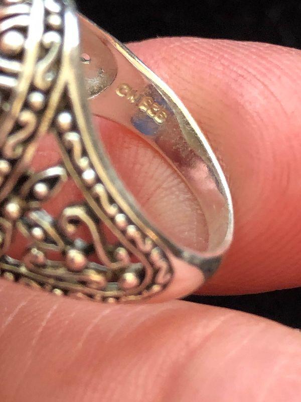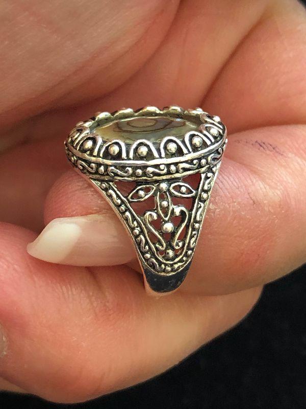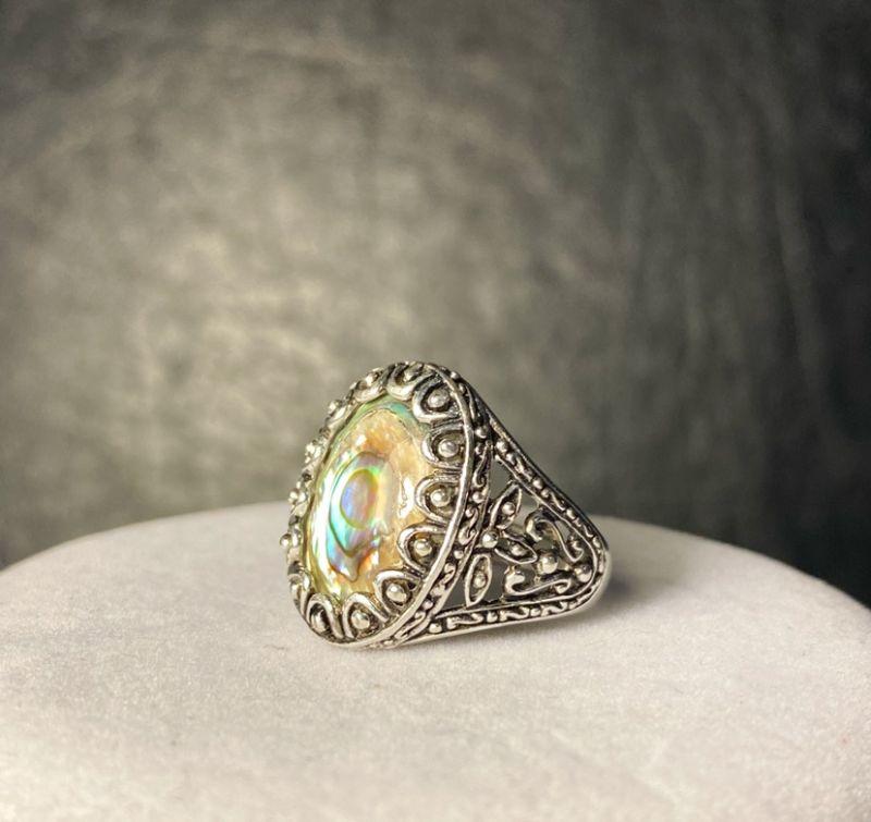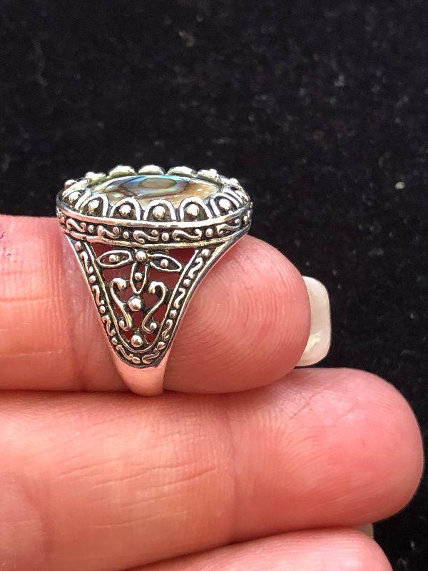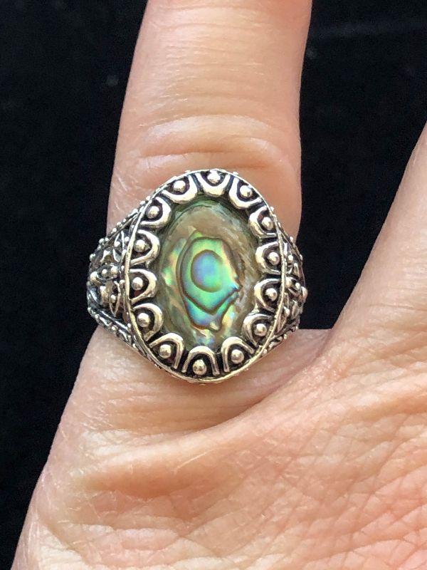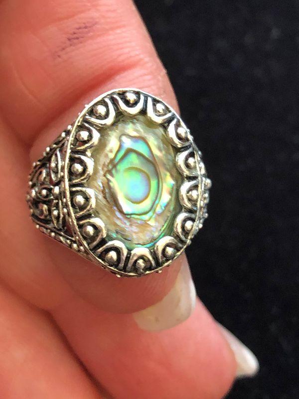 Abalone shell set in filigree, sterling silver ring. Unusual and very pretty.