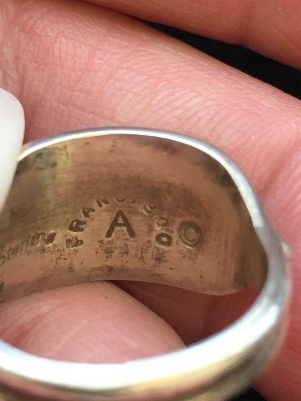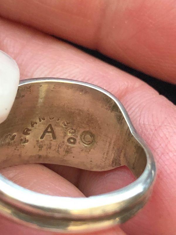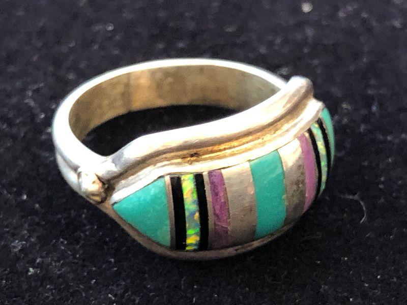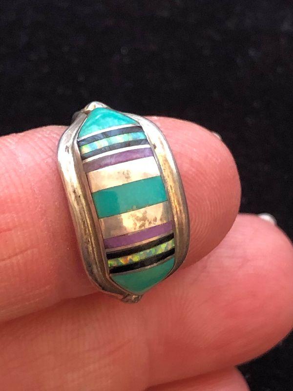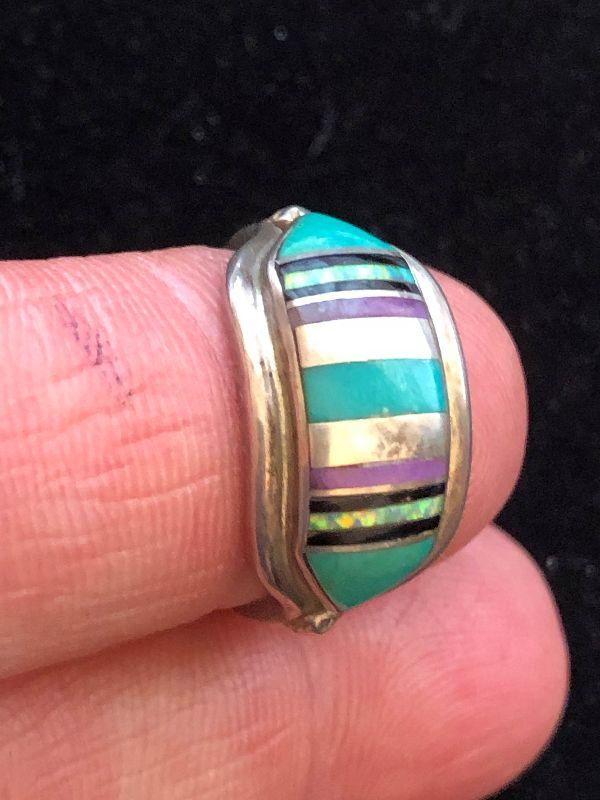 Size 7 sterling ring with inlaid turquoise, onyx and amethyst.