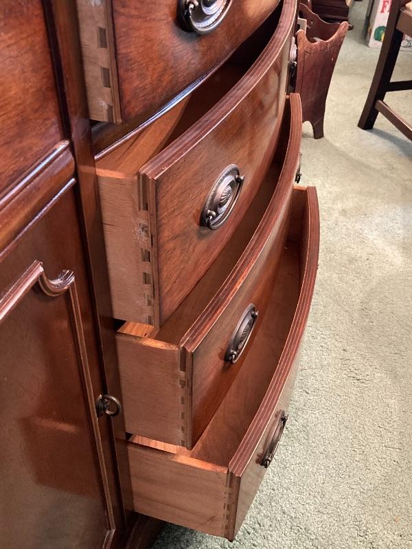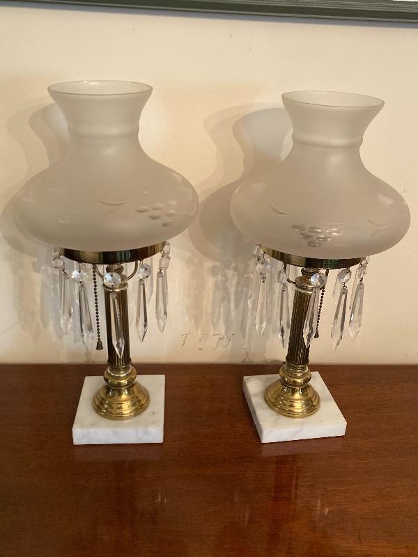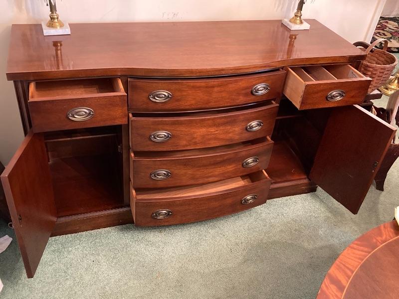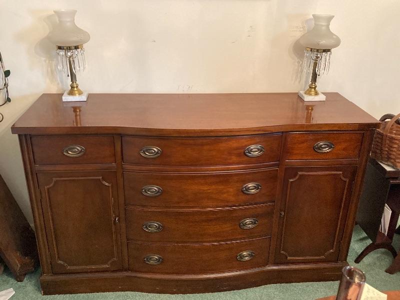1940’s eight drawer mahogany sideboard measuring 58” long 33” high and 19.5” deep, pair of brass and marble chimney prism lamps, one lamp has a damaged shade (see photos),