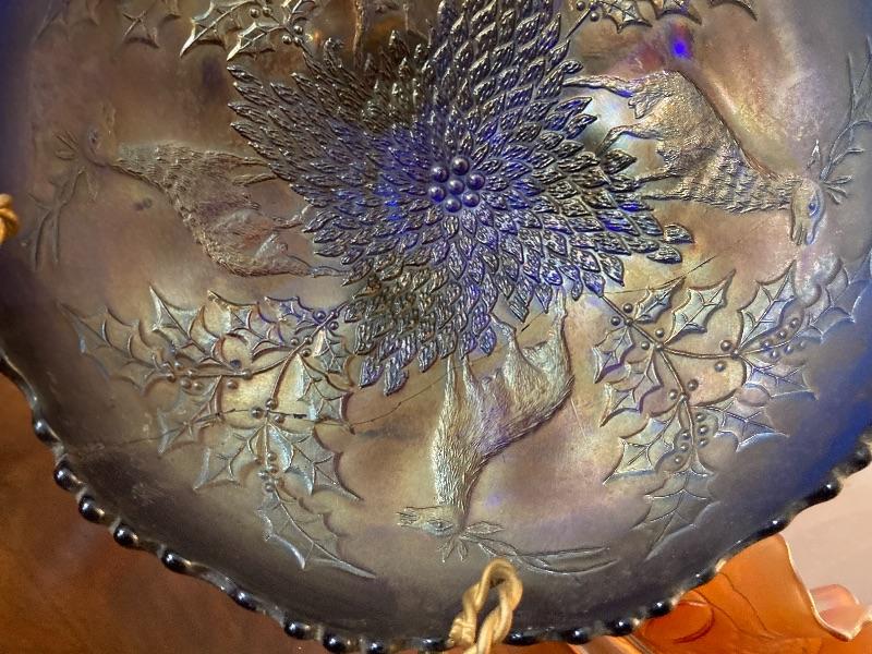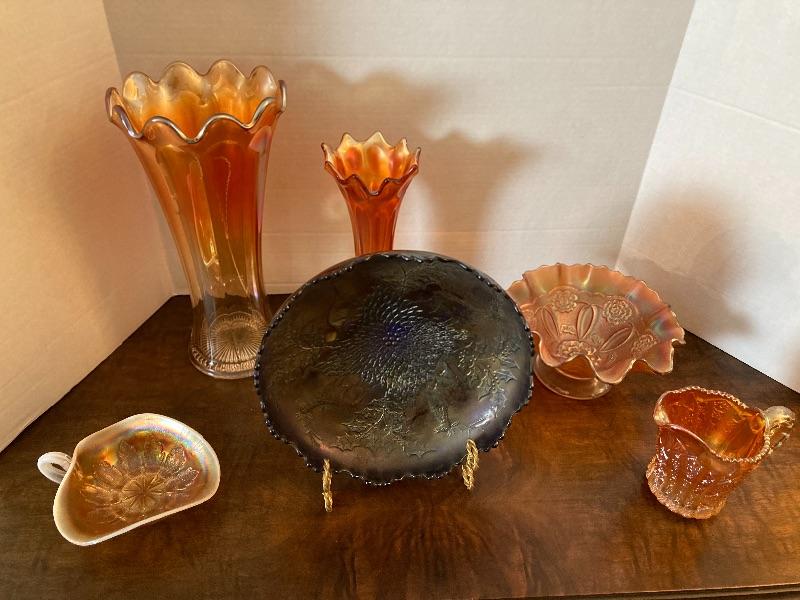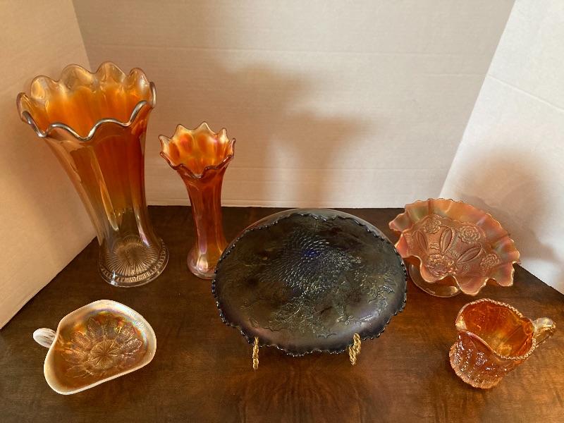 Lot of vintage carnival glass items. Bowl has damage (see photos) and has been repaired
