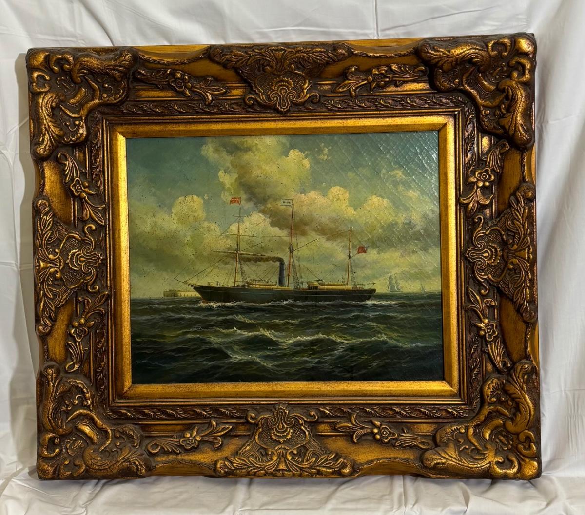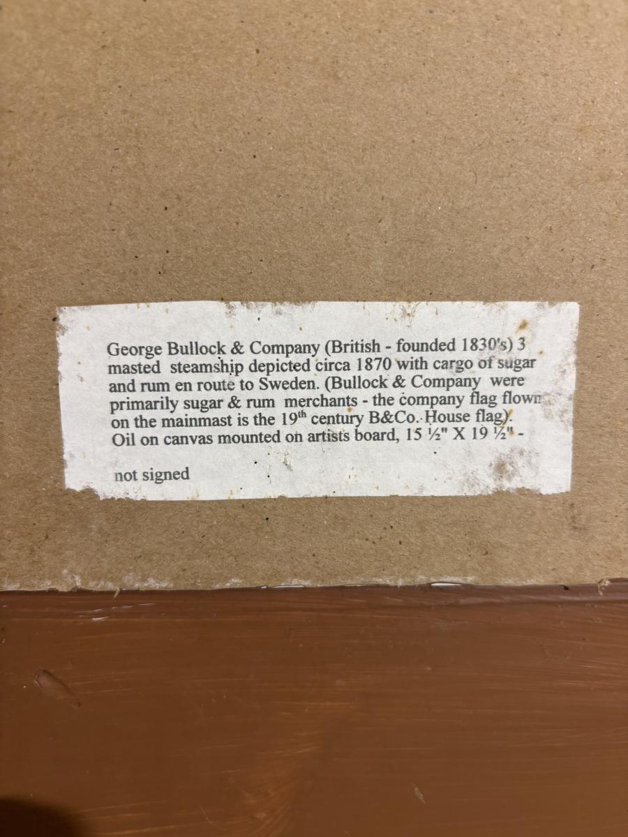 J24-6 Circa 1875 Steam & Sail Ship Oil on Canvas Mounted on Board Painting, Flying 2 Flags, Artist Unknown, British & Swedish Flags Bullock Co. Sugar & Rum Merchants