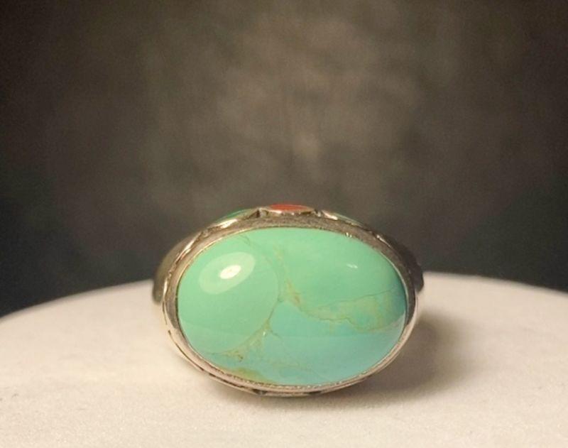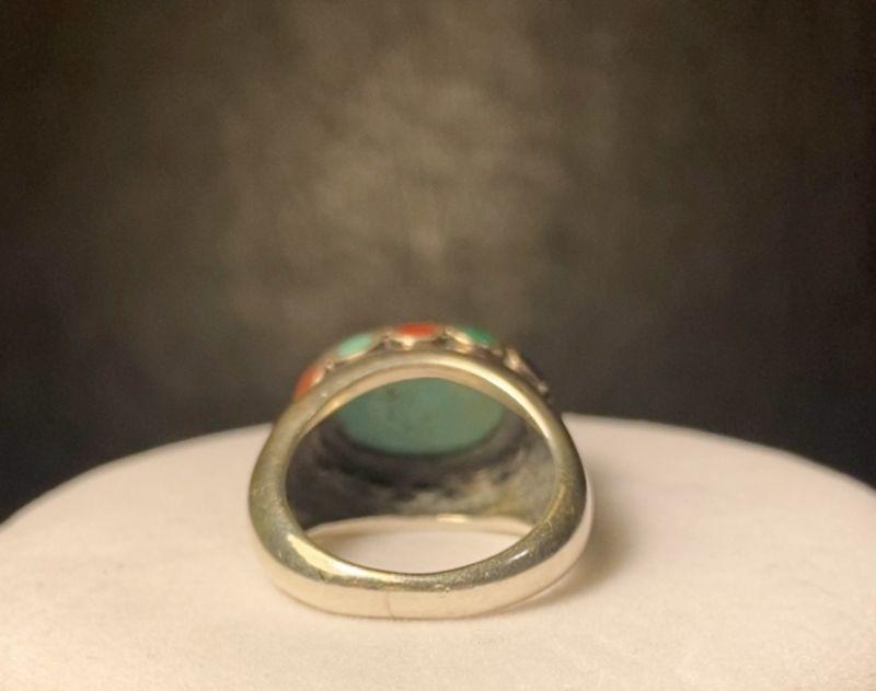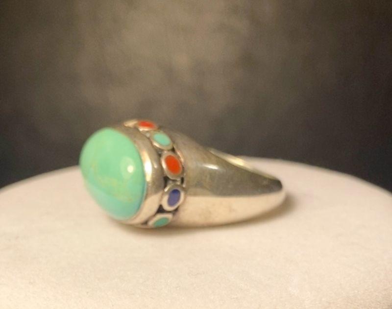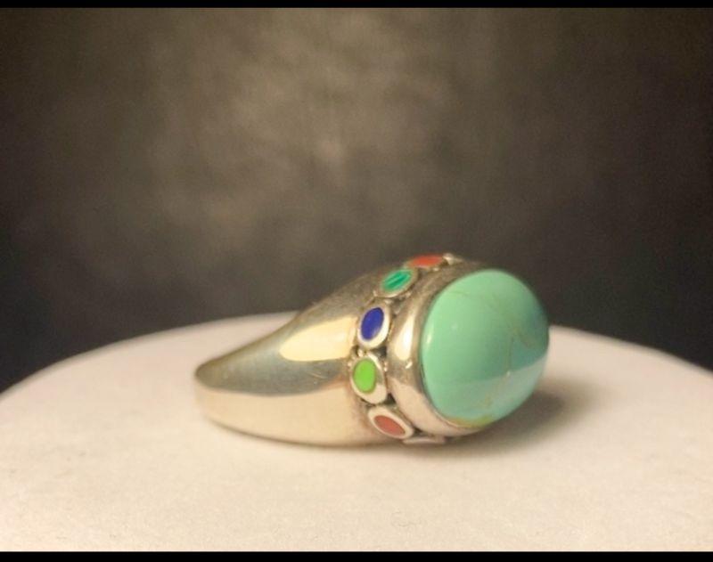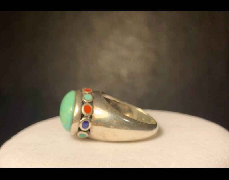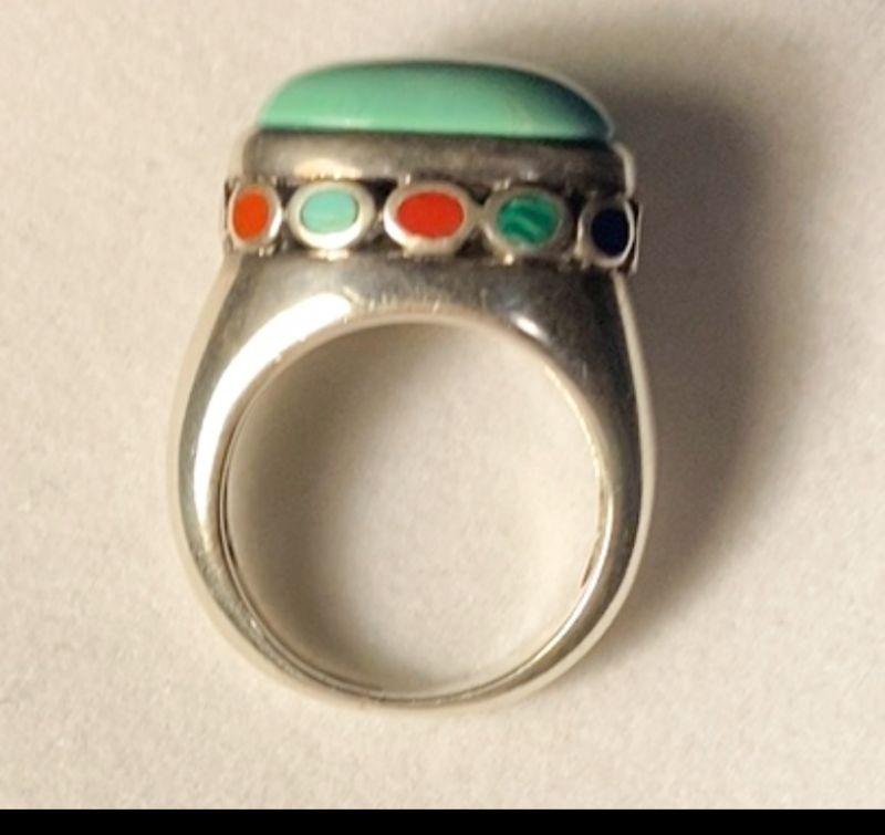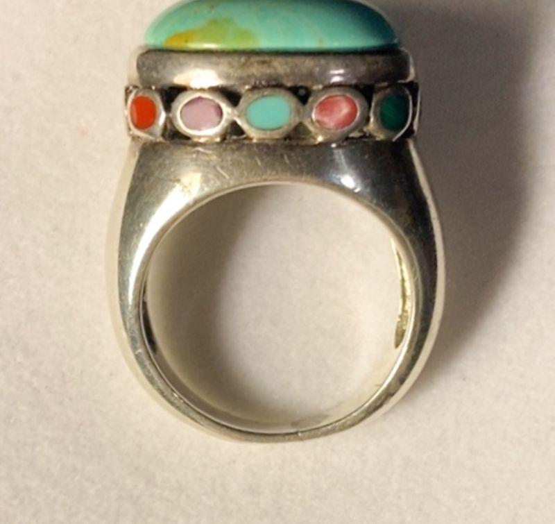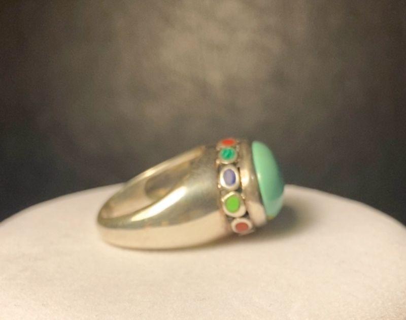 Silver ring with large cabochon and inlaid stone border Size 6.
