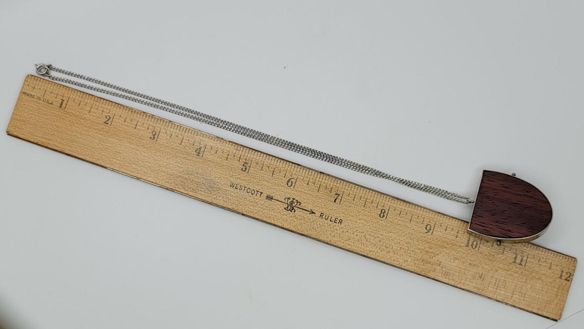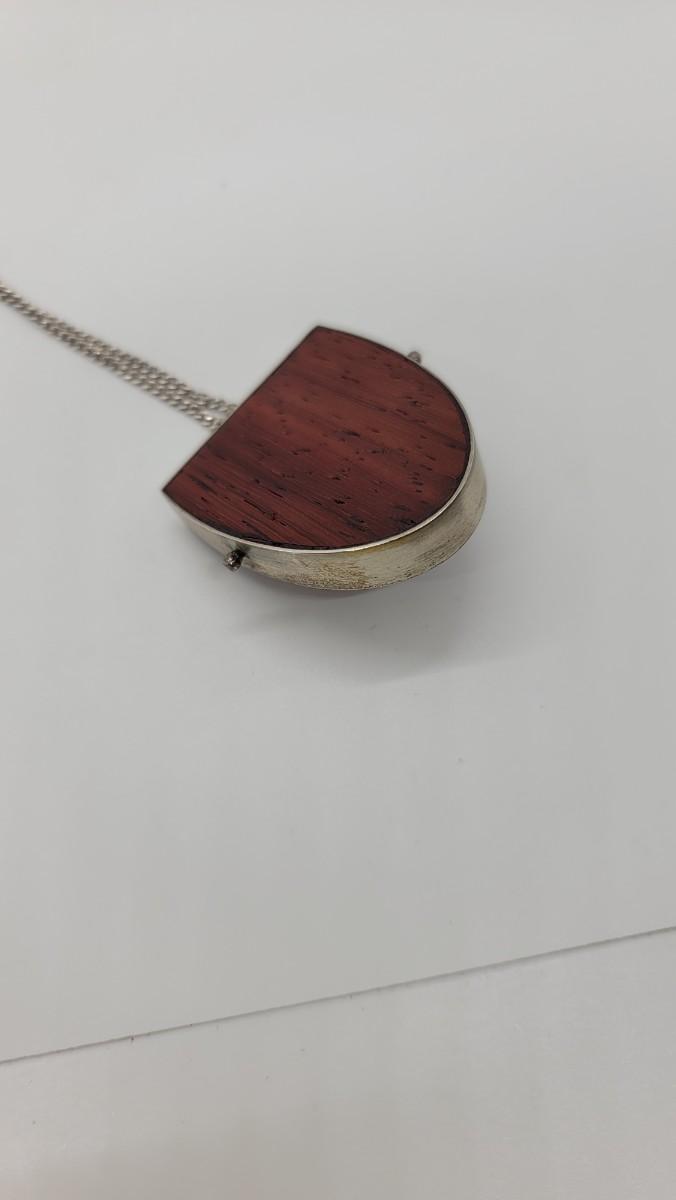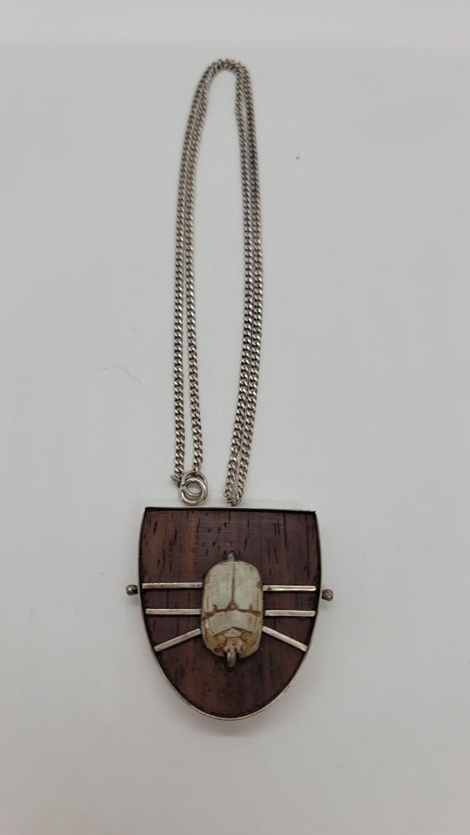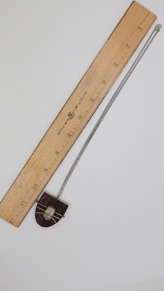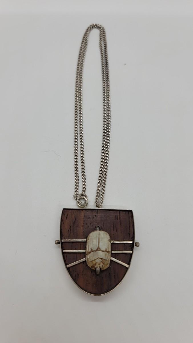 Handcrafted scarab mounted on wood and silver base. Pendant 1.5” L x 1 1/4” W. 18” chain.