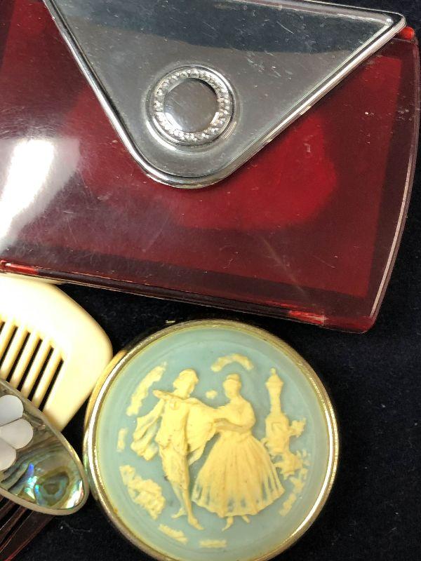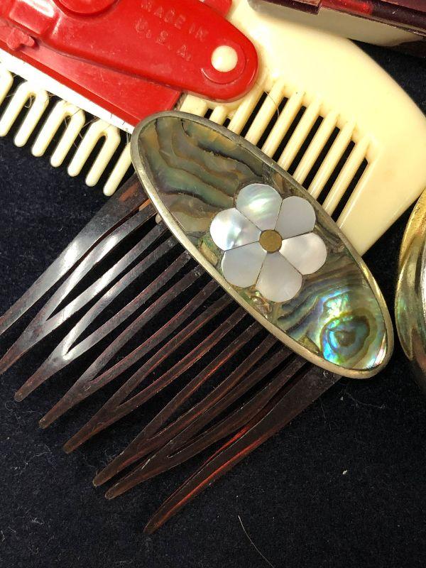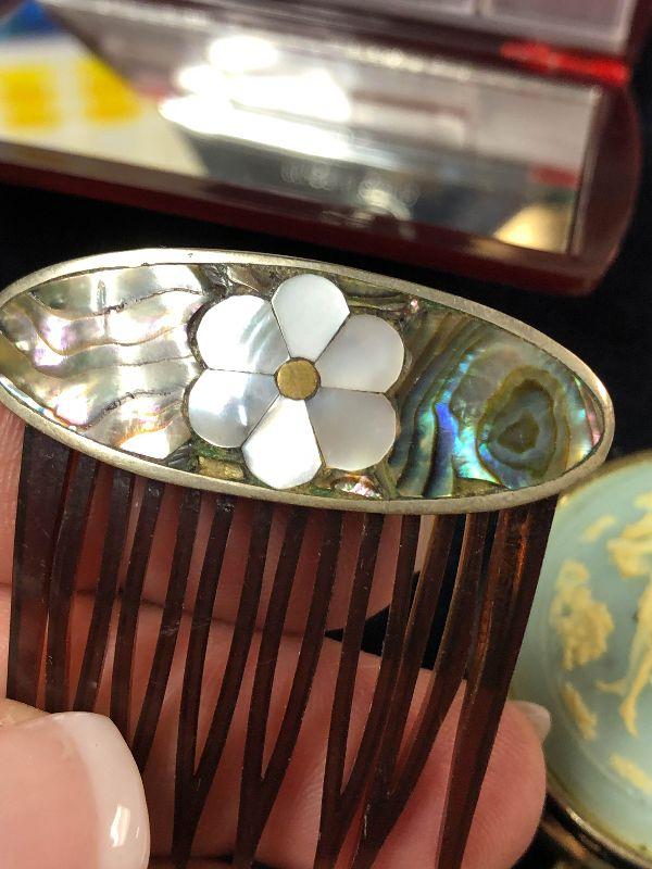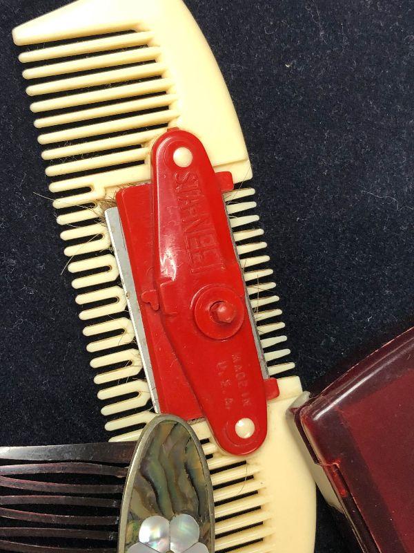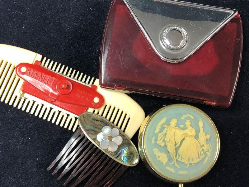 Cute purse pill case, hair comb with shell, and a Sta-Neet comb.