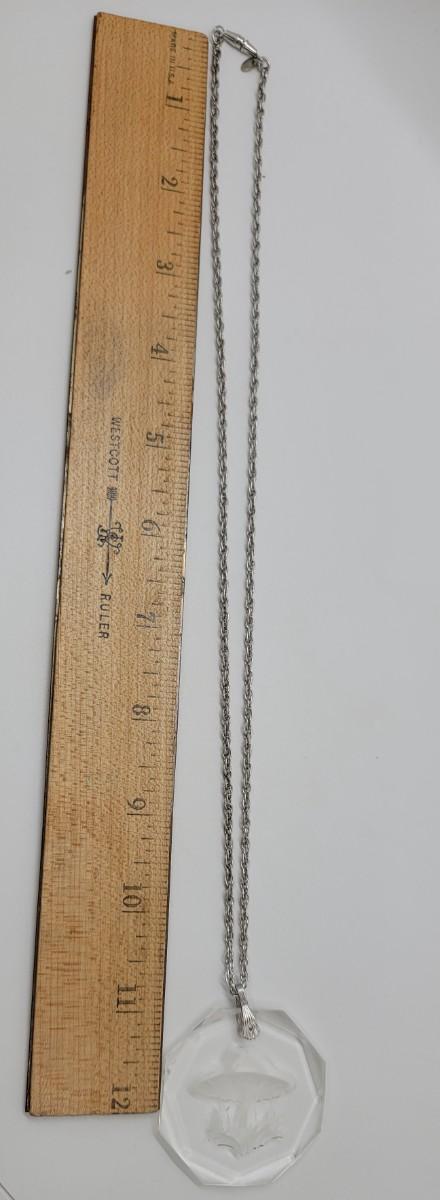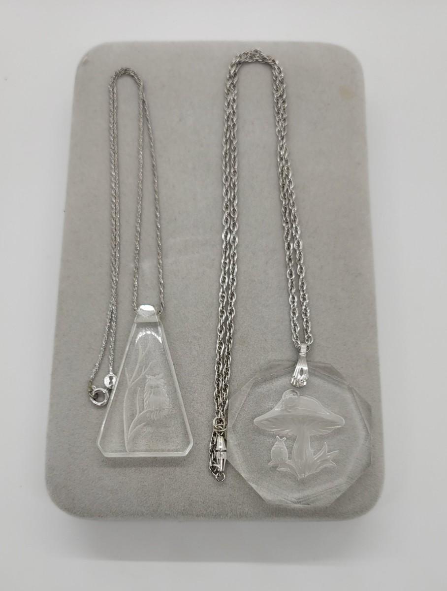 Lot J35: Plexiglass etched Owl, and, a glass etched Mushroom necklace.