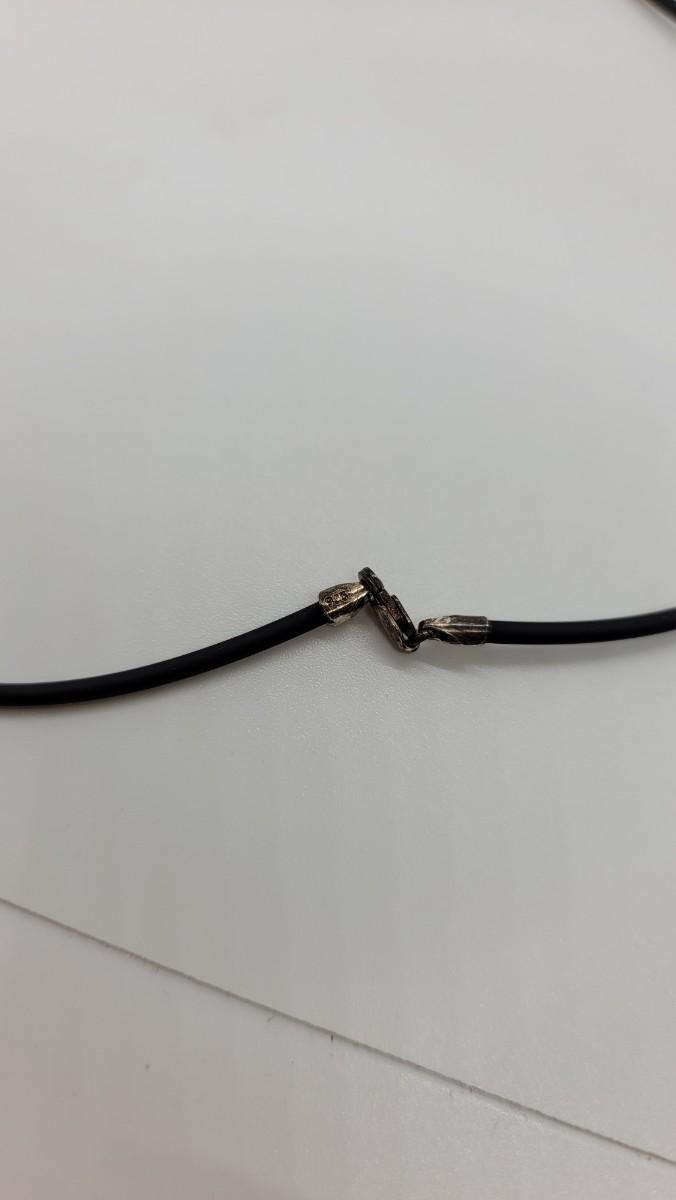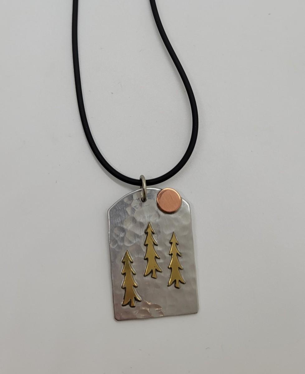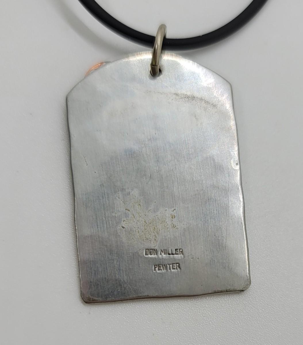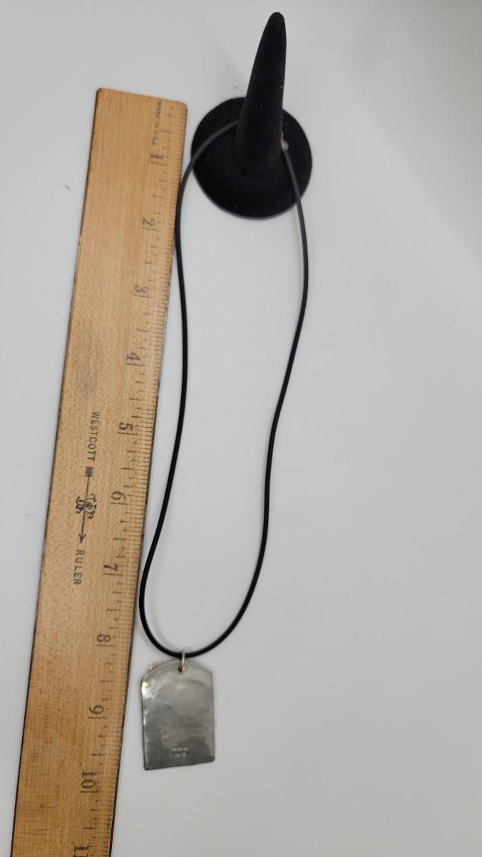 Pewter pendant on a 16” black cord with a sterling silver clasp.