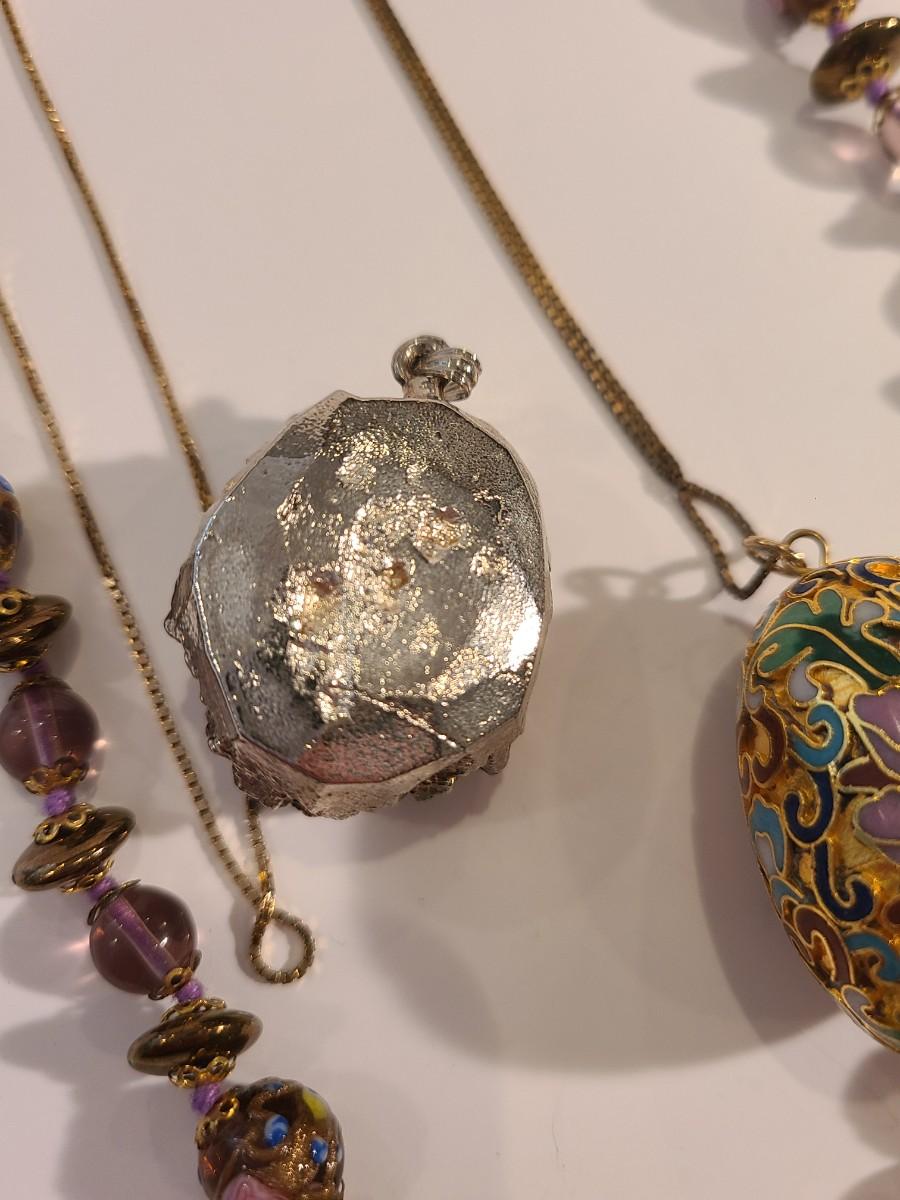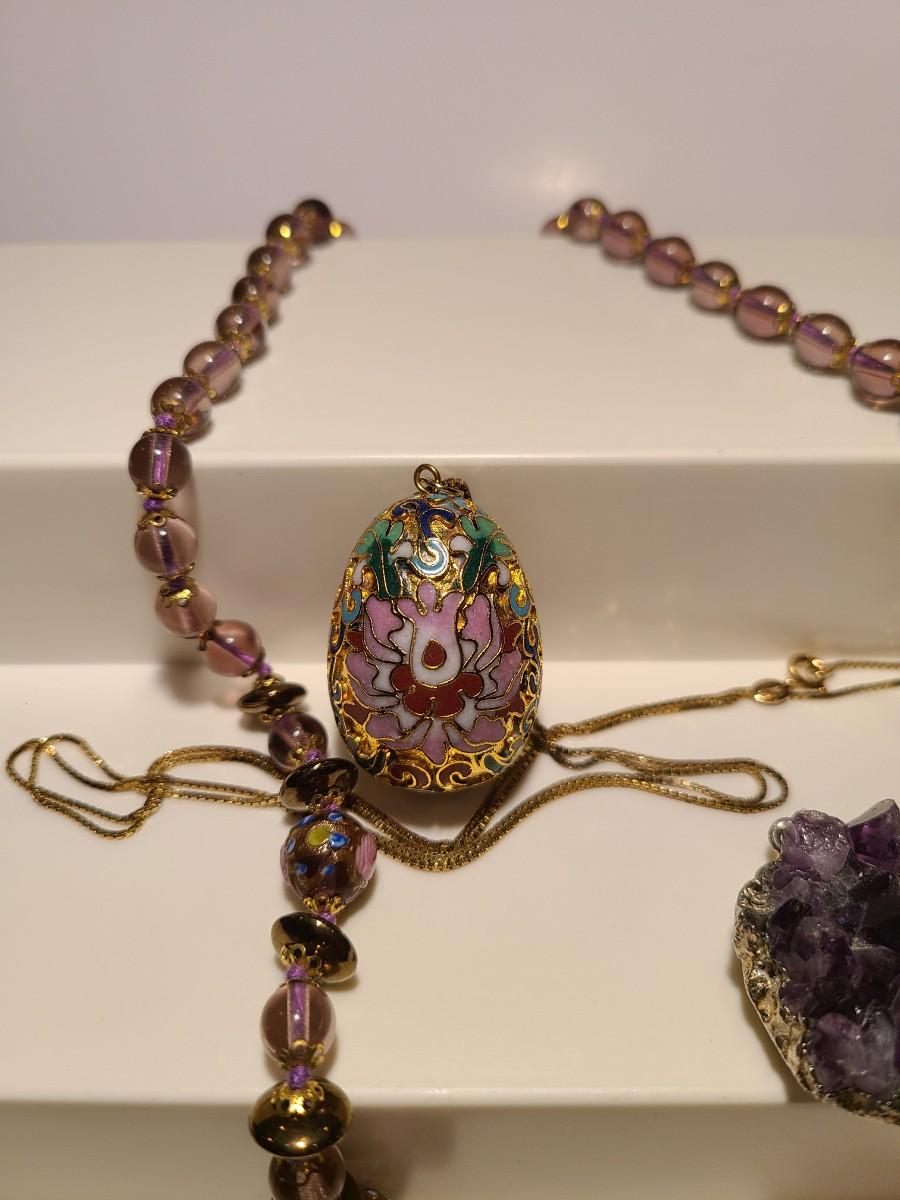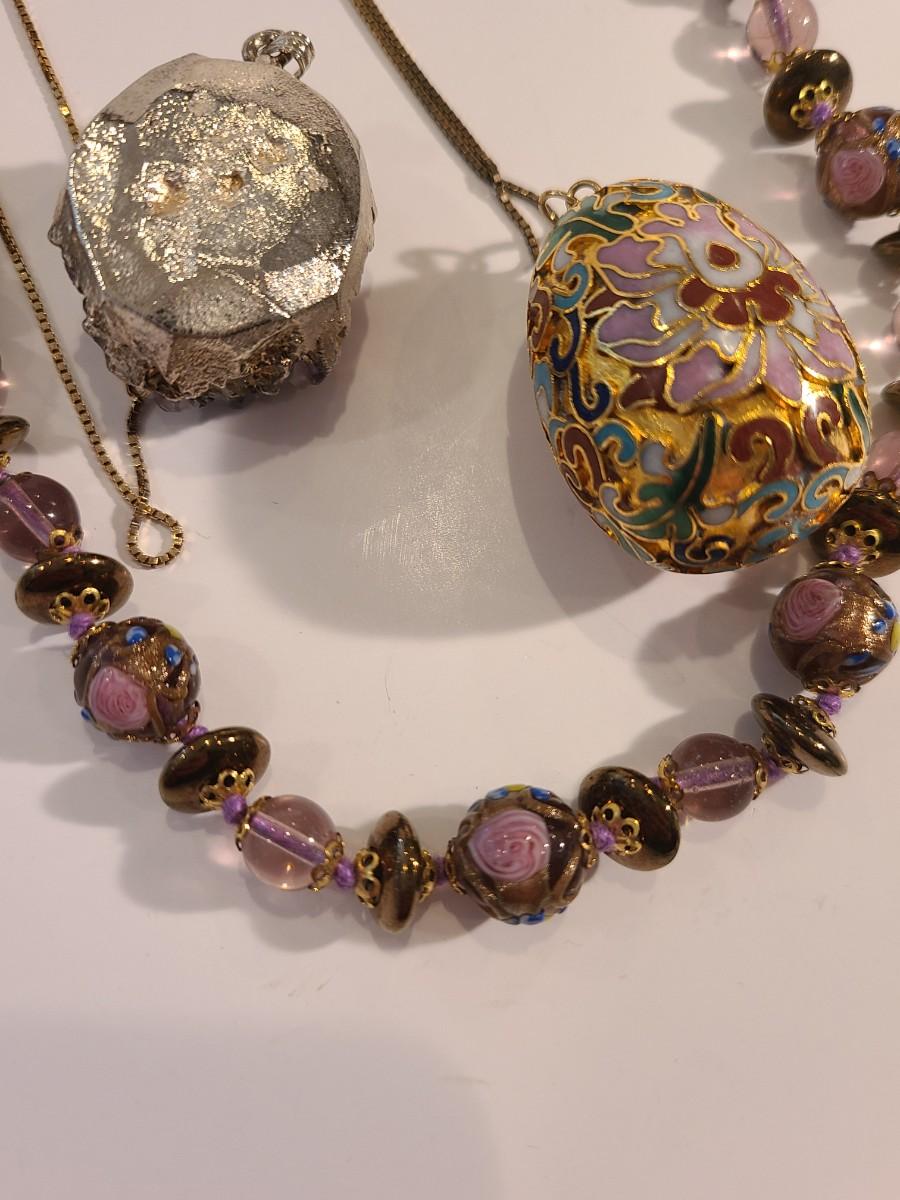 Lovely painted glass beaded necklace in purple hues, a Cloisonne styled egg pendant on a long sterling chain, and an amethyst geode made into a pendant. Please see all pictures as they are the best representation of the items. The pictures show condition, measurements if taken, and what is included in the lot. Due to the large amount that we photograph and the time frame, we are not always able to take measurements. All items unless noted, are pre-owned and have been used. If you purchased furniture, you must bring help. We do not allow one person to carry large furniture out on their own. Bring help, tools and a truck for the safety of our client’s homes, and your personal safety. Any damages that result to the property including walls, and floors due to moving of the furniture will be charged to the buyer. Company policy. Thank you.