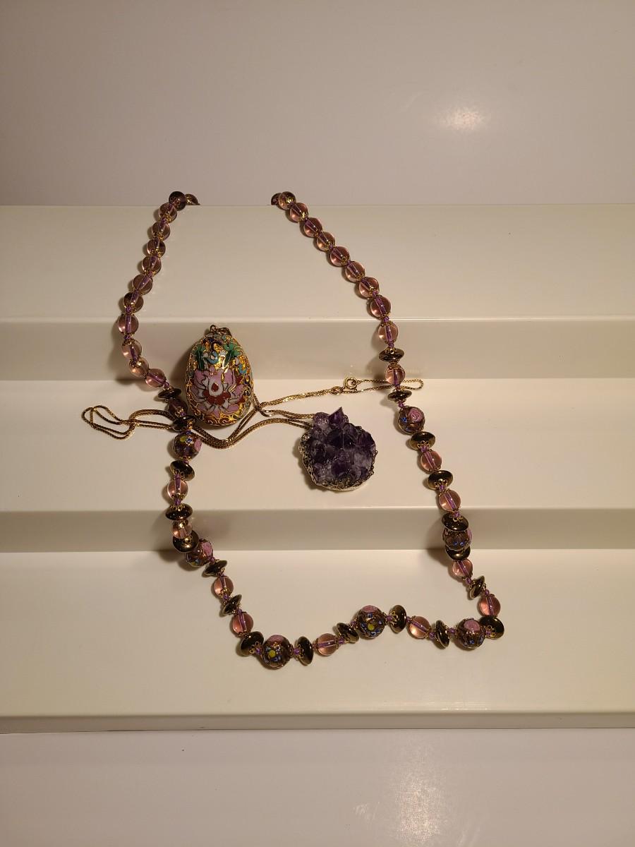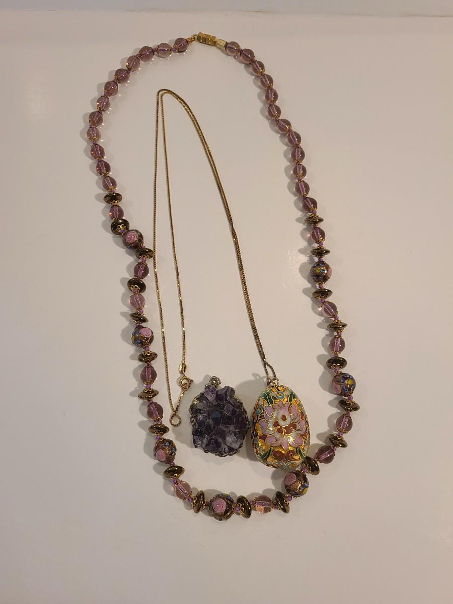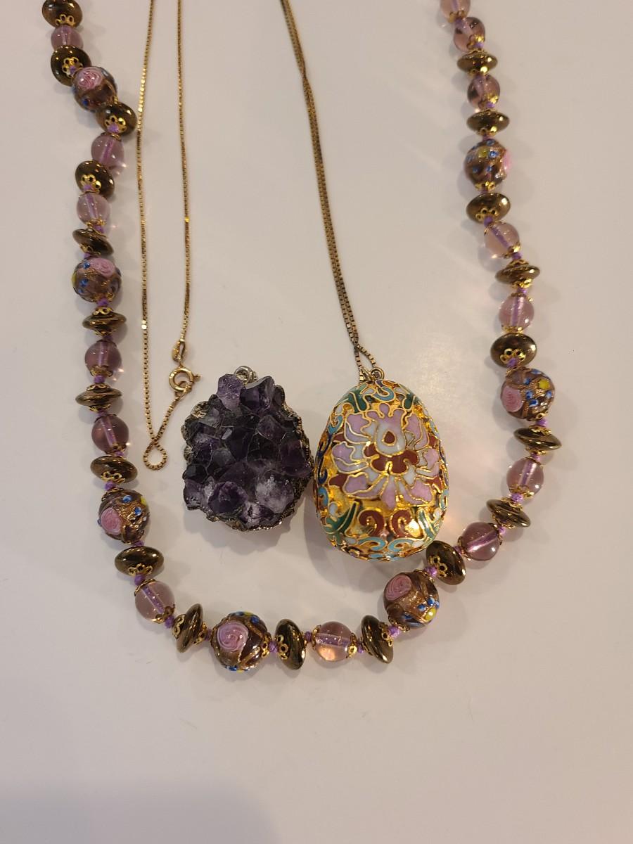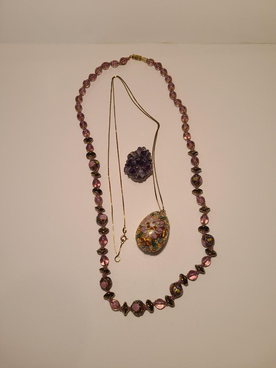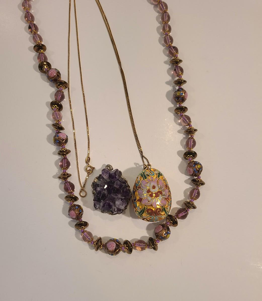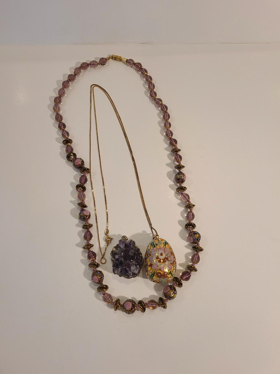 J4: Vintage Amethyst Geo Pendant, Glass Painted Bead Necklace and More