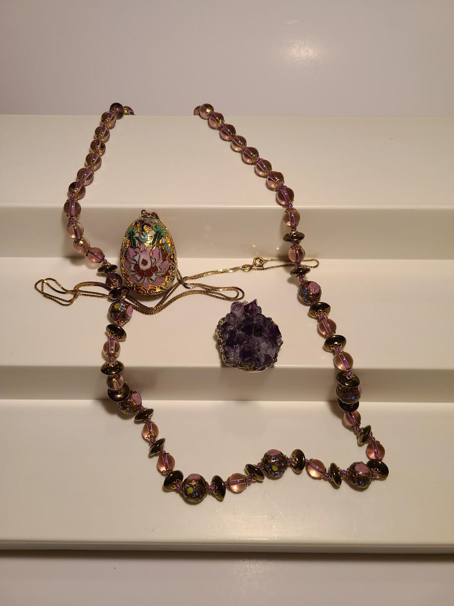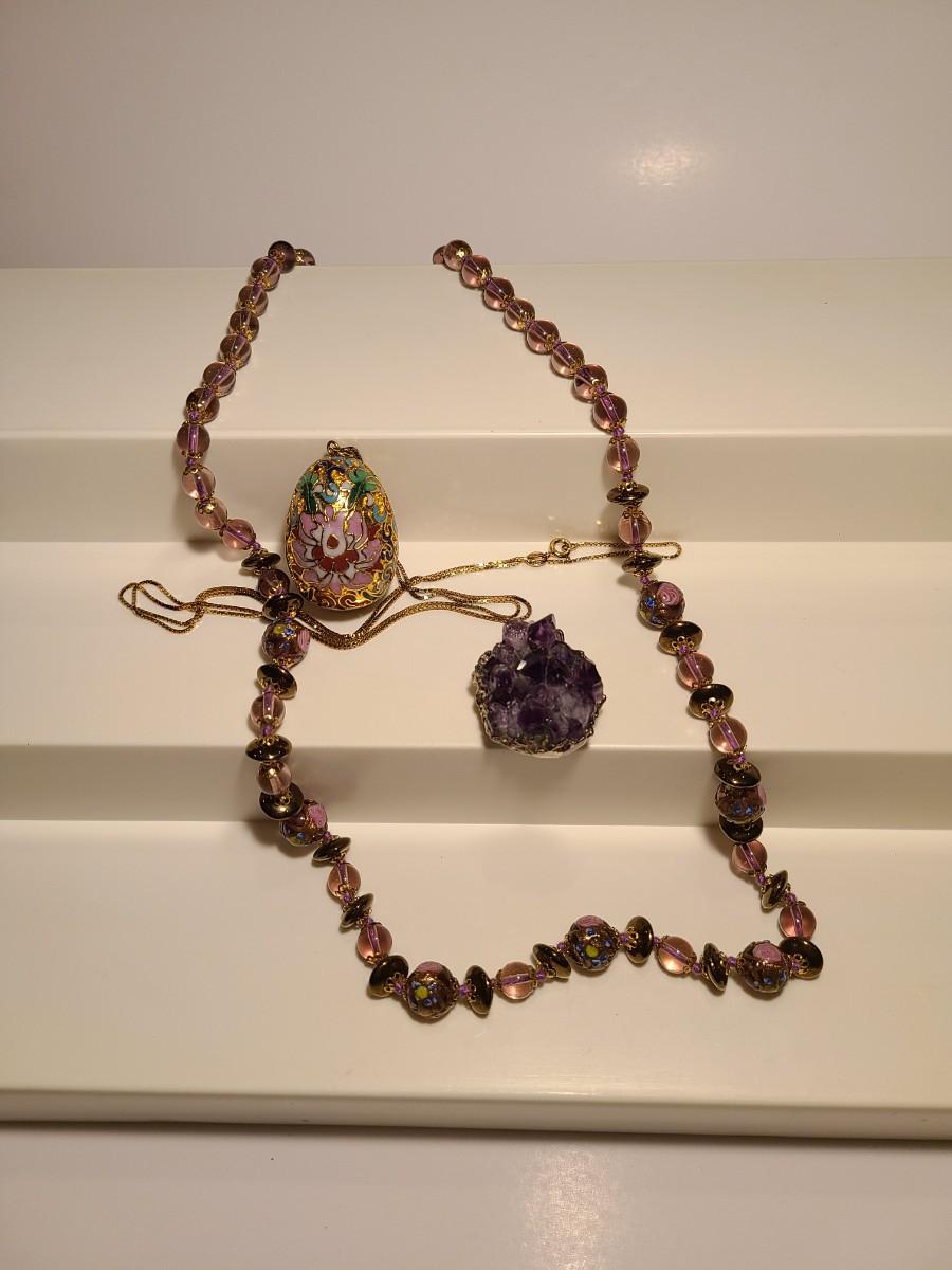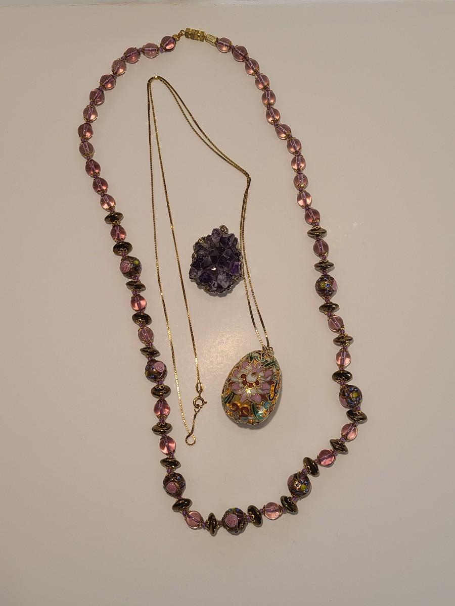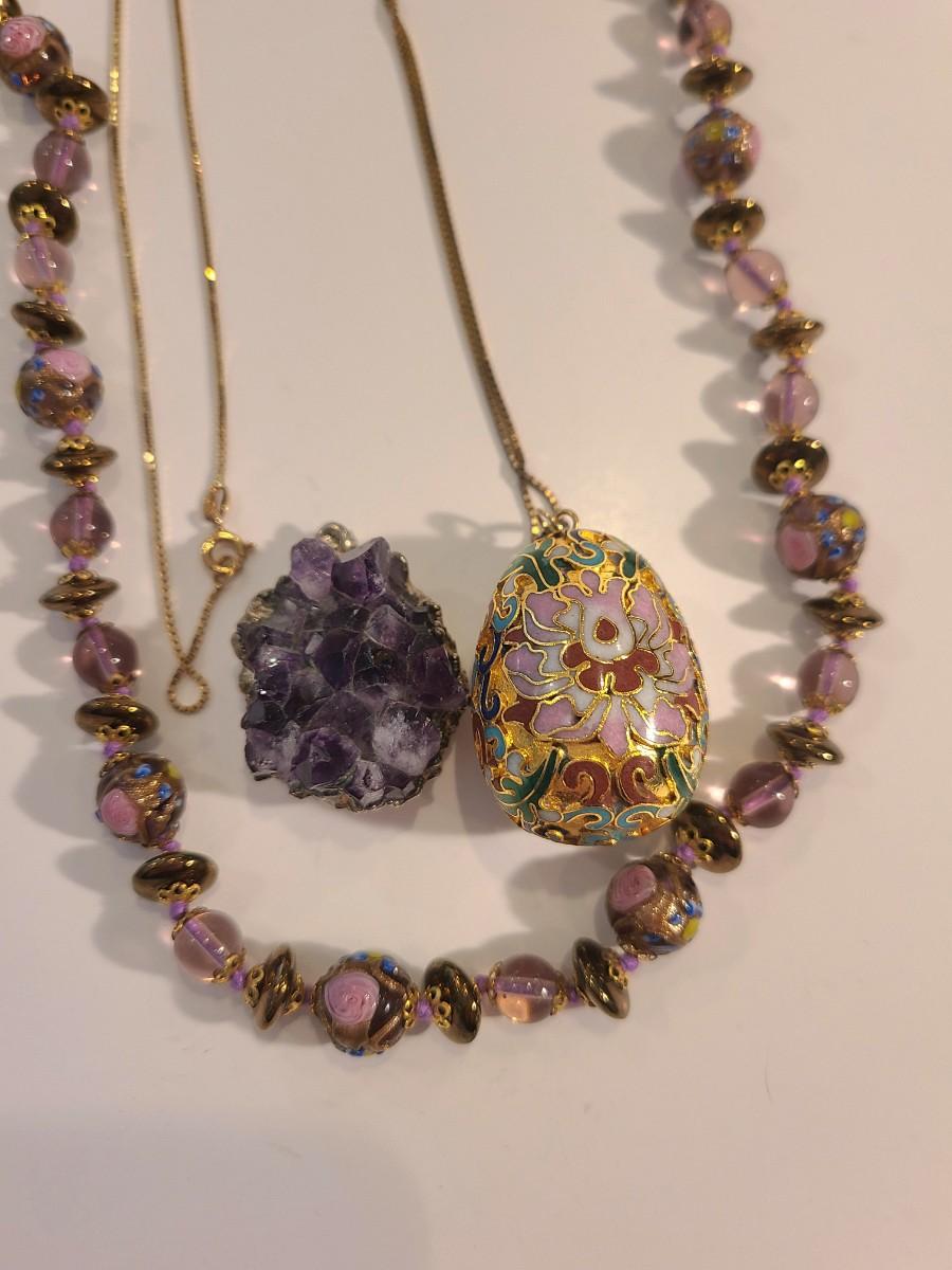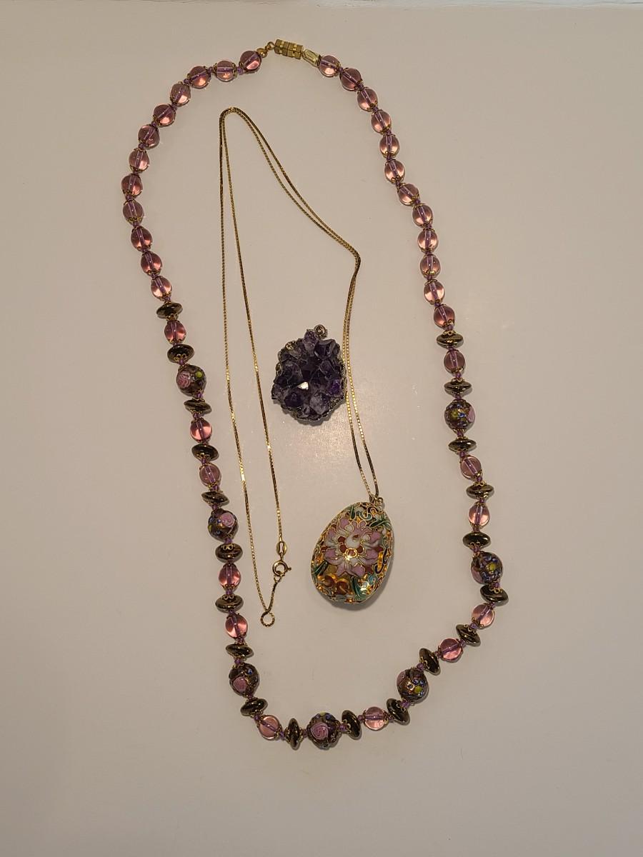 J4: Vintage Amethyst Geo Pendant, Glass Painted Bead Necklace and More