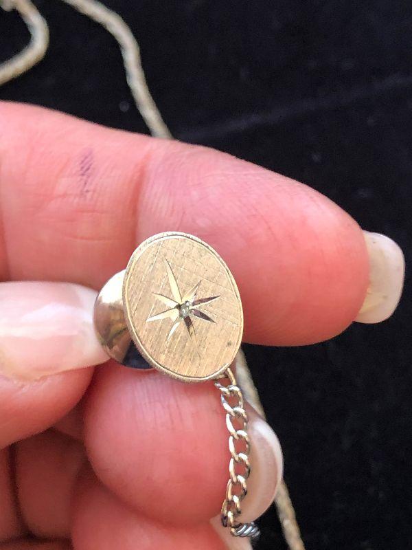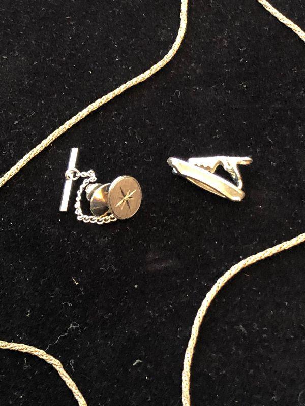 Vintage gold toned, Shields tie clip, and a sterling silver tie tac with starburst design. Also, a rope style, gold toned necklace.