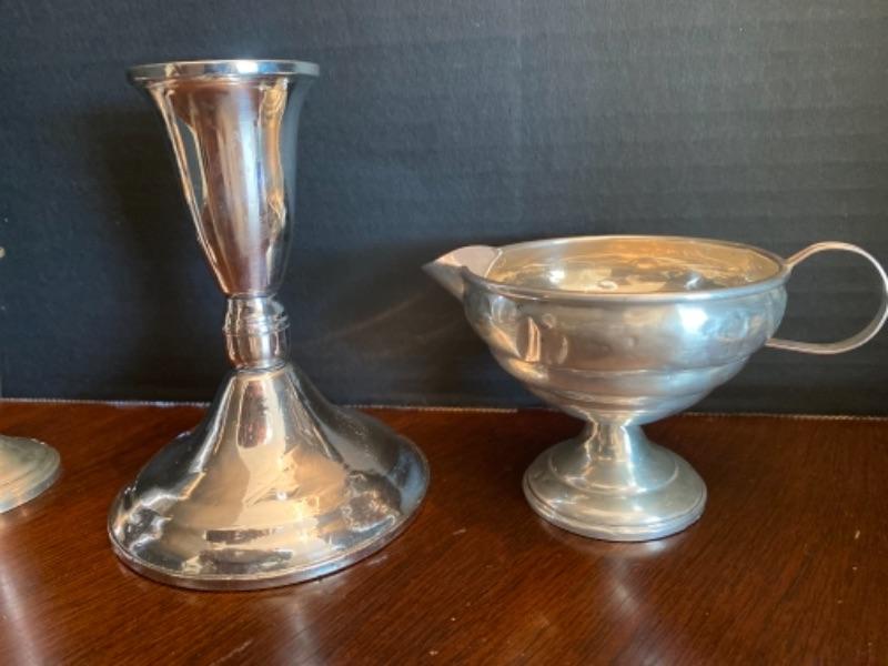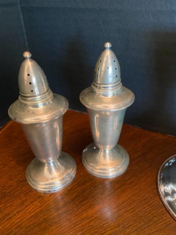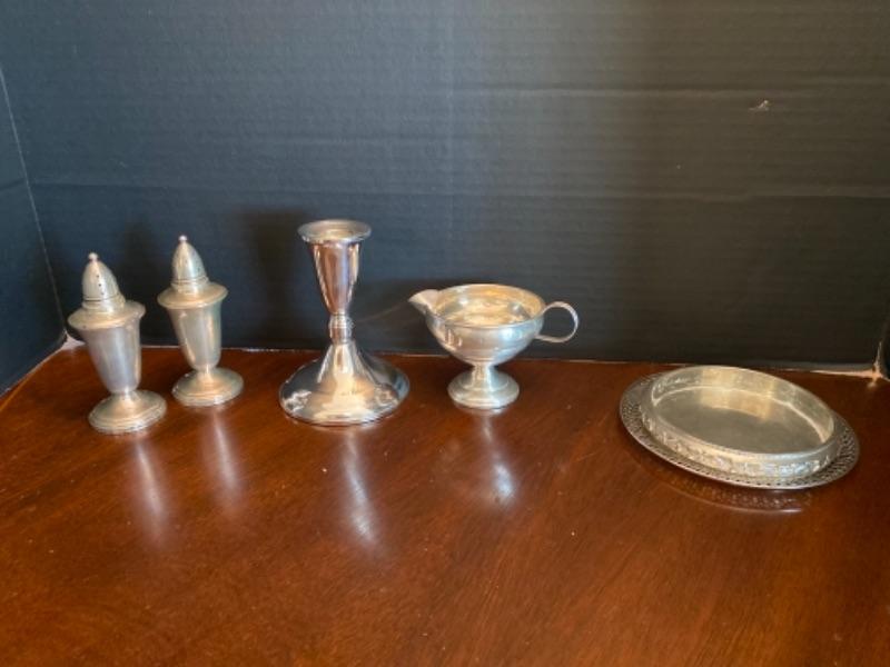 Lot of 4 Sterling serving pieces. Pair of weighted salt and pepper shakers one single weighted candlestick, one small creamer with dent and one coaster with the edge being Sterling only