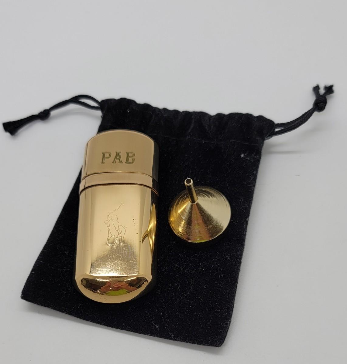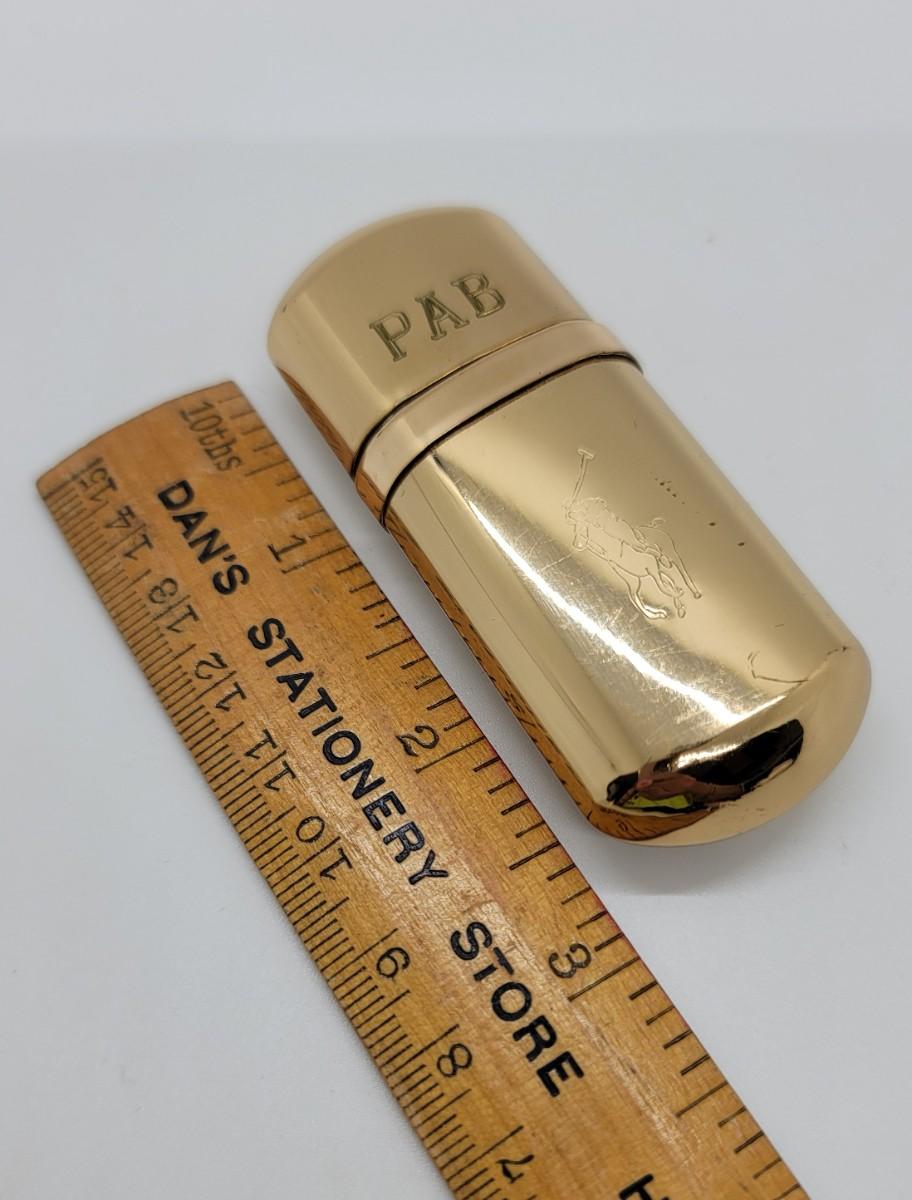 Ralph Lauren goldtone, engraved, purse size, refillable perfume bottle. 2 3/4”. Funnel included.
