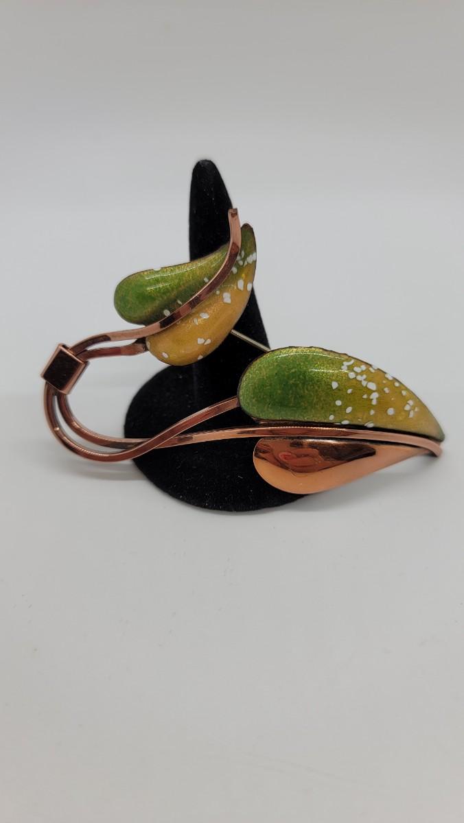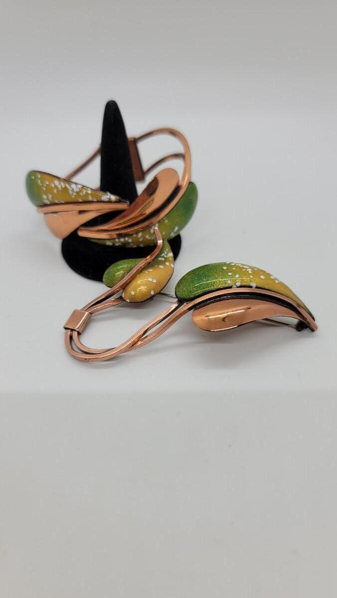 Matisse Renoir enameled copper, green ivy pin and bracelet set. Hinged clamper.