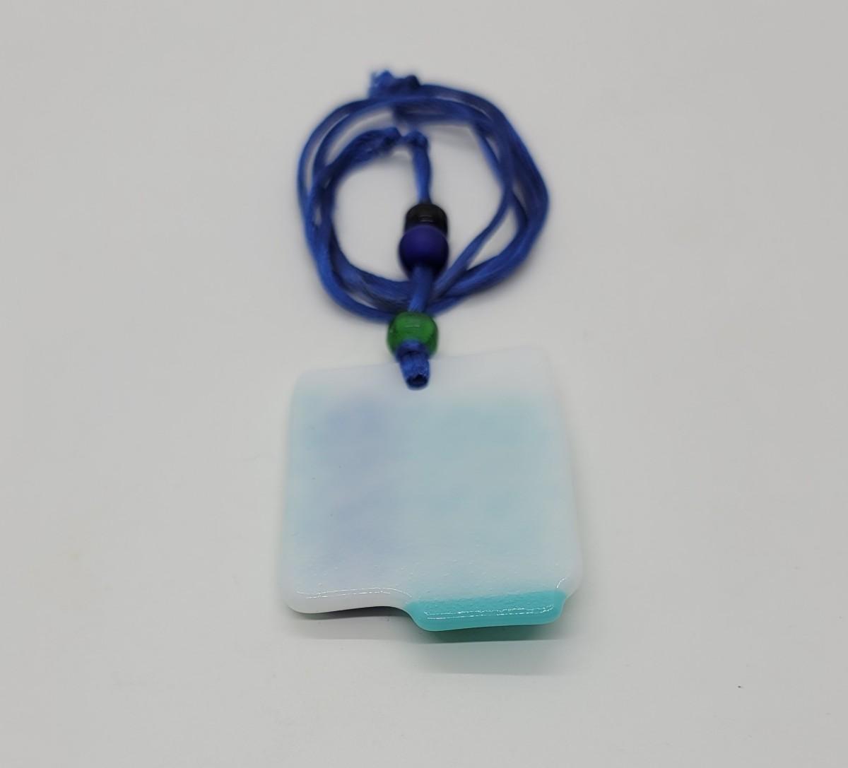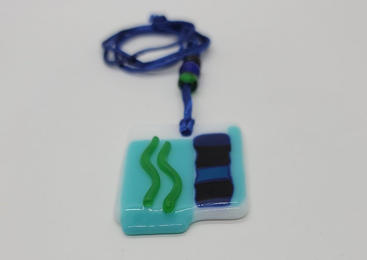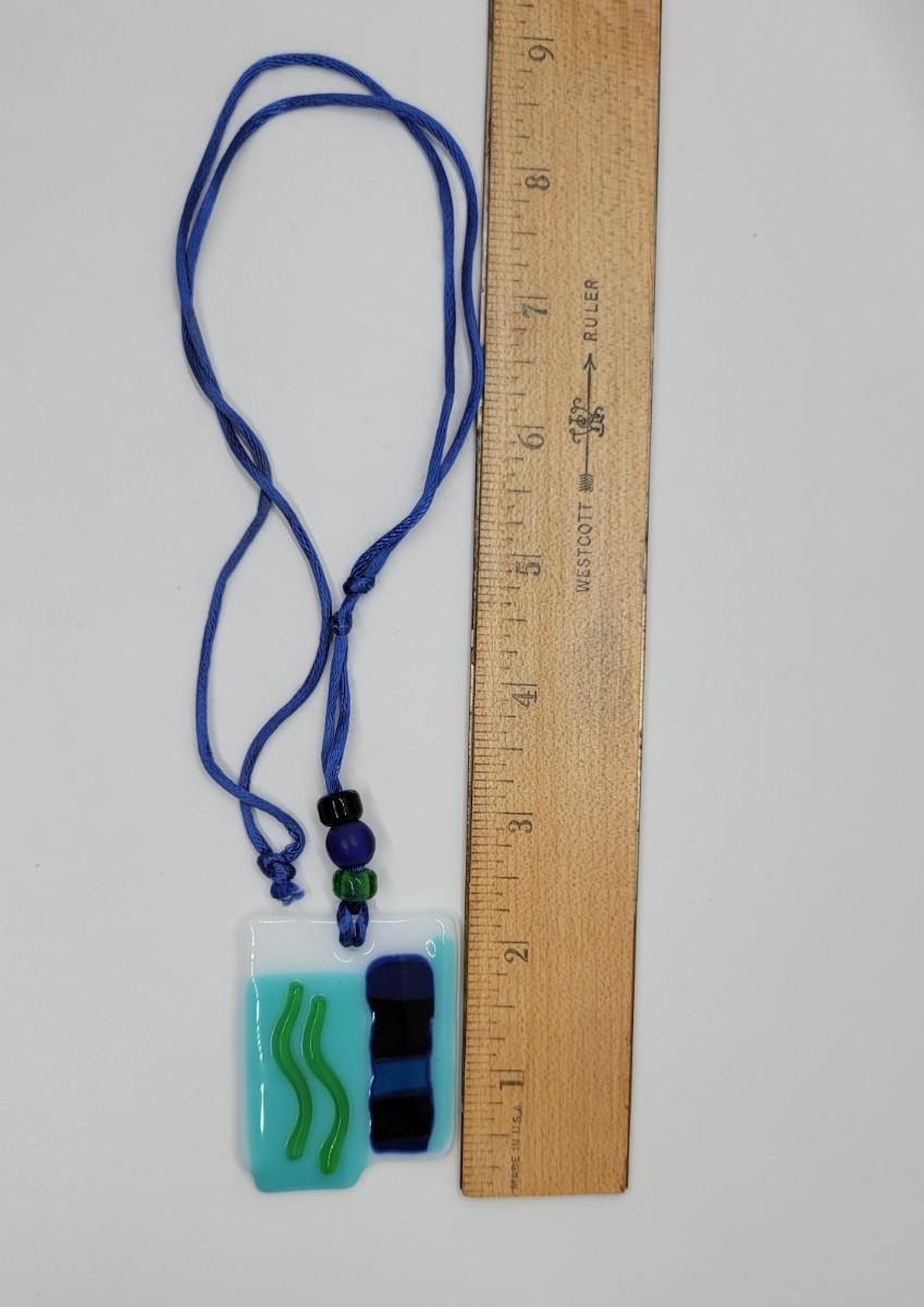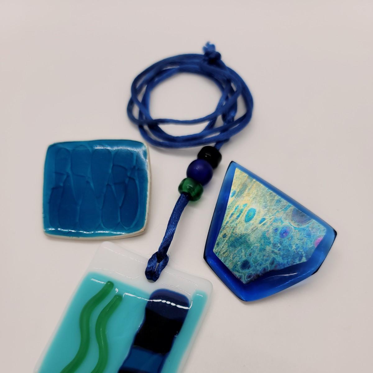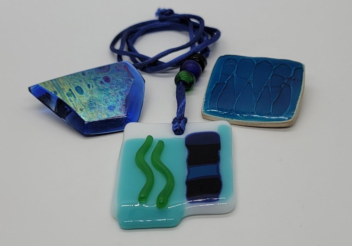 Blue Glass Art Deco” Necklace and Pins. 34” necklace on a silk cord with beads.