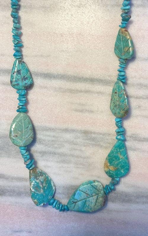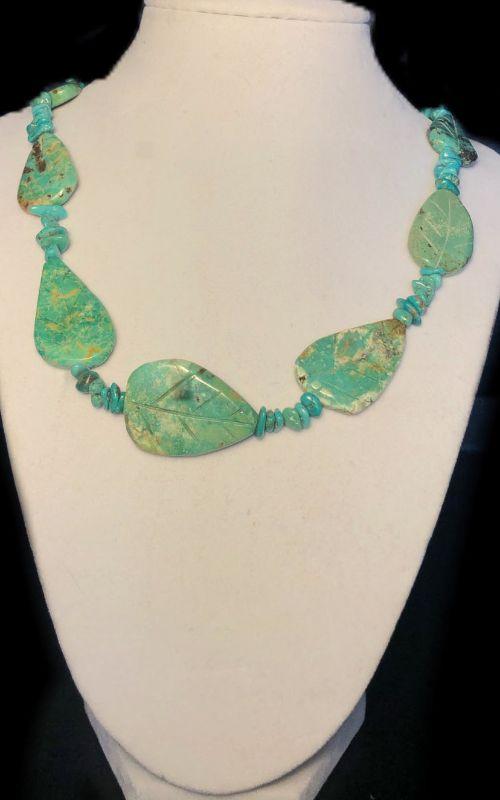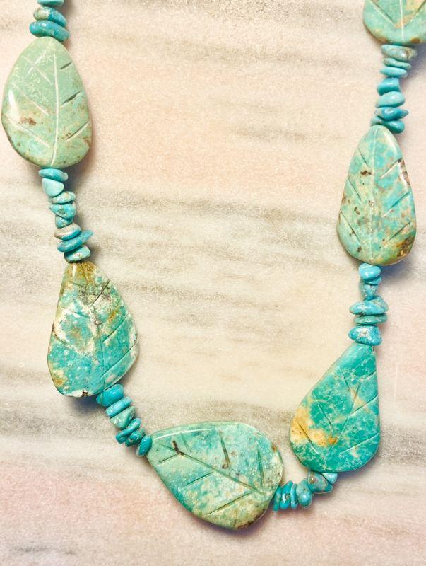 Carved Turquoise leaves with turquoise nuggets, necklace by Jay King. Clasp is marked 925.