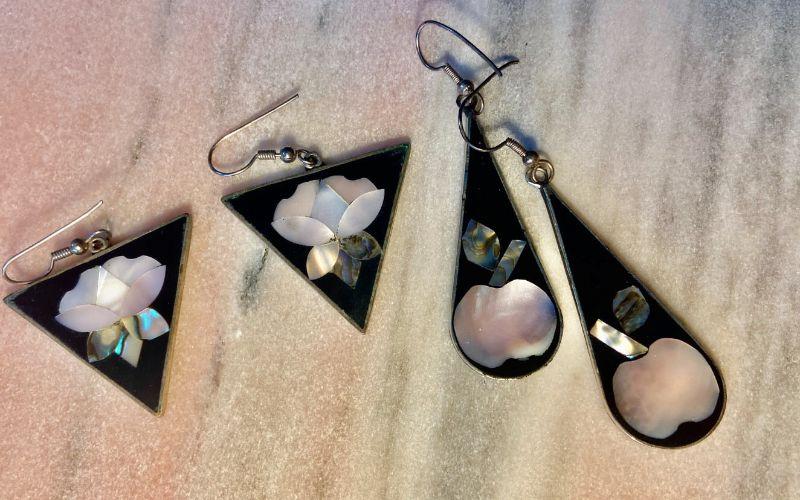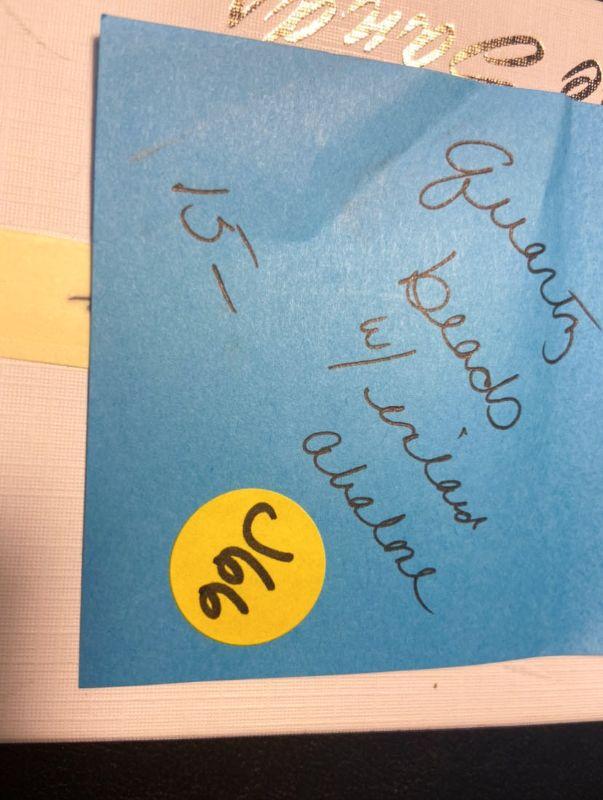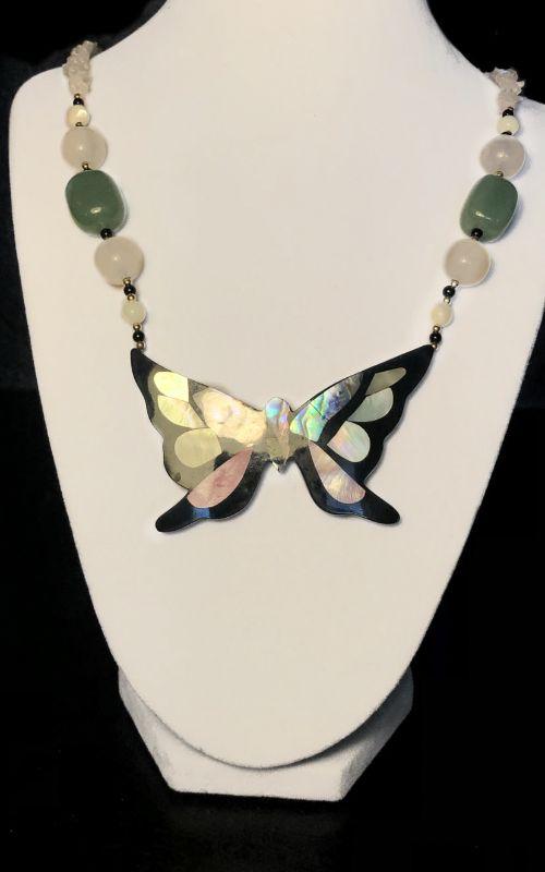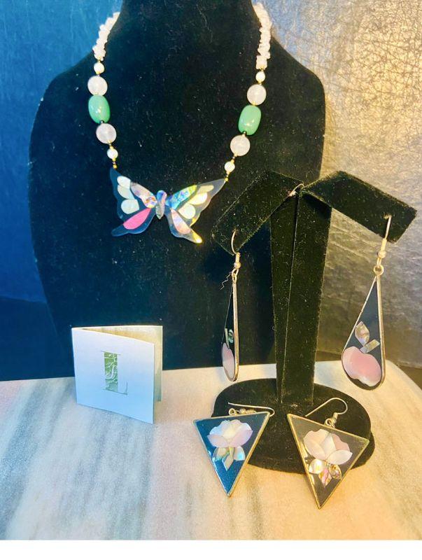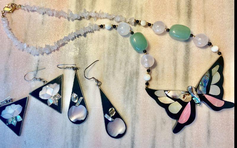 Quartz beads and a butterfly with inlaid abalone, makes this a unique piece. Also, earrings with abalone flowers.