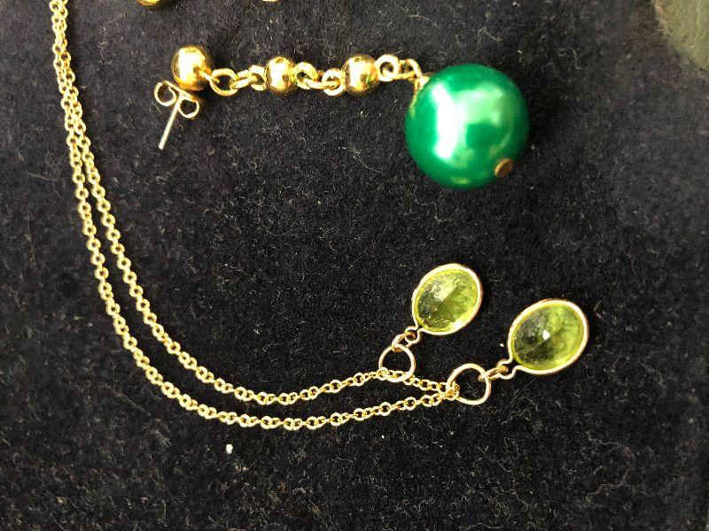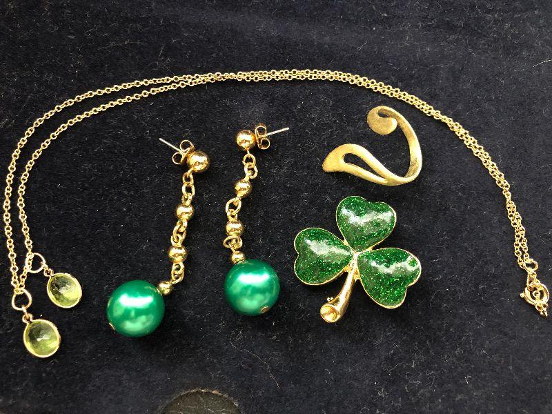 Post earrings, gold tone chain with green pearl, a shamrock pin and more.