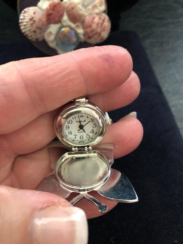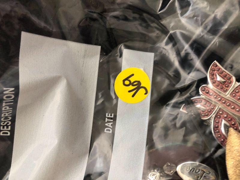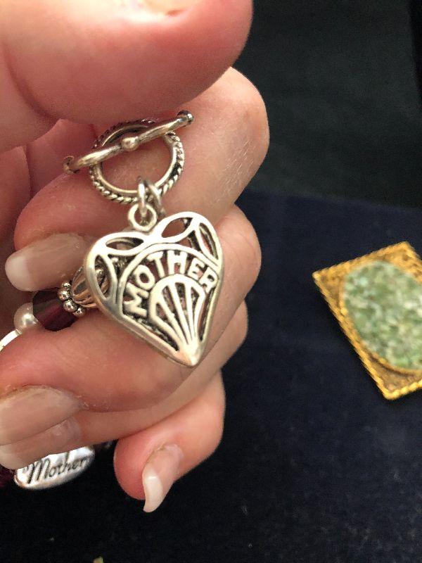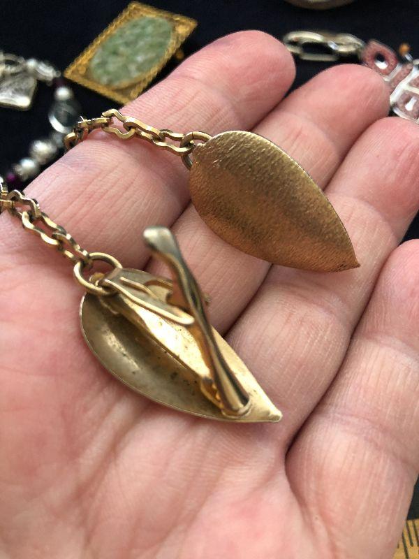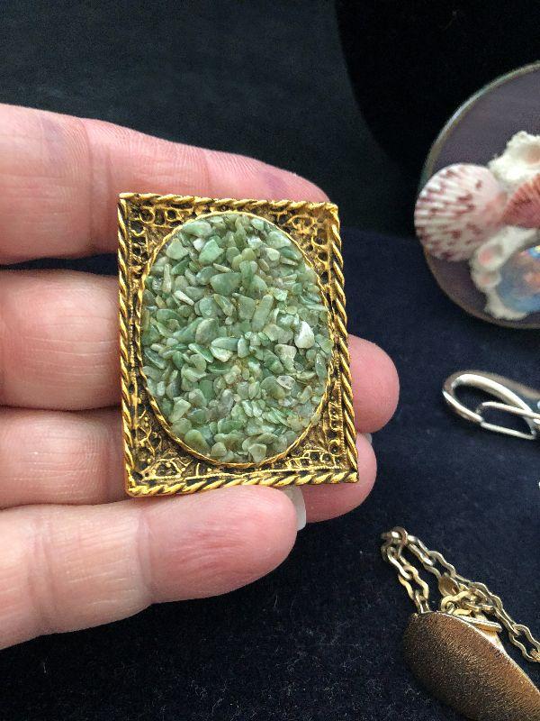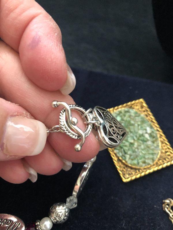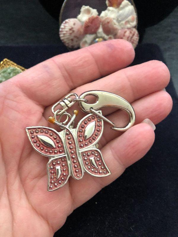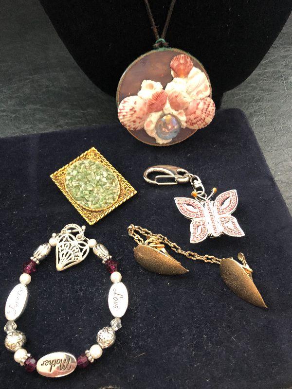 Pandora style bracelet, a pin with possibly jade chips, a butterfly key chain, and more.