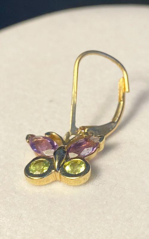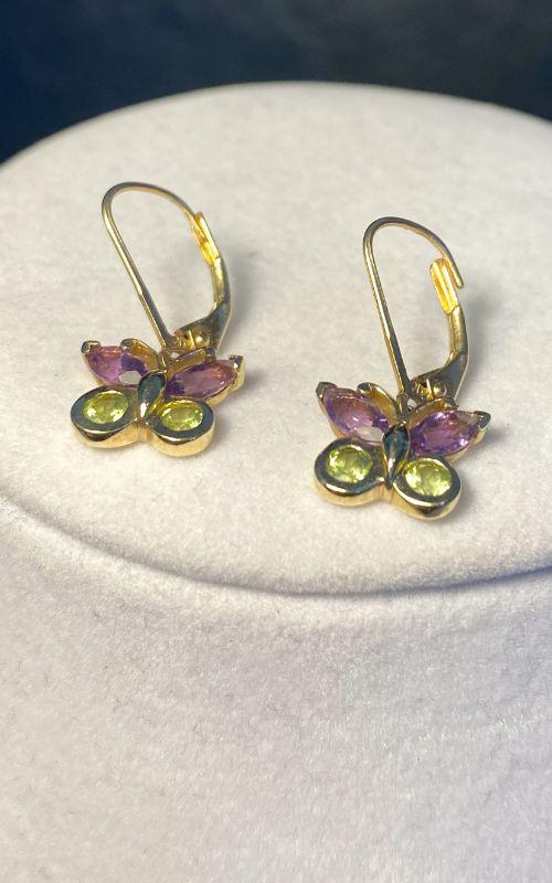 Butterfly earrings are 14k gold with gemstones.