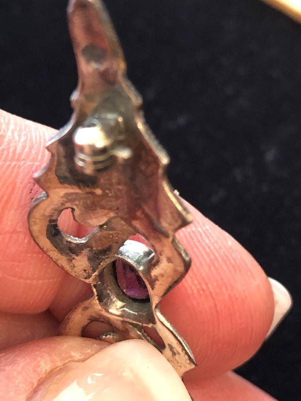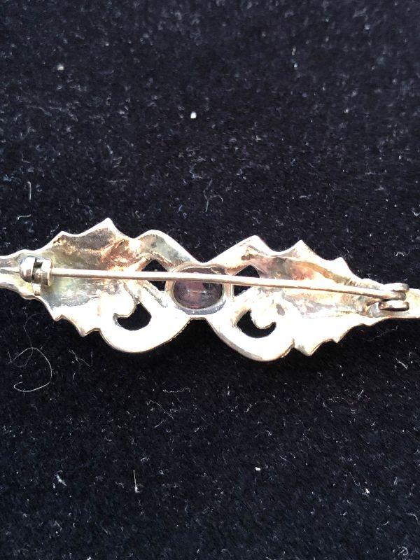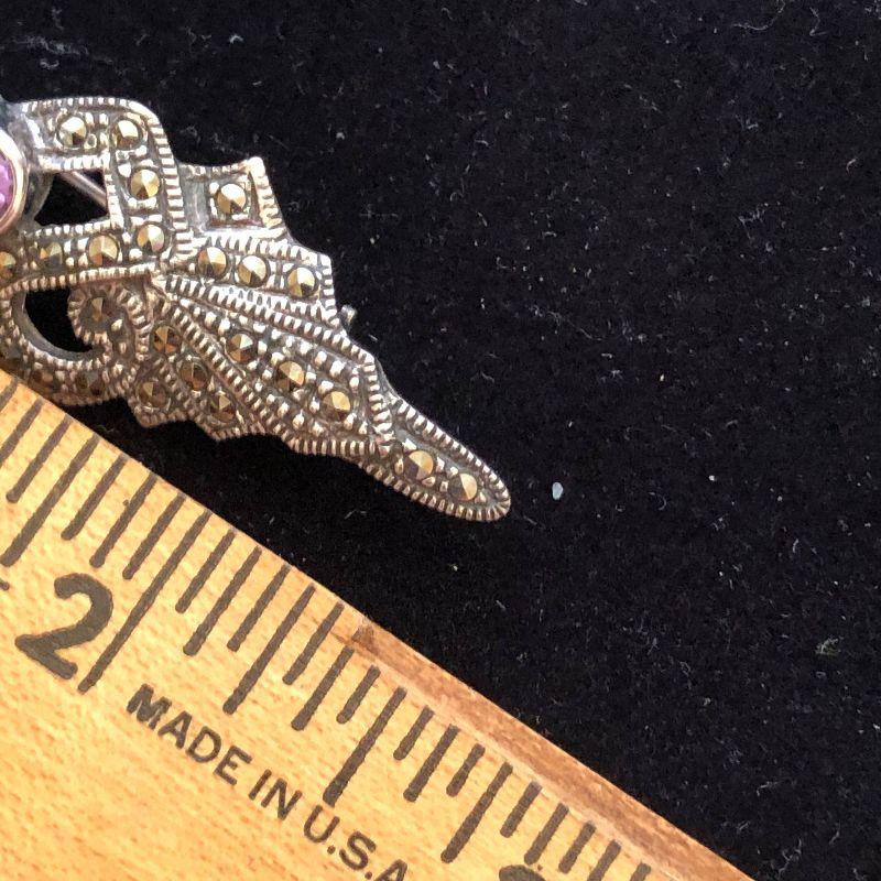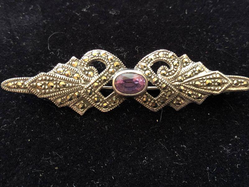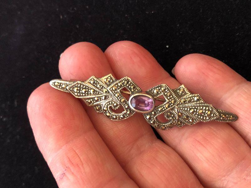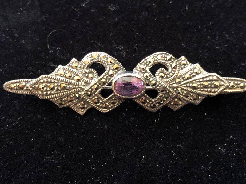 a lovely Sterling silverbrooch with Marcasites and an Amethyst center. Will complement any outfit.