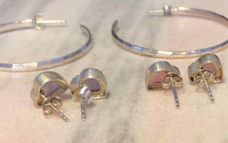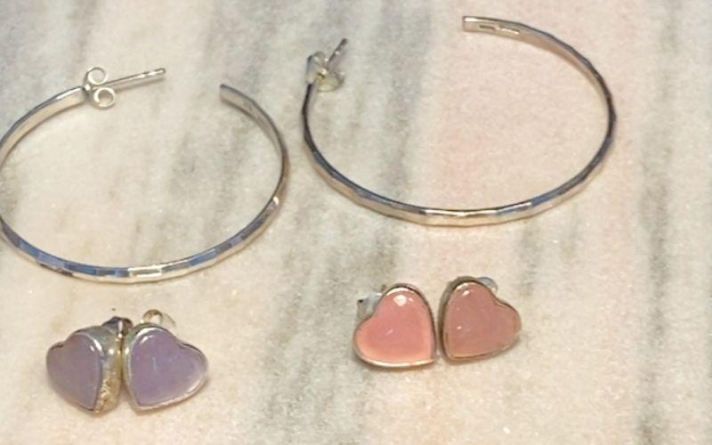 Sterling silver hoops and sterling hearts with pink gem stone.
