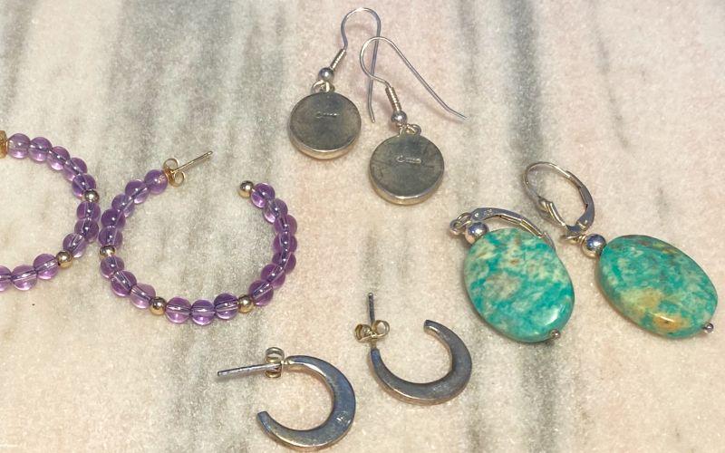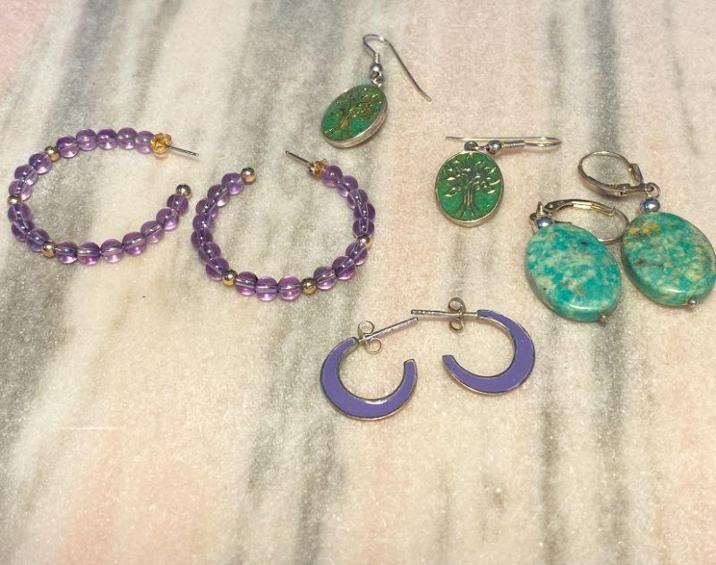 Sterling earrings with tree design, purple, beaded hoop earrings, sterling earrings with purple overlay and more.