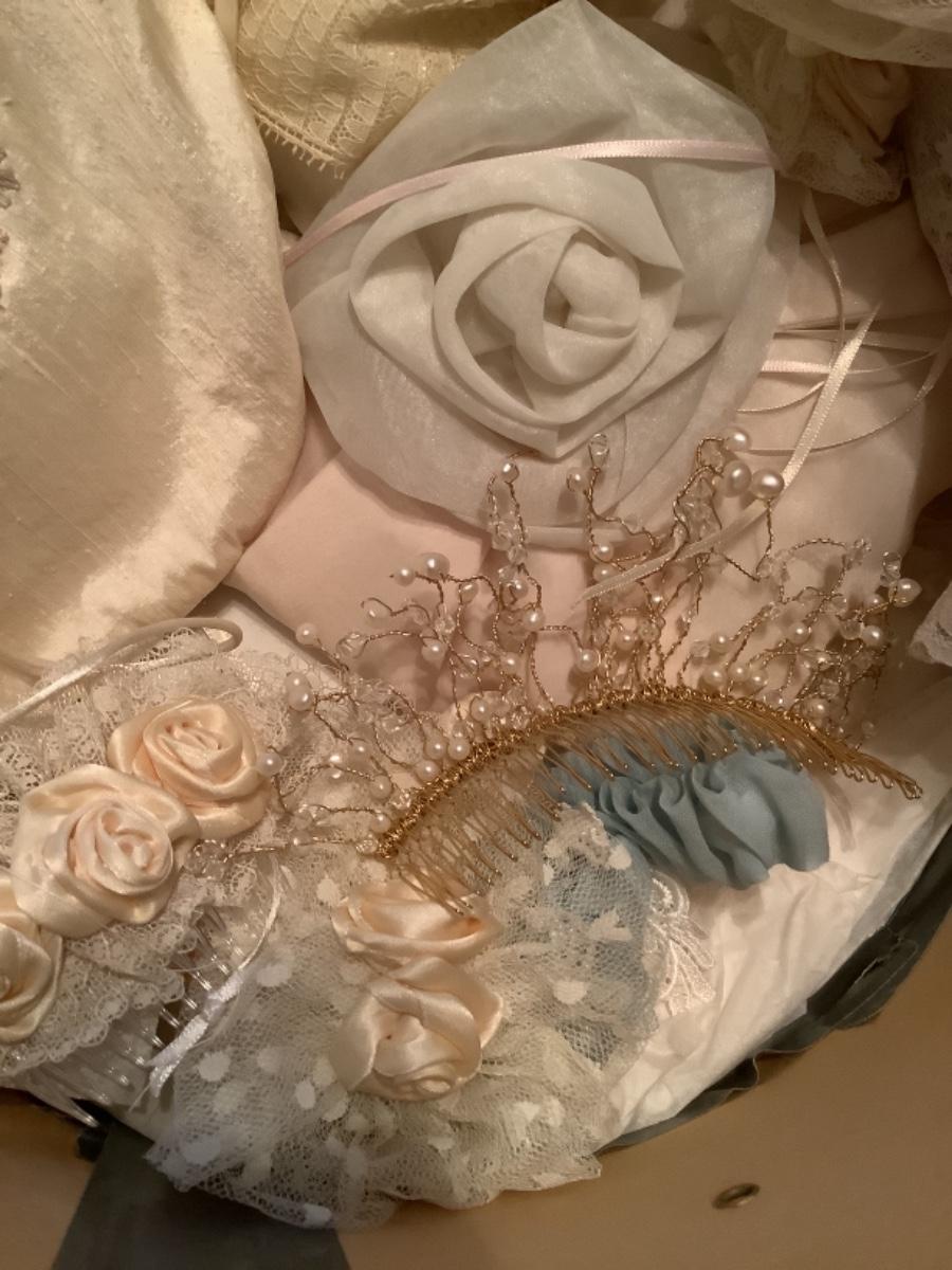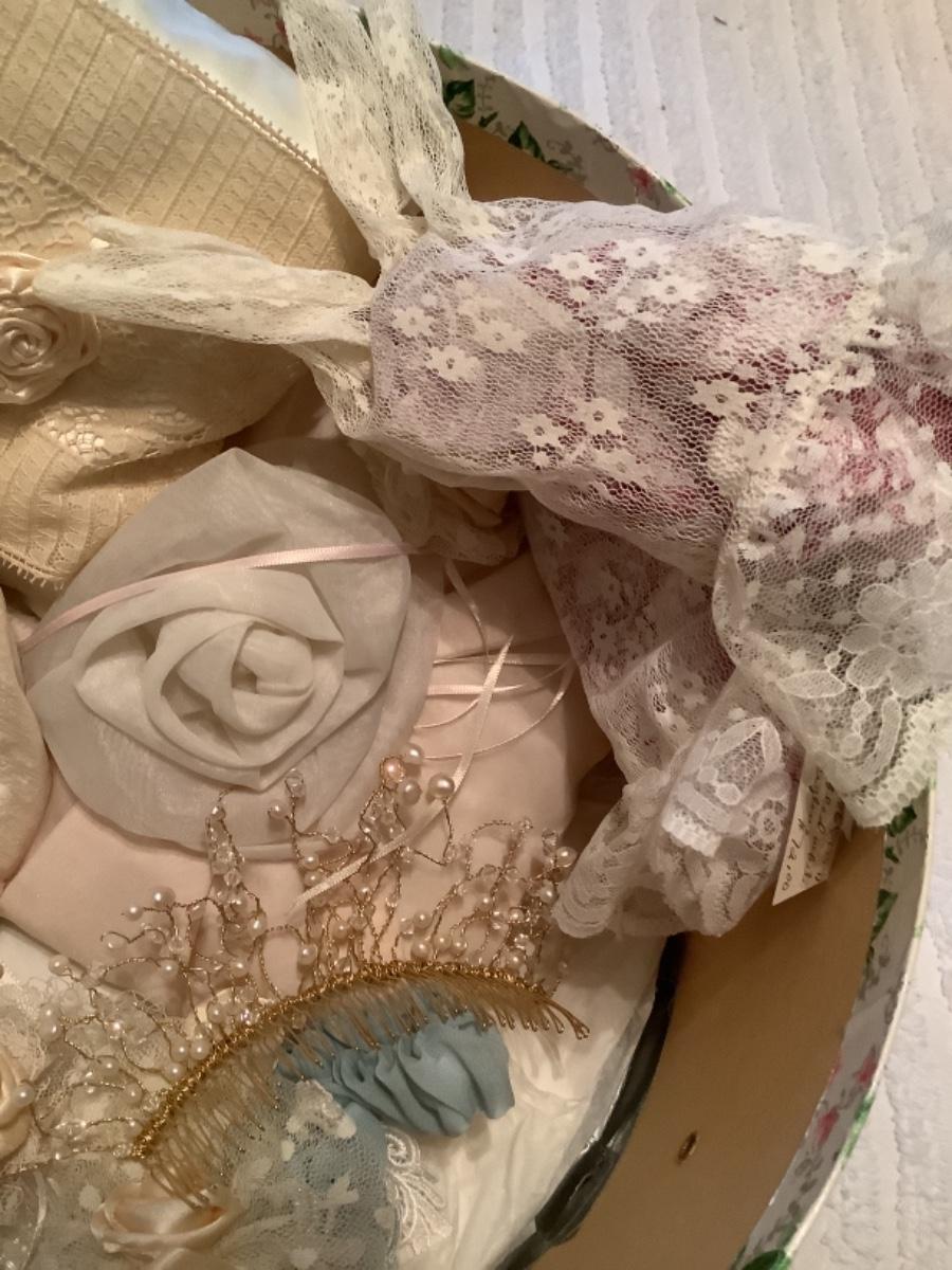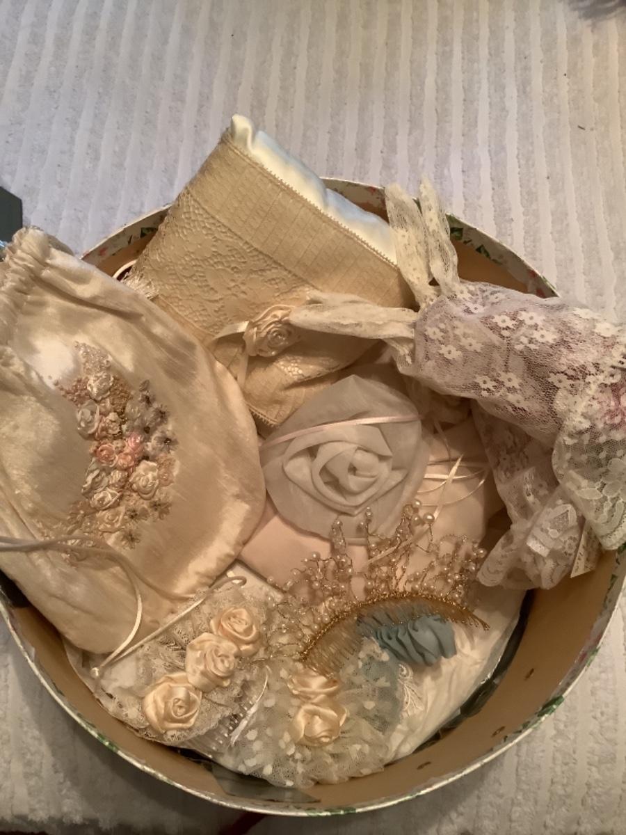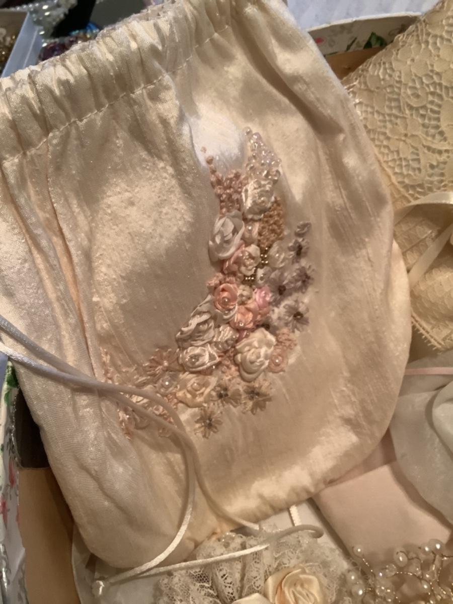 J979 Handmade Satin Purse, Pillow, Lace Gloves, Haircombs
