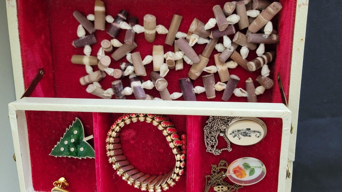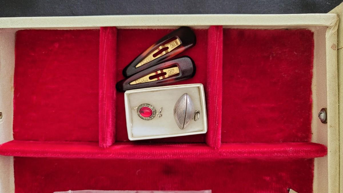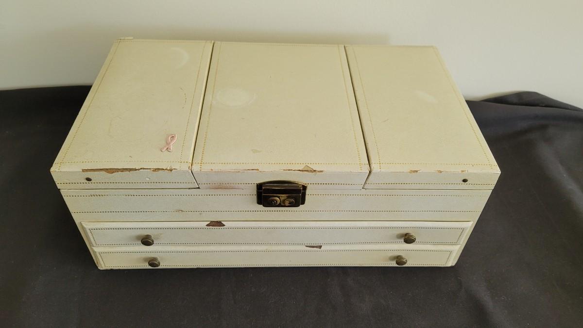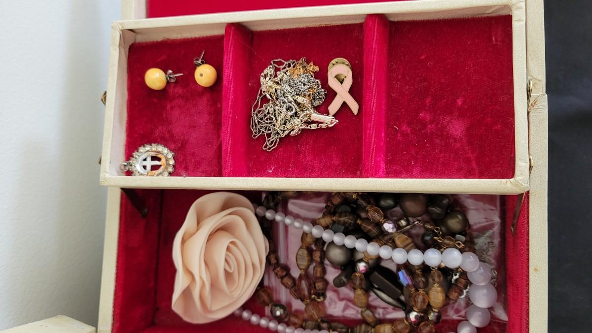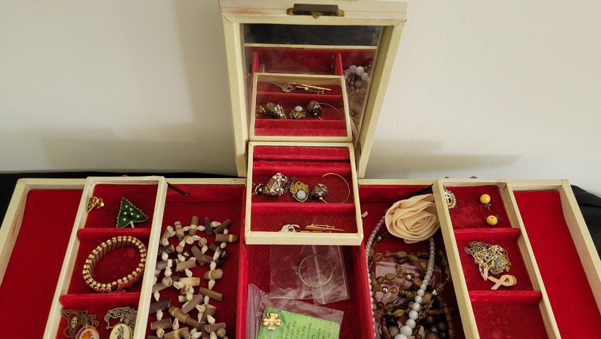 Huge jewelry box and all its contents. Several chains , necklaces and Misc jewelry. Some in Good condition and some need repair or can be used in crafting. The jewelry Box too!