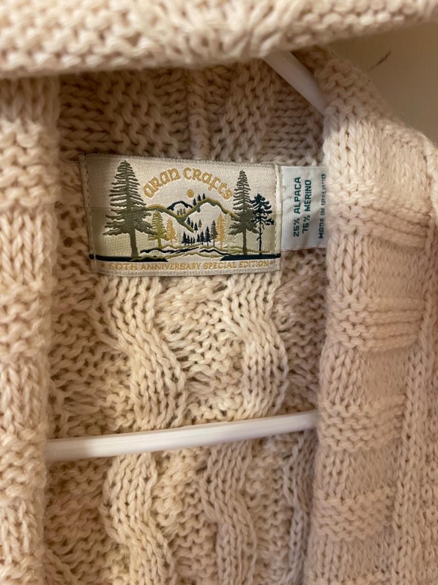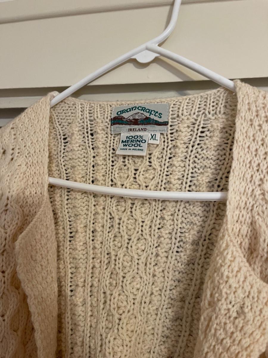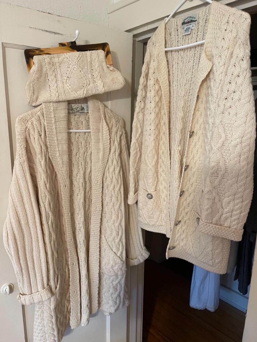 J990 Two Aran crafts Merino Wool Sweaters and Clutch
