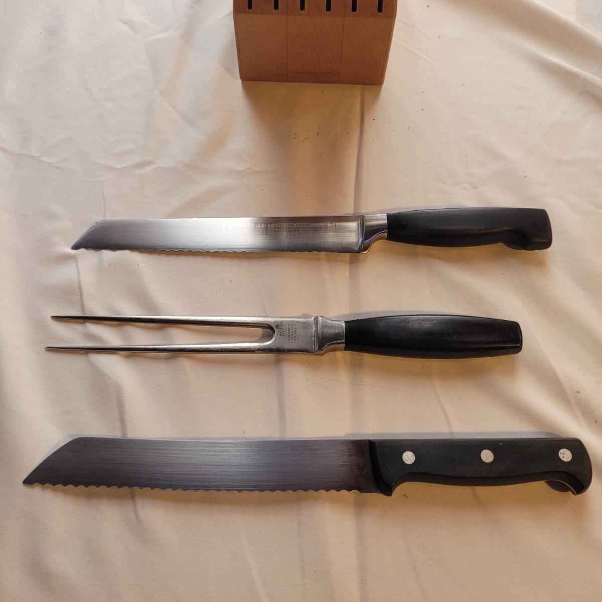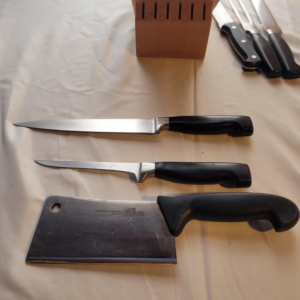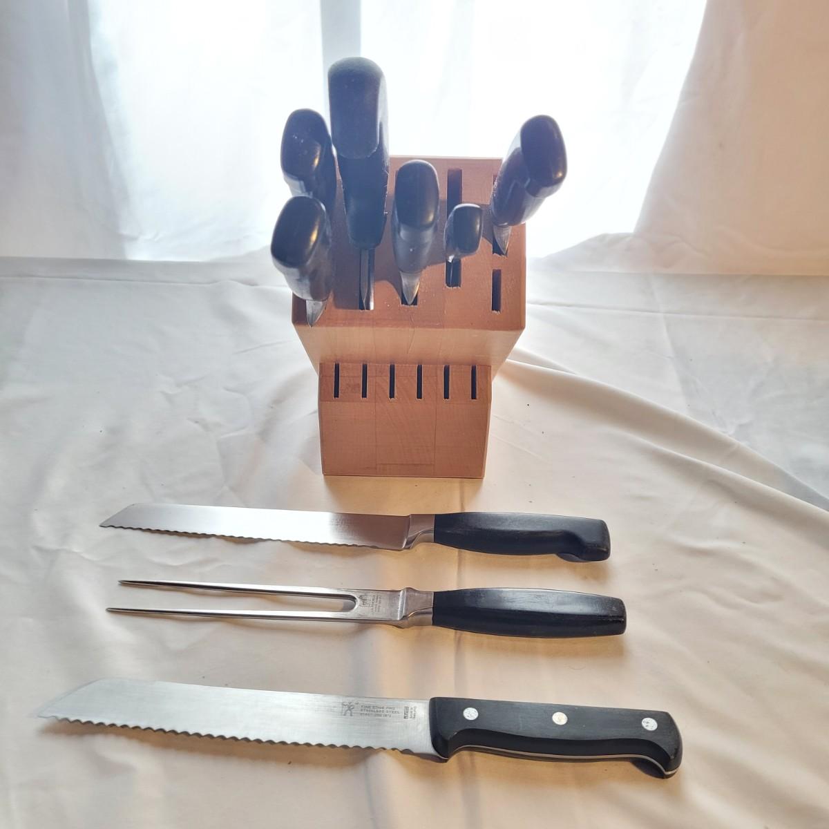 This assortment of cooking knives includes many J.A. Henckel pieces. Varieties include a meat cleaver, serrated knives, meat fork, chef knives and a filet knife. Knife block holds many but not all knives. Shipping available.