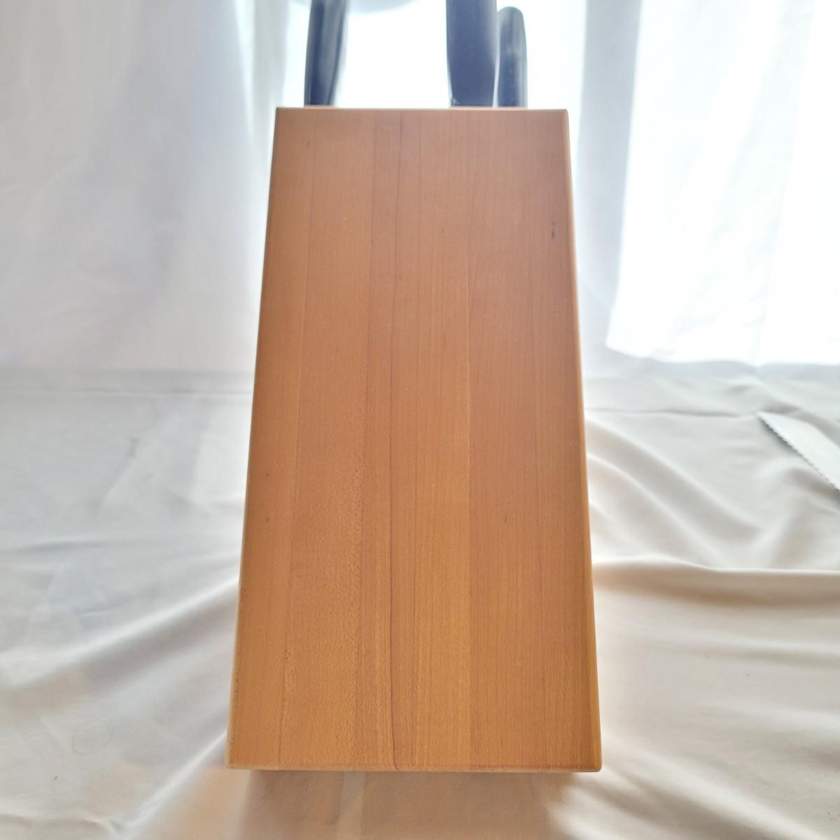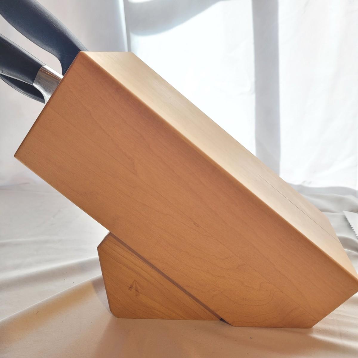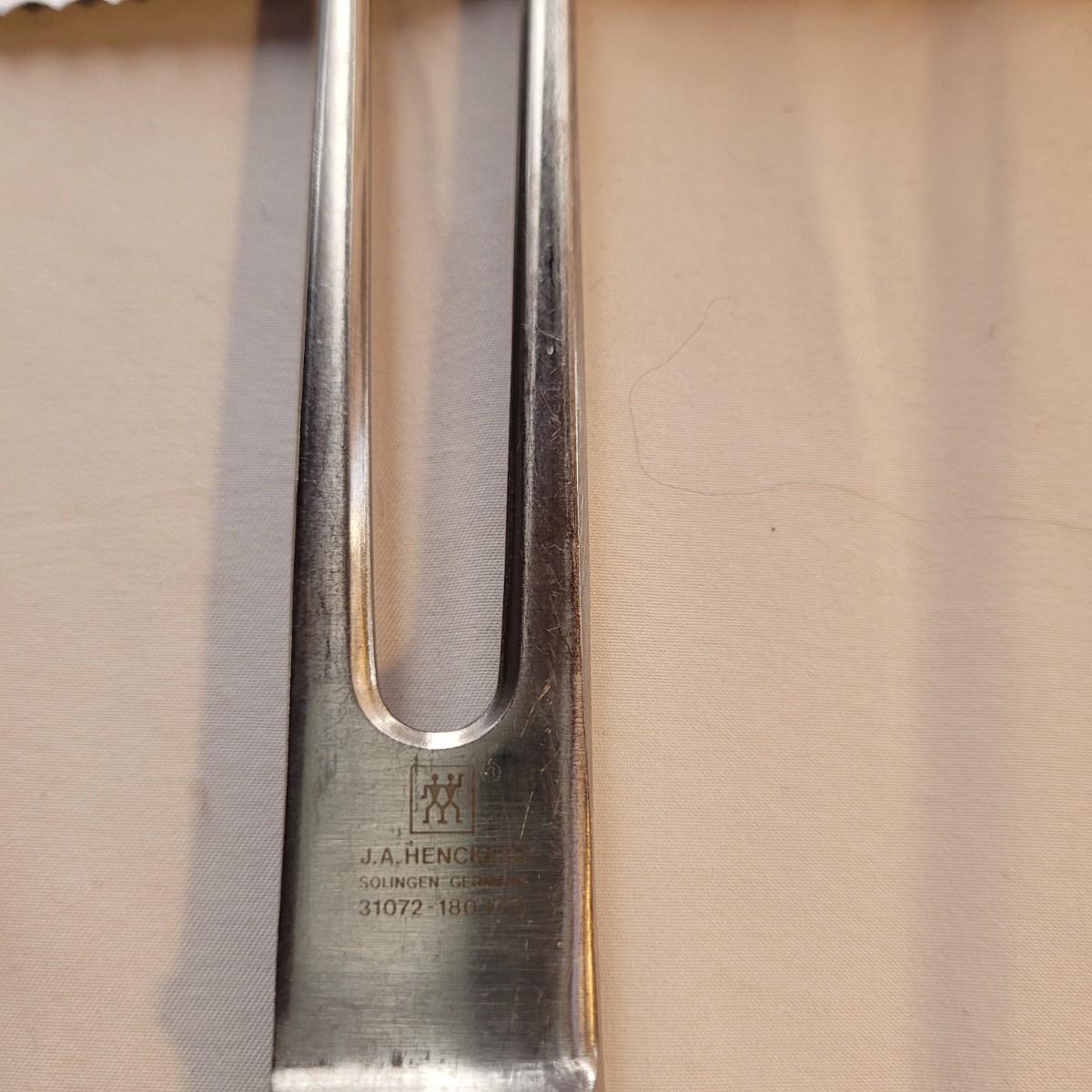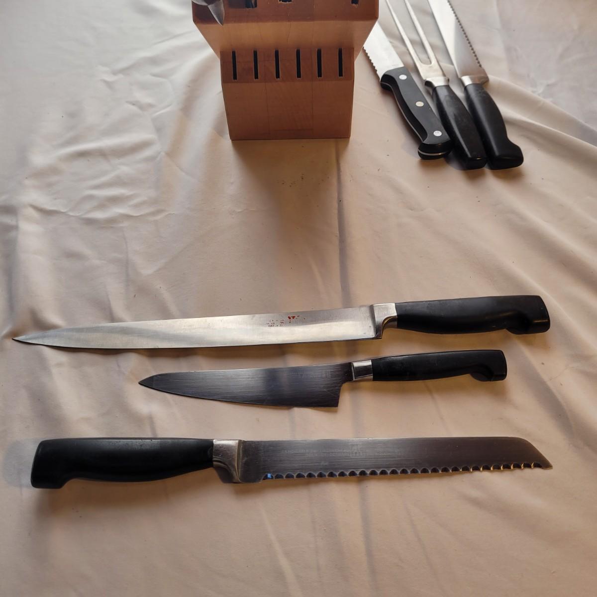 This assortment of cooking knives includes many J.A. Henckel pieces. Varieties include a meat cleaver, serrated knives, meat fork, chef knives and a filet knife. Knife block holds many but not all knives. Shipping available.