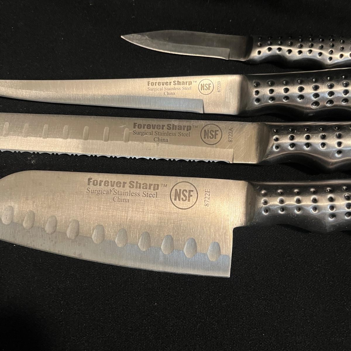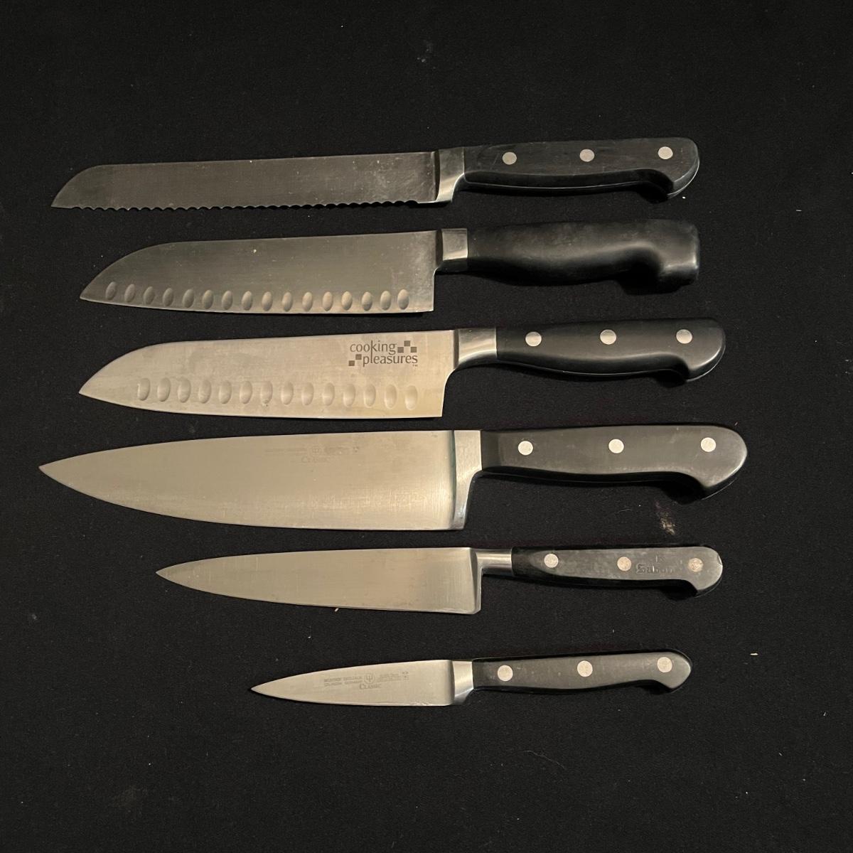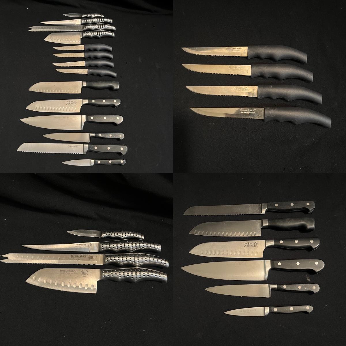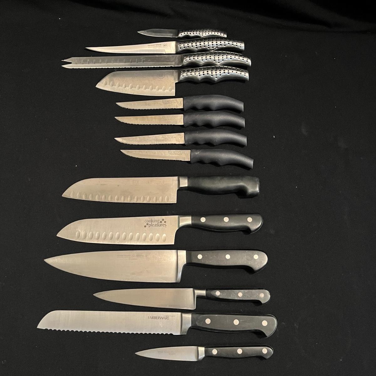 Lot includes eight Forever Sharp knives, J.A. Henckels knife, Wusthof Driezack knives and more. Longest knife measures 13” total.