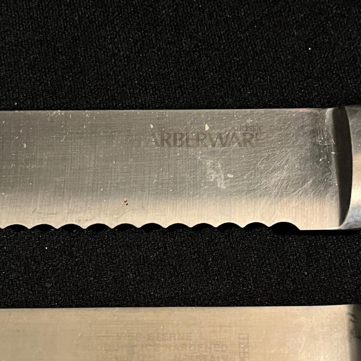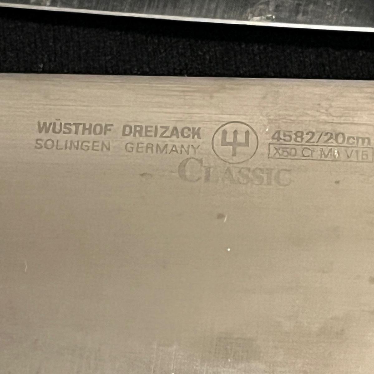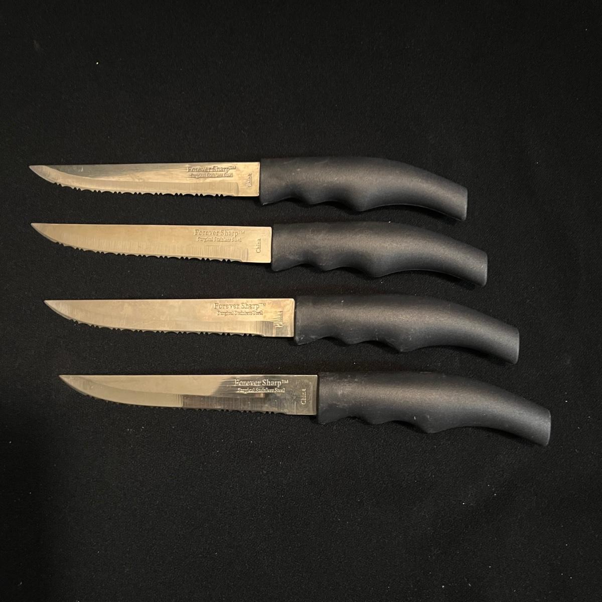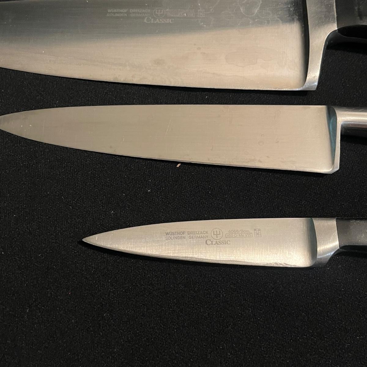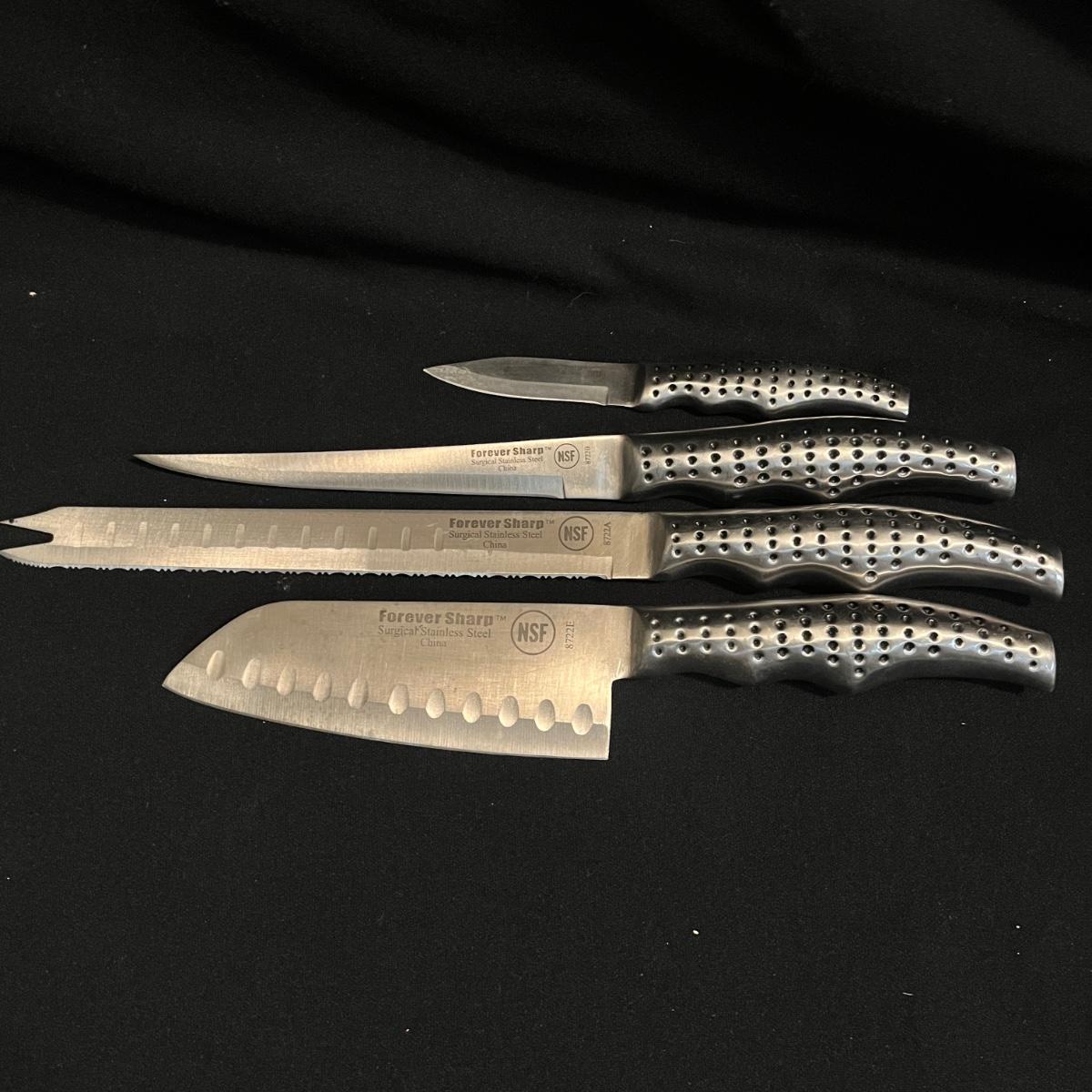 Lot includes eight Forever Sharp knives, J.A. Henckels knife, Wusthof Driezack knives and more. Longest knife measures 13” total.