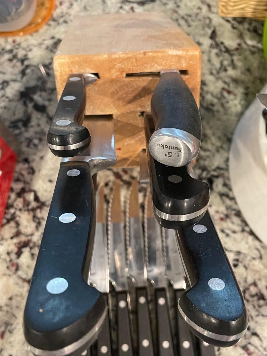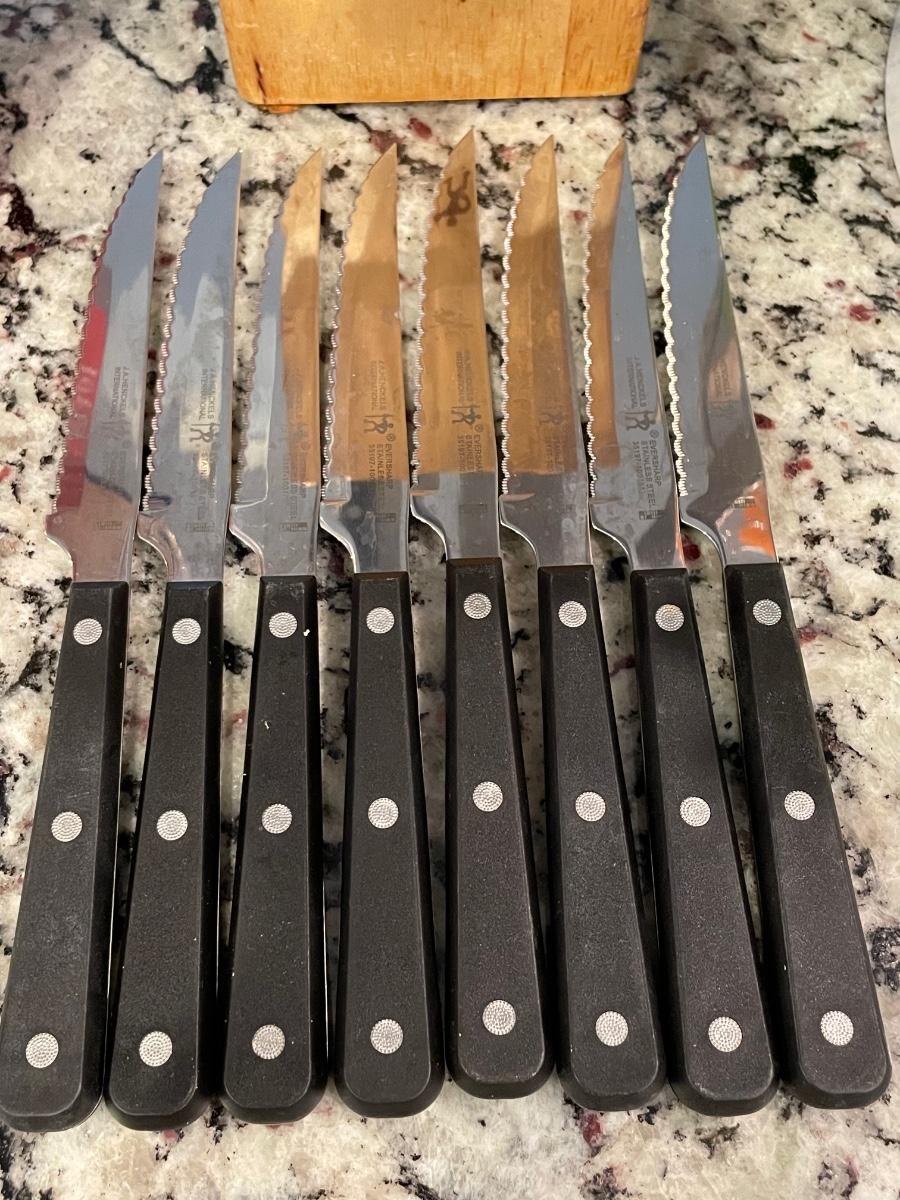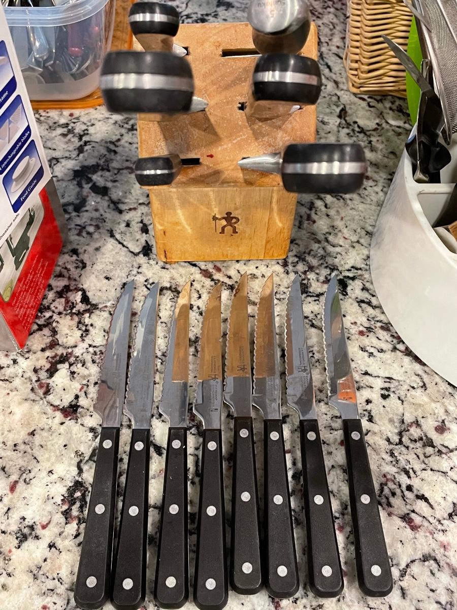 J.A. HENCKELS INTERNATIONAL SET OF 8 STEAK KNIVES , 6 kitchen knives and knife block