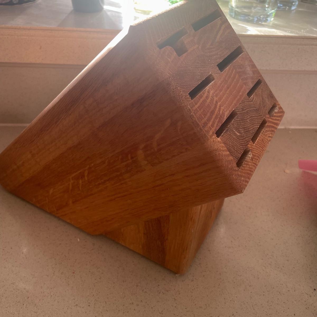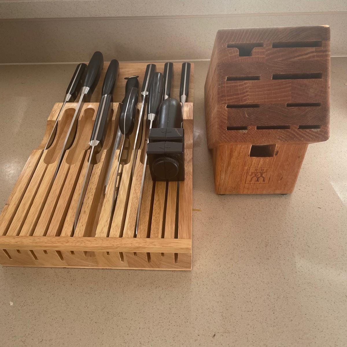 Ten knives, two knife sharpeners, a knife block and a wooden storage/organizer are included here.
