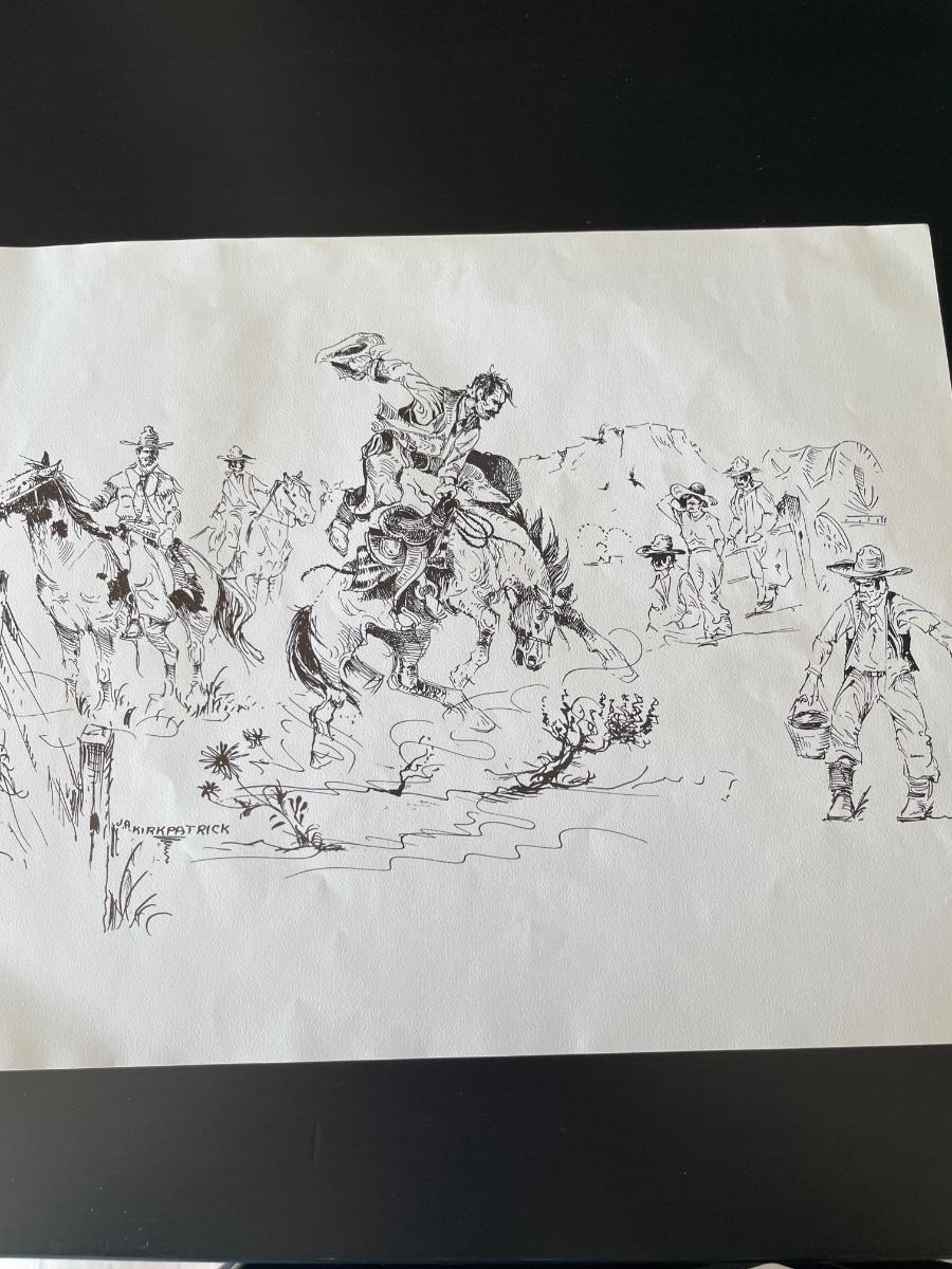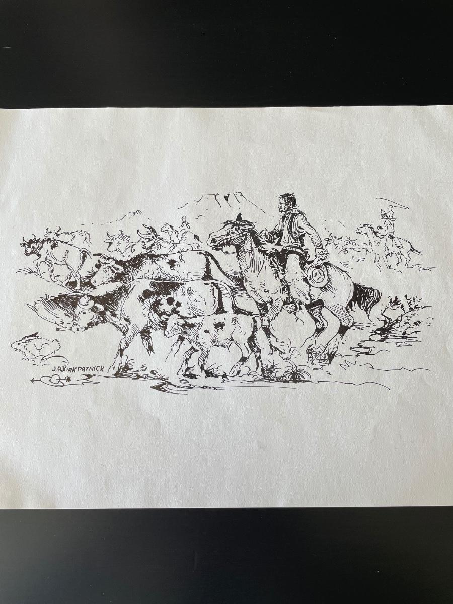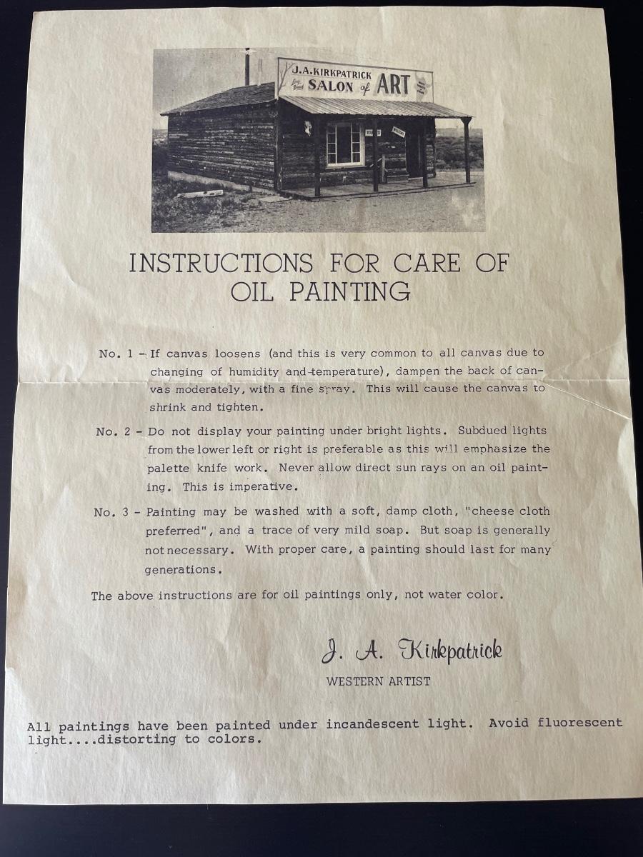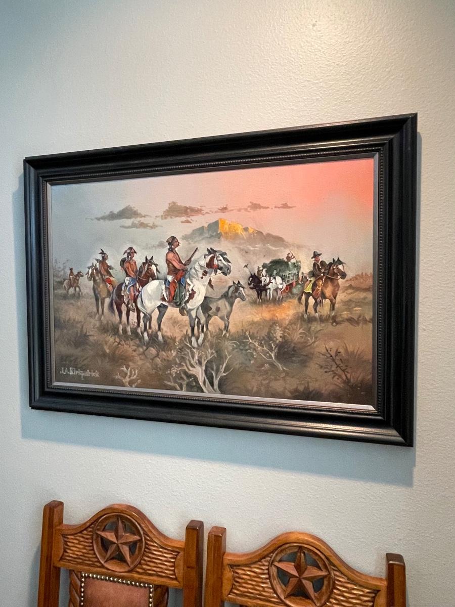 JA Kirkpatrick original oil painting from the 1970’s. Measures 40” by 28” in the frame. Excellent condition and professionally framed. Comes with 13 unique prints that measure 9 by 11.5” and artist information.