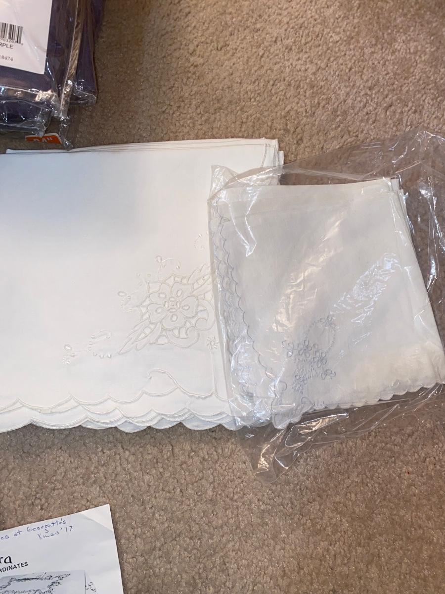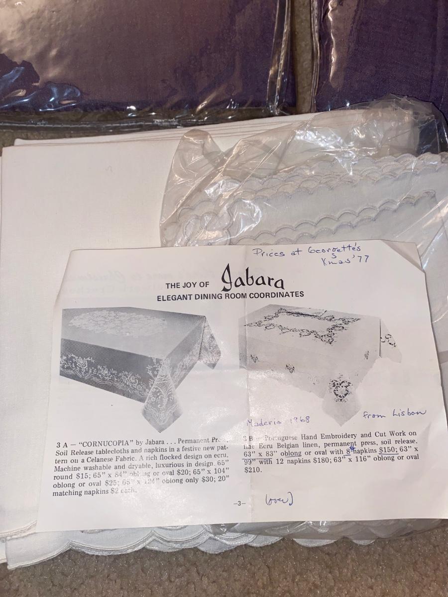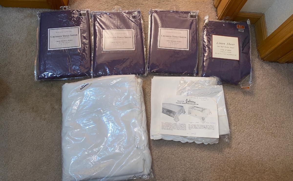 NEW JABRA TABLECLOTH AND MATCHING NAPKINS, ALONG WITH WINDOW SHEERS