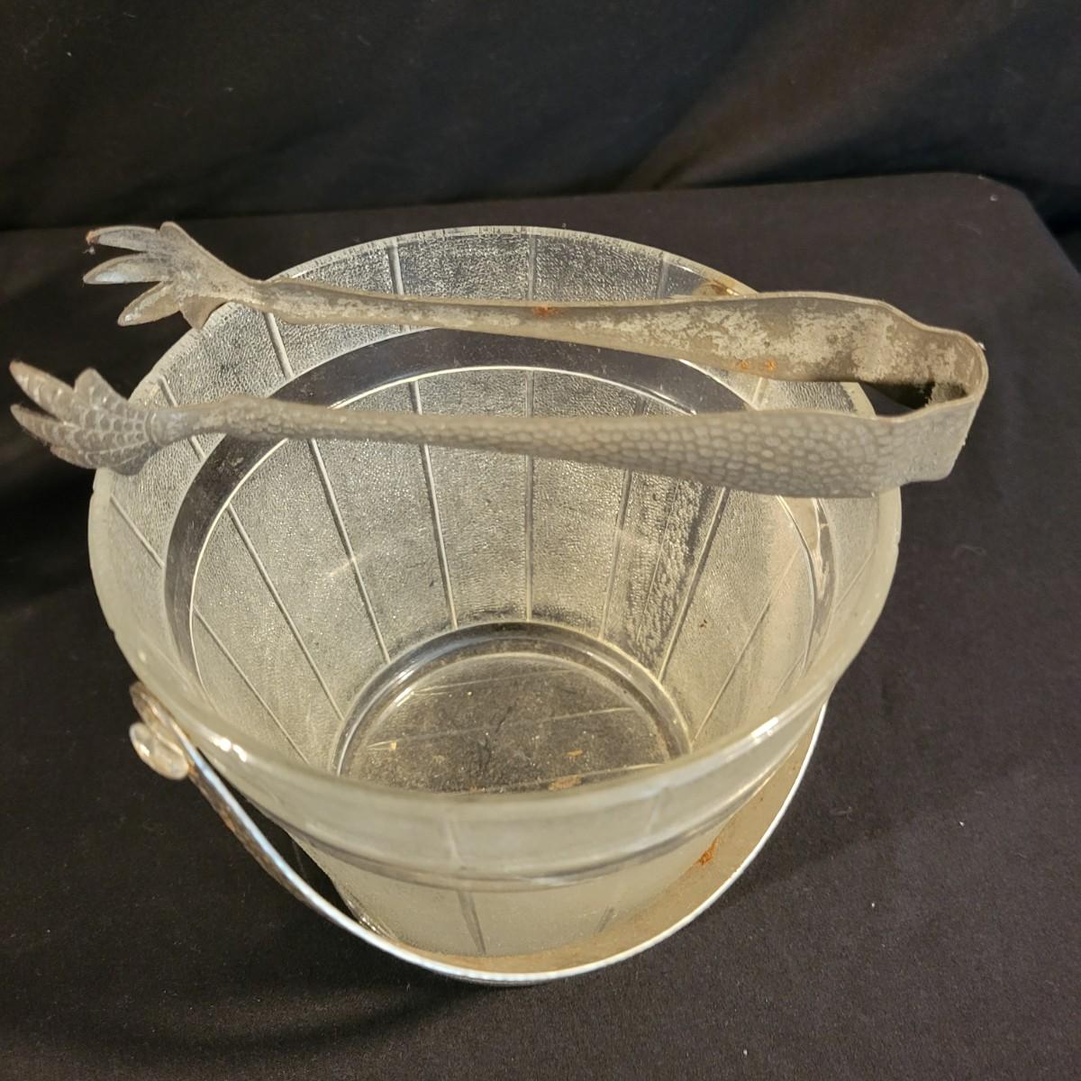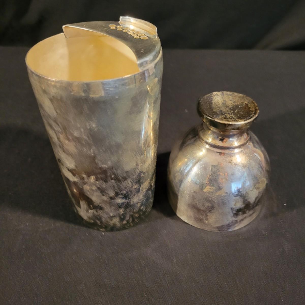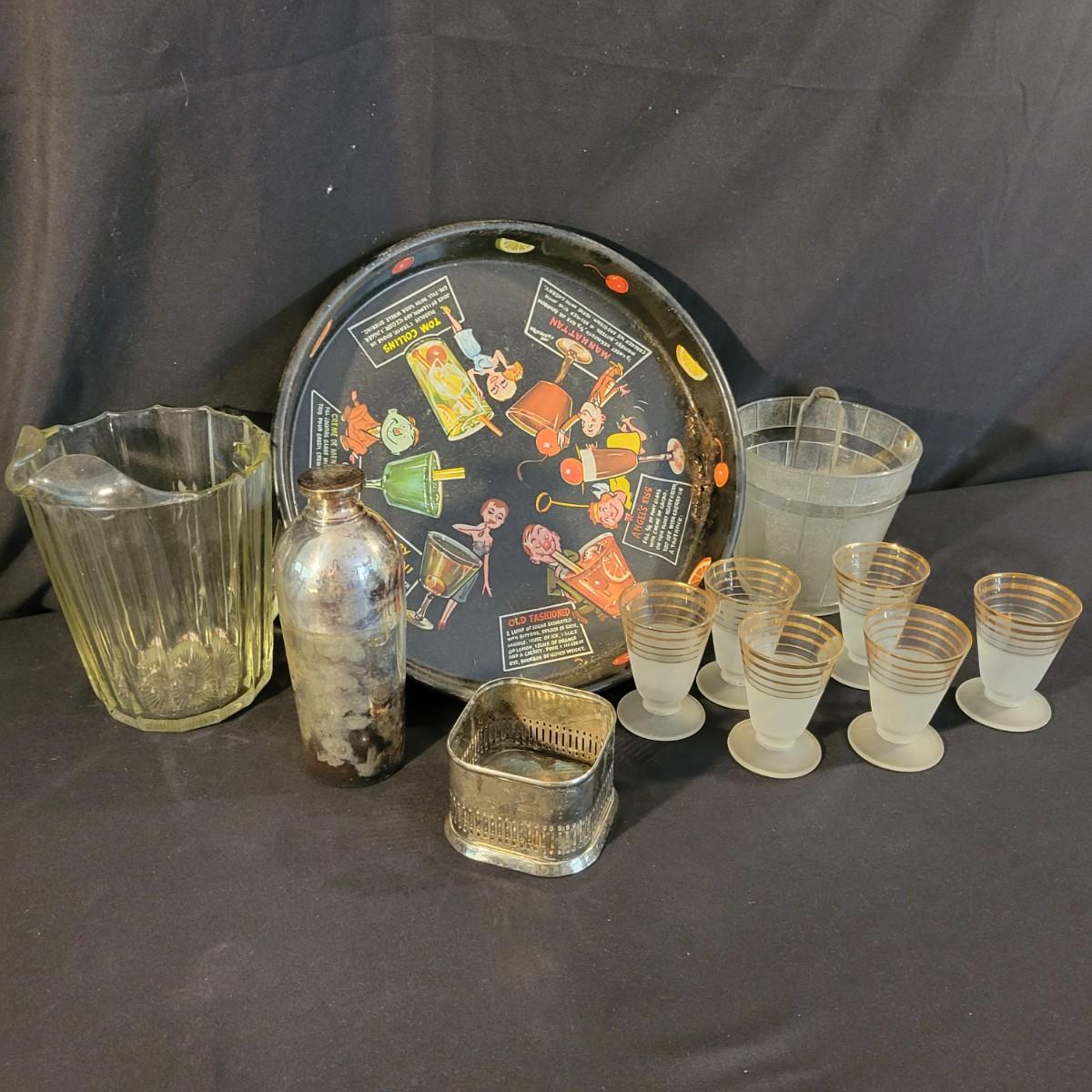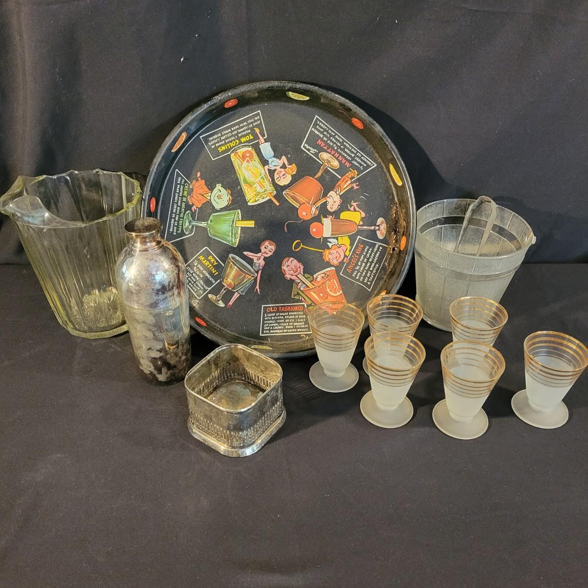 A silver plated Jack Daniel bottle coaster, 6 small gold rimmed glasses, a glass ice bucket and tongs, glass beer mug/pitcher, cool serving tray made of metal and what appears to be a plated silver bar shaker. Shipping available.