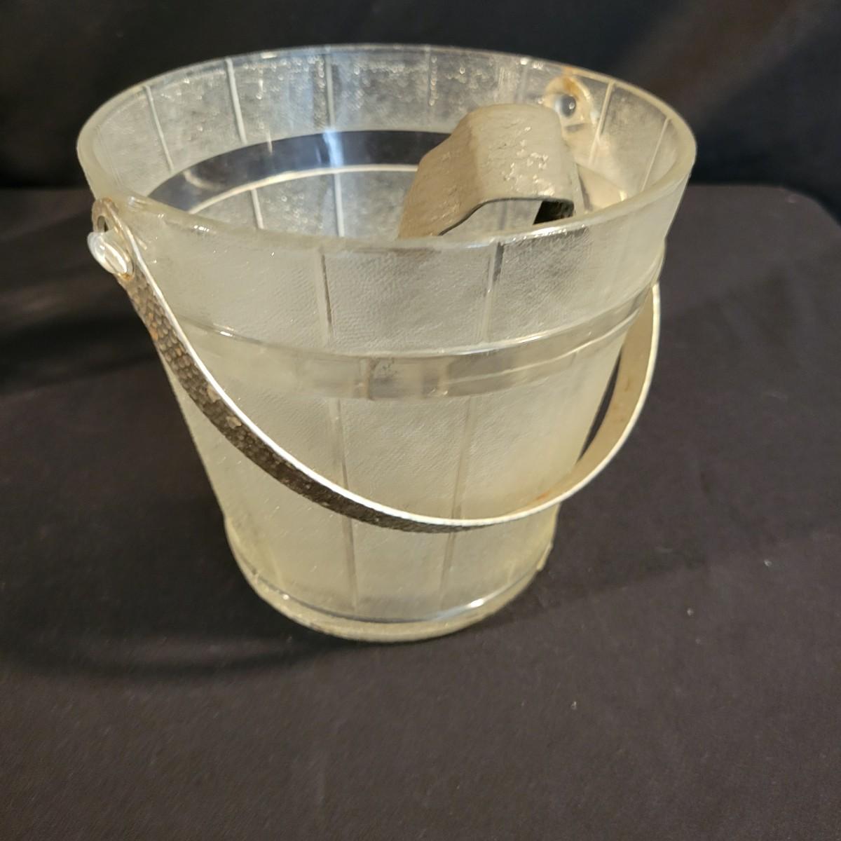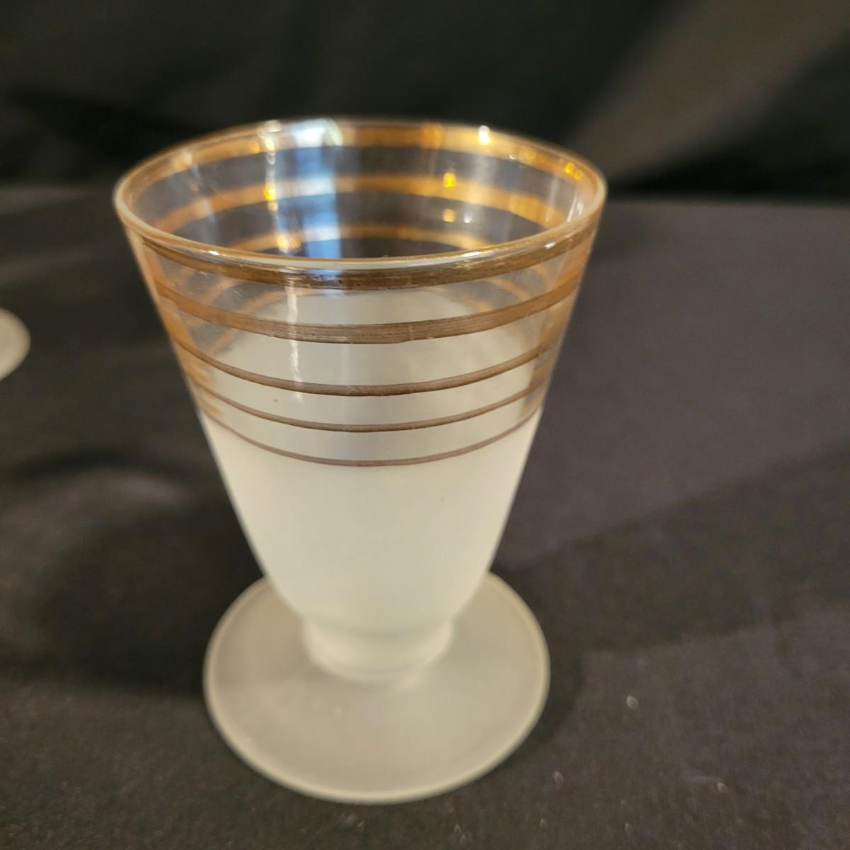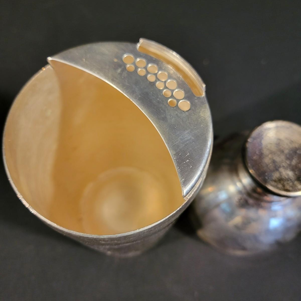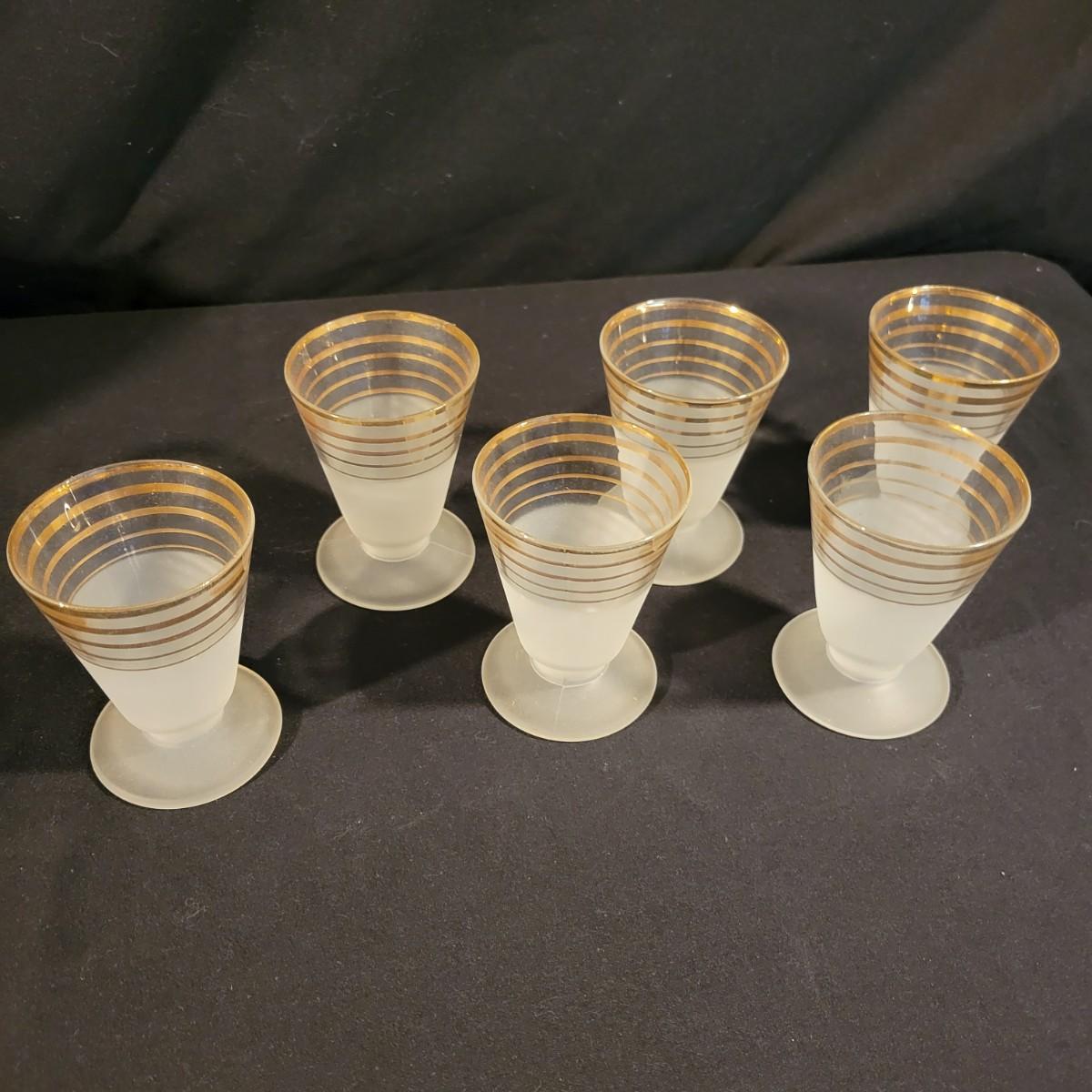 A silver plated Jack Daniel bottle coaster, 6 small gold rimmed glasses, a glass ice bucket and tongs, glass beer mug/pitcher, cool serving tray made of metal and what appears to be a plated silver bar shaker. Shipping available.